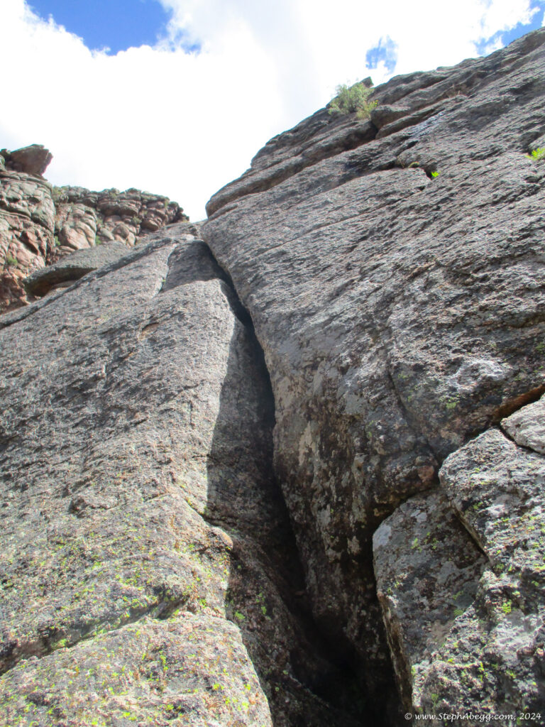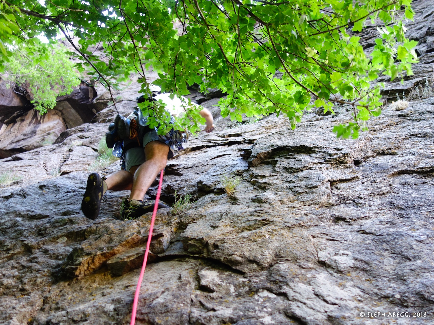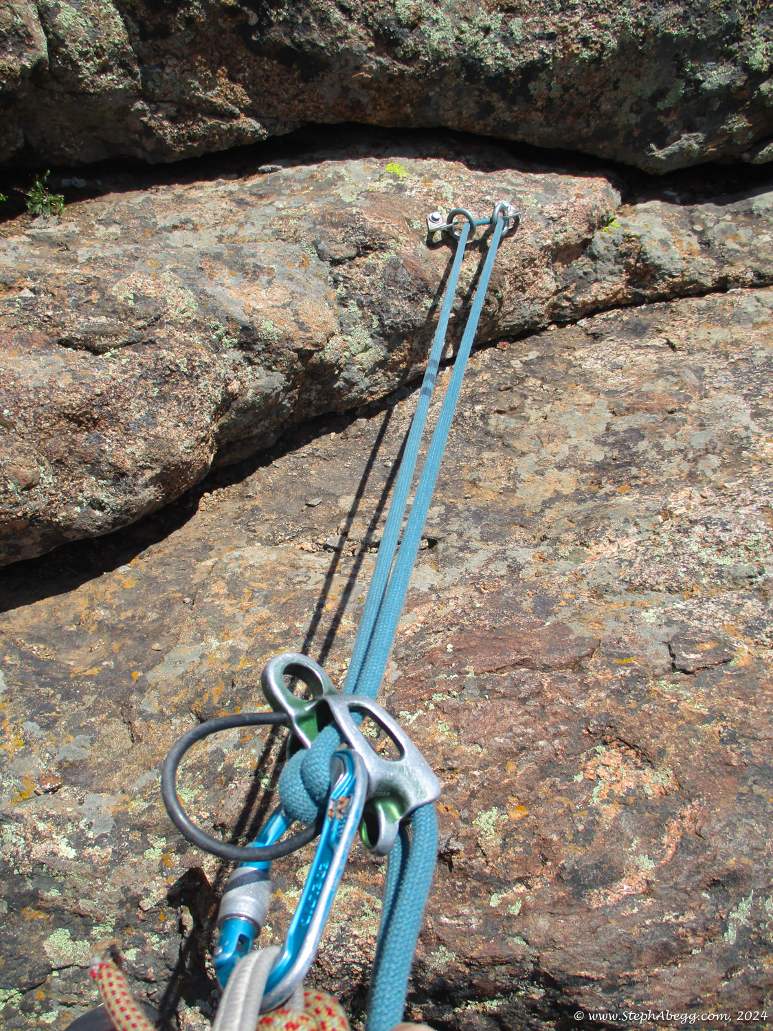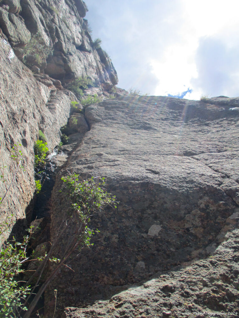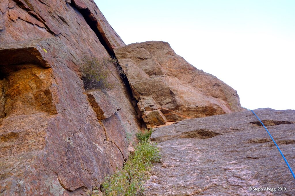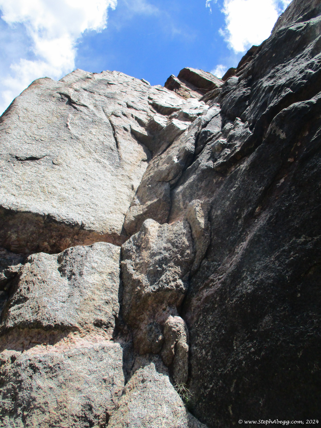 Routes on Newberry's Slabs require a linkup with another climb to reach the rim (unless you want to ascend Cruise Gully). A great 11-pitch 5.9 link-up is Newberry's Delight to Maiden Voyage to King Me (which is what we did).