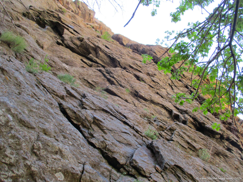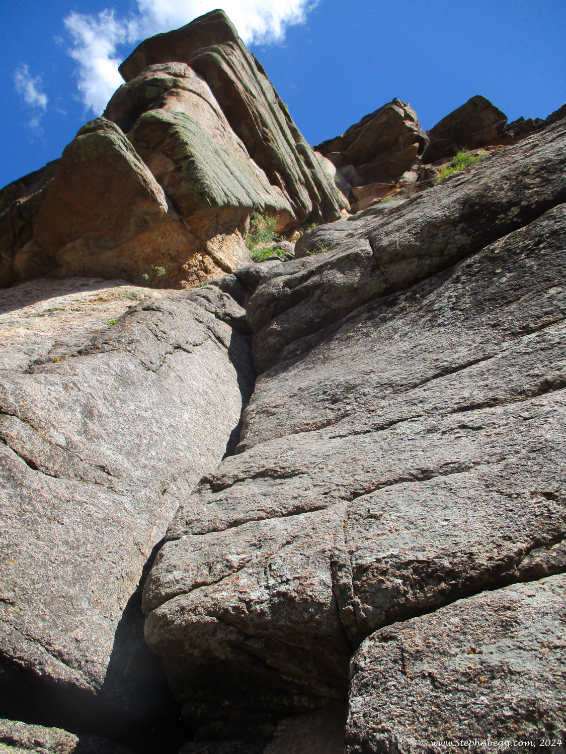 Move up and left through broken crack and face climbing to reach a ledge. Move right and located a short, left-leaning finger crack that leads to another ledge. Move right onto slabs, ending at a stance below a left-leaning finger-to-handcrack. This is a rope-stretching pitch.