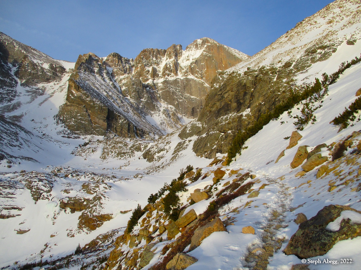 I'd been studying hard for an upcoming thermodynamics final exam, so I decided to take a morning study break. I left the Longs Peak trailhead in the morning darkness, hiked to and over the frozen Chasm Lake, cramponned up Camel Gully, tagged the summit of