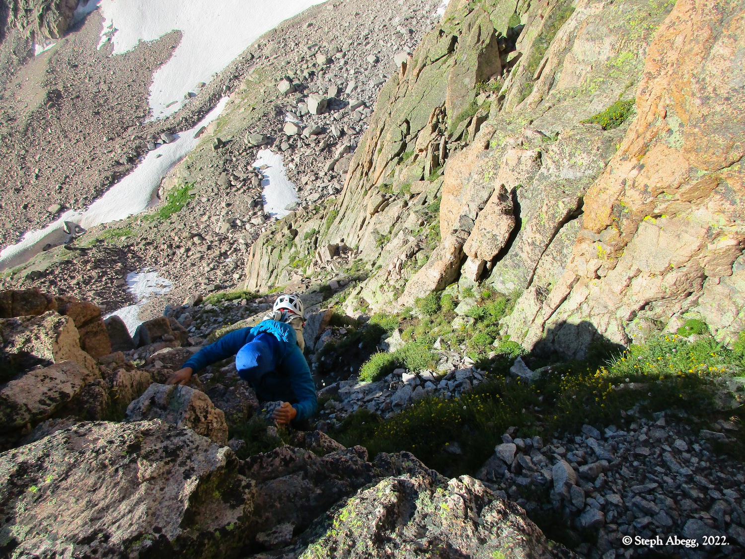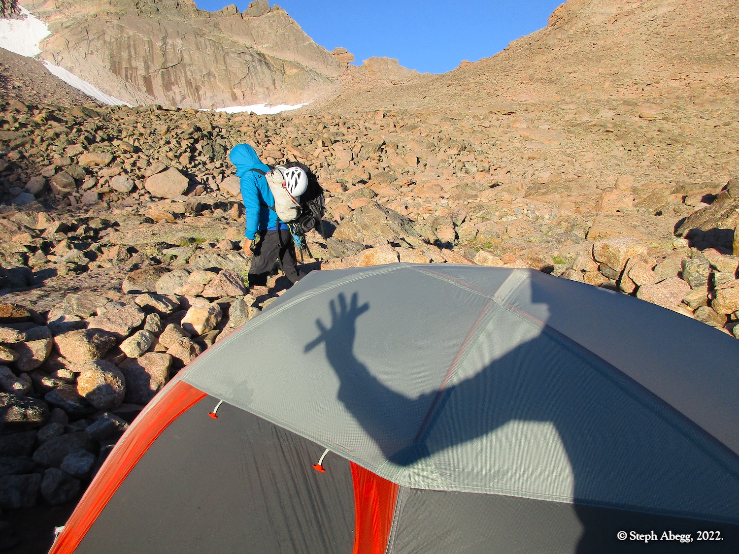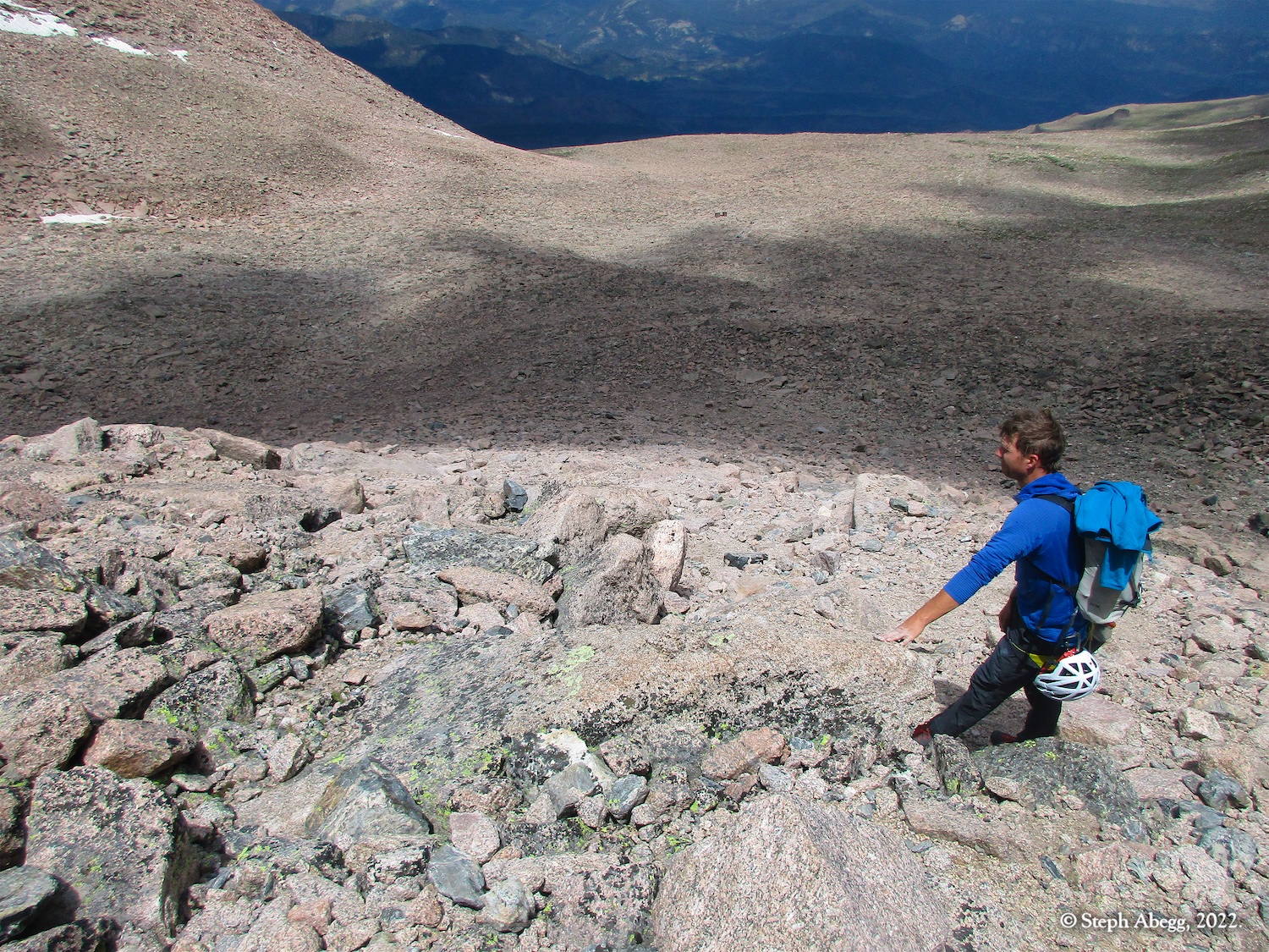 The approach depends on where you start. It is probably most common to start from the Longs Peak Trailhead: Starting from the Longs Peak Trailhead, hike up to Chasm Lake and from there to the base of Chasm View Wall. However, on this trip Nate and I started from the Boulderfield, since that is where we were camping: Starting from the Boulderfield, hike to the ridge connecting Mt. Lady Washington to Chasm View. Either descend the