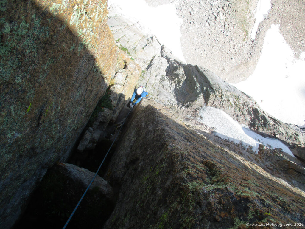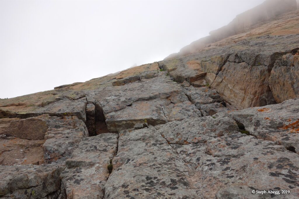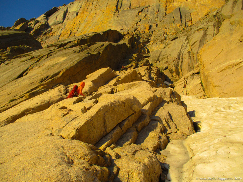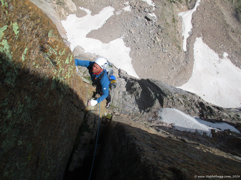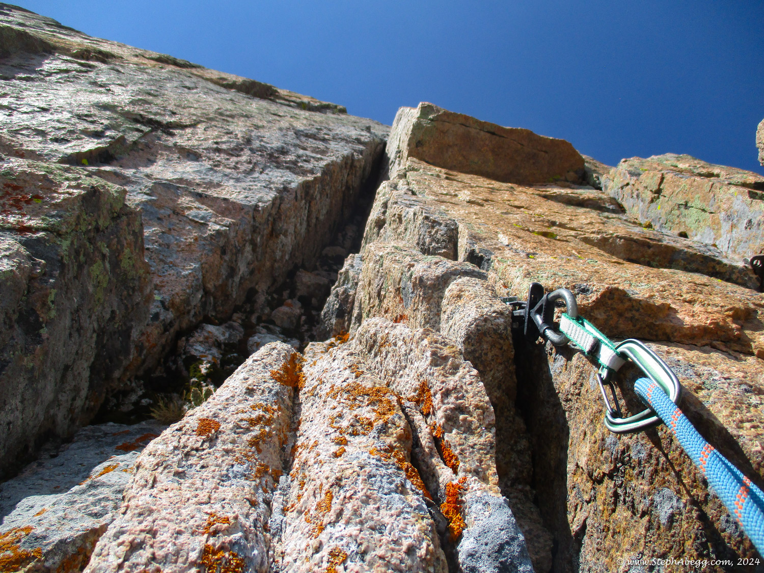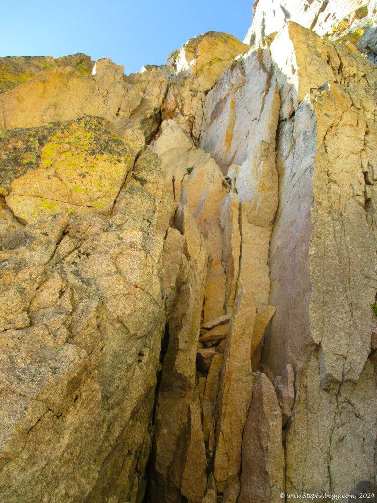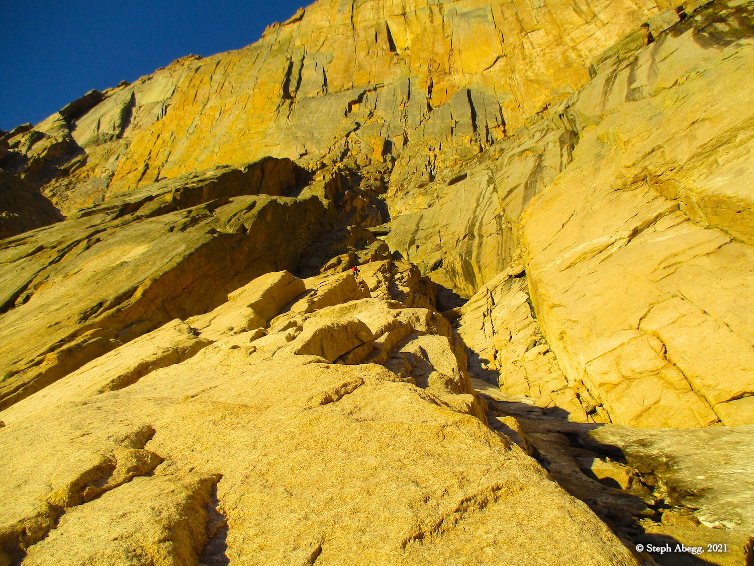 Black Dagger route is named for and climbs through the deep, 100-foot long, dagger-shaped chimney that starts a few hundred feet above the base of the Diamond and ends half a pitch from Almost Table Ledge. To get there, you can climb either the first three pitches of