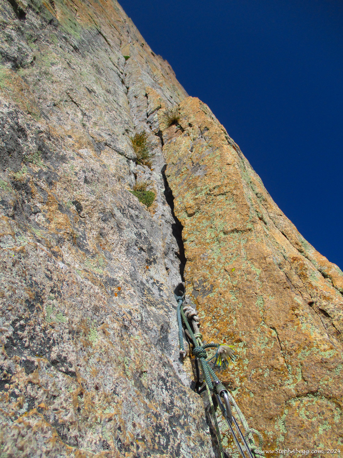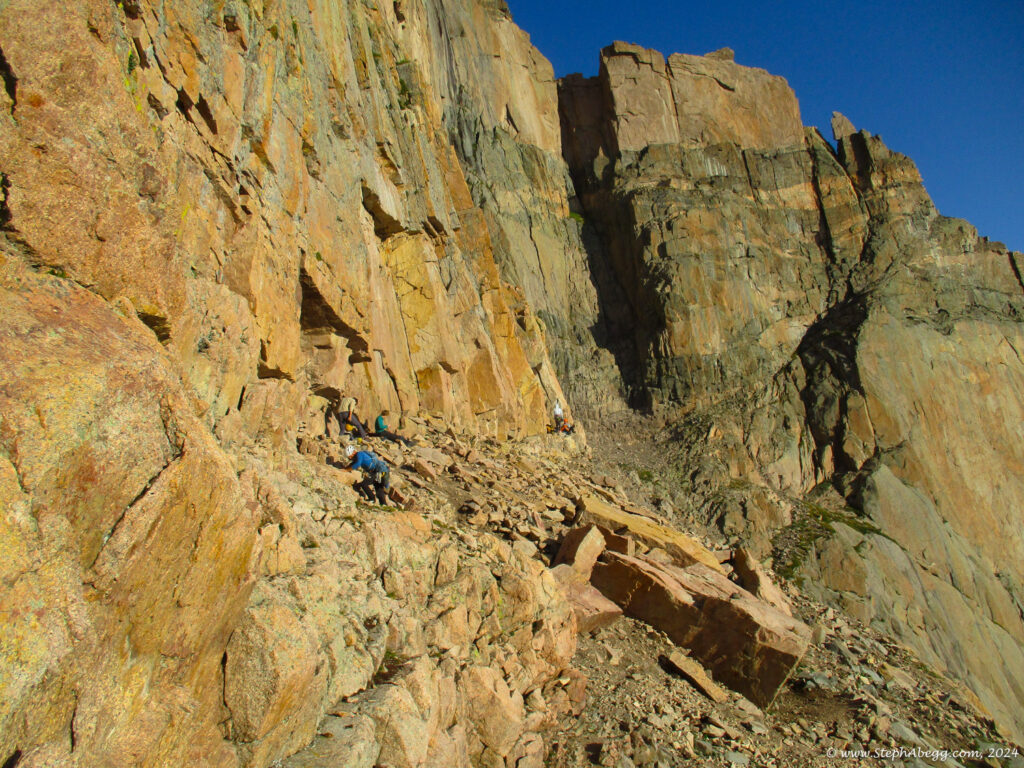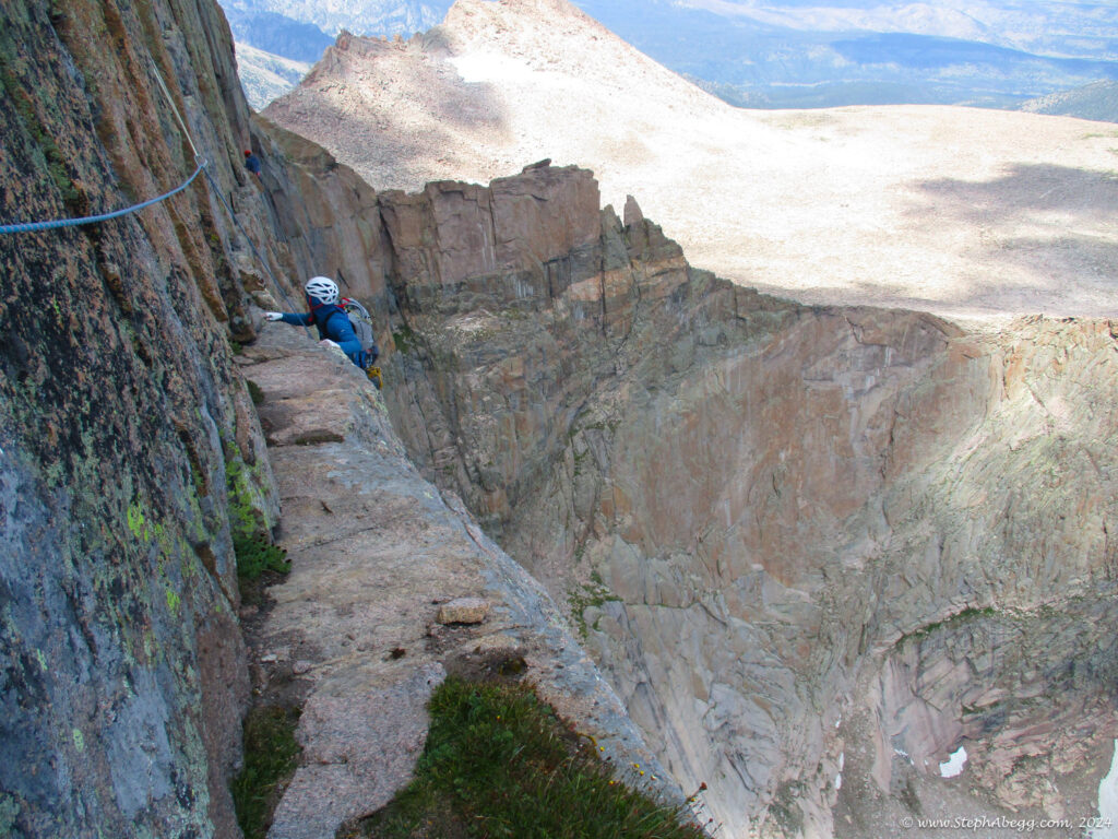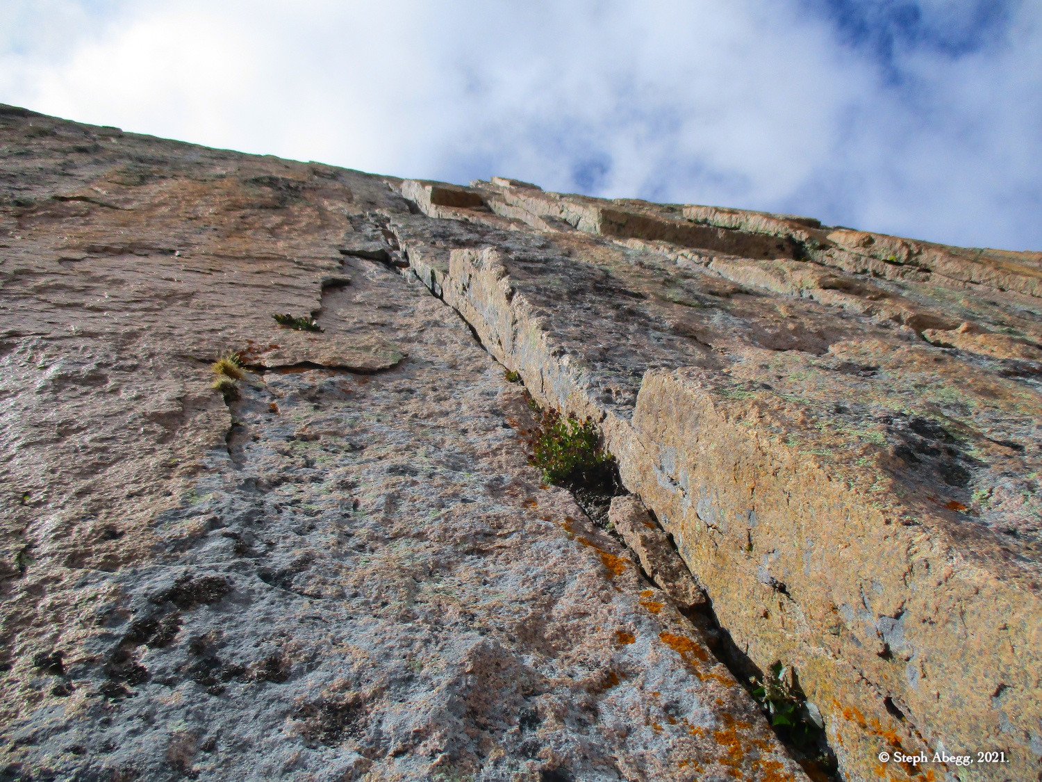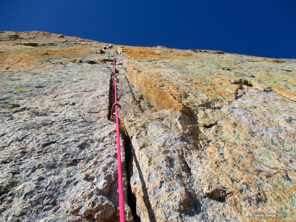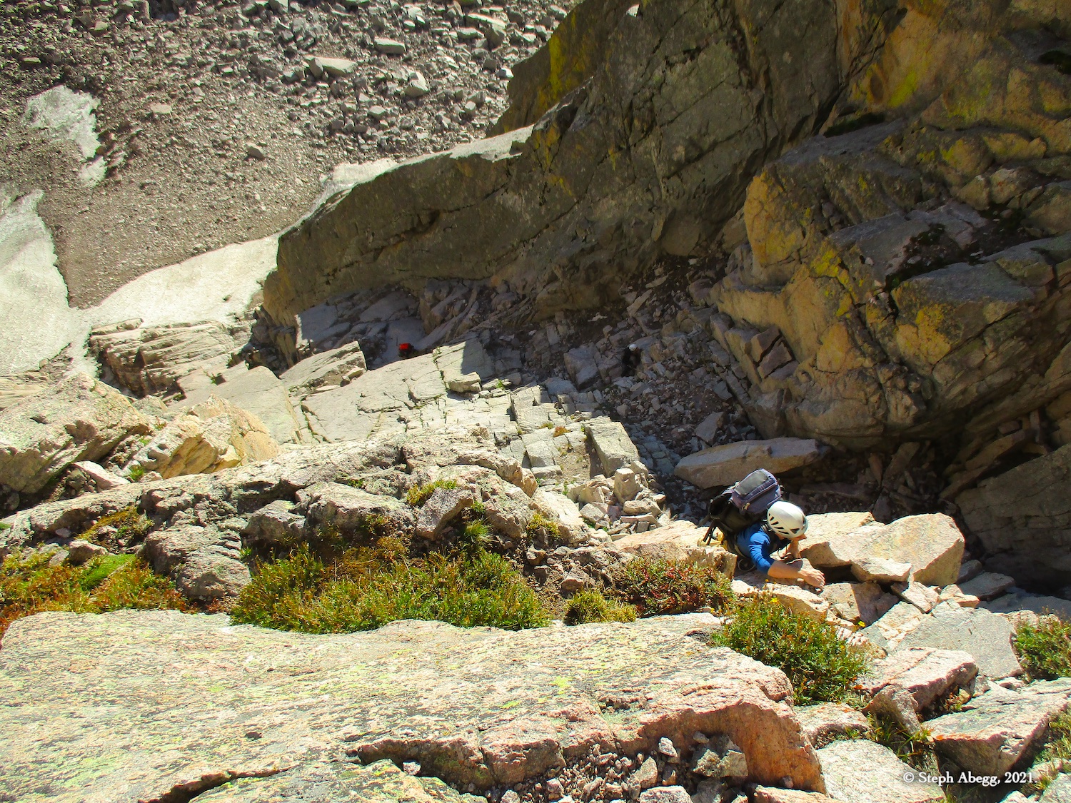Black Dagger route is named for and climbs through the deep, 100-foot long, dagger-shaped chimney that starts a few hundred feet above the base of the Diamond and ends half a pitch from Almost Table Ledge. To get there, you can climb either the first three pitches of