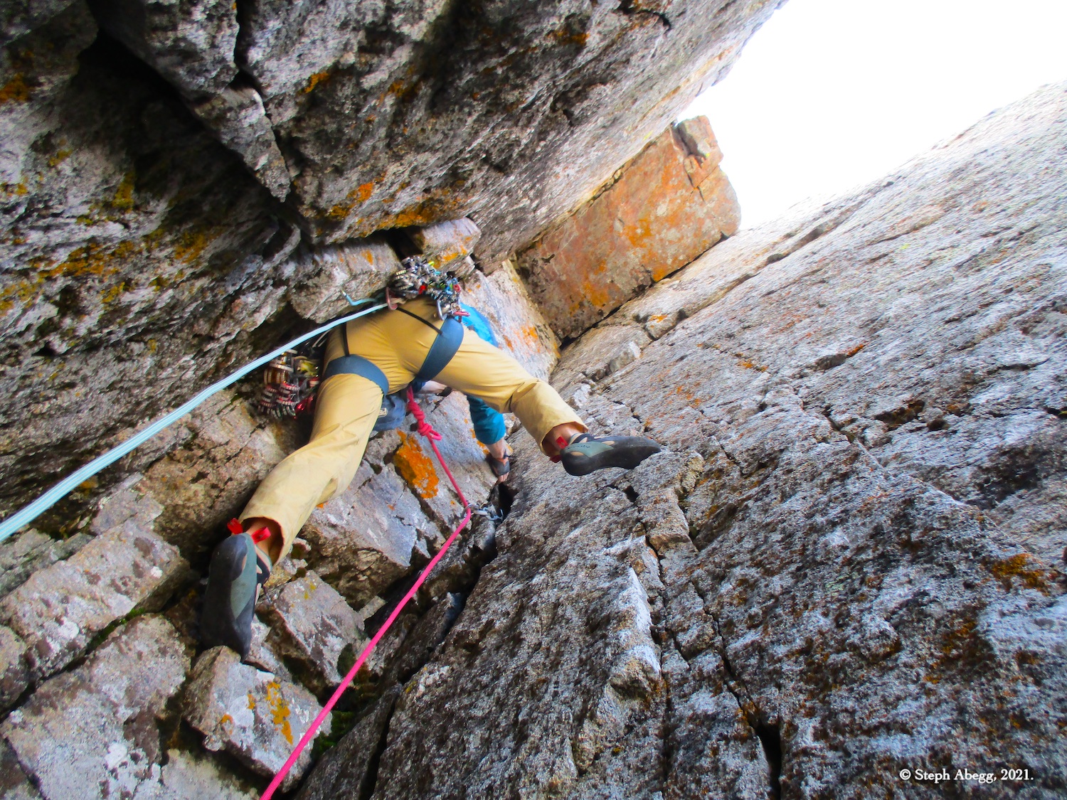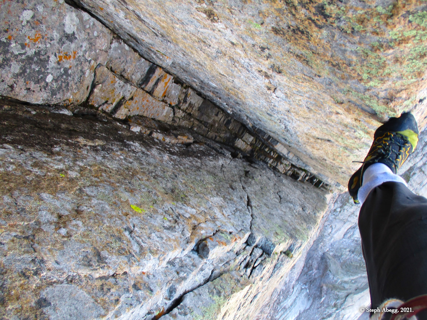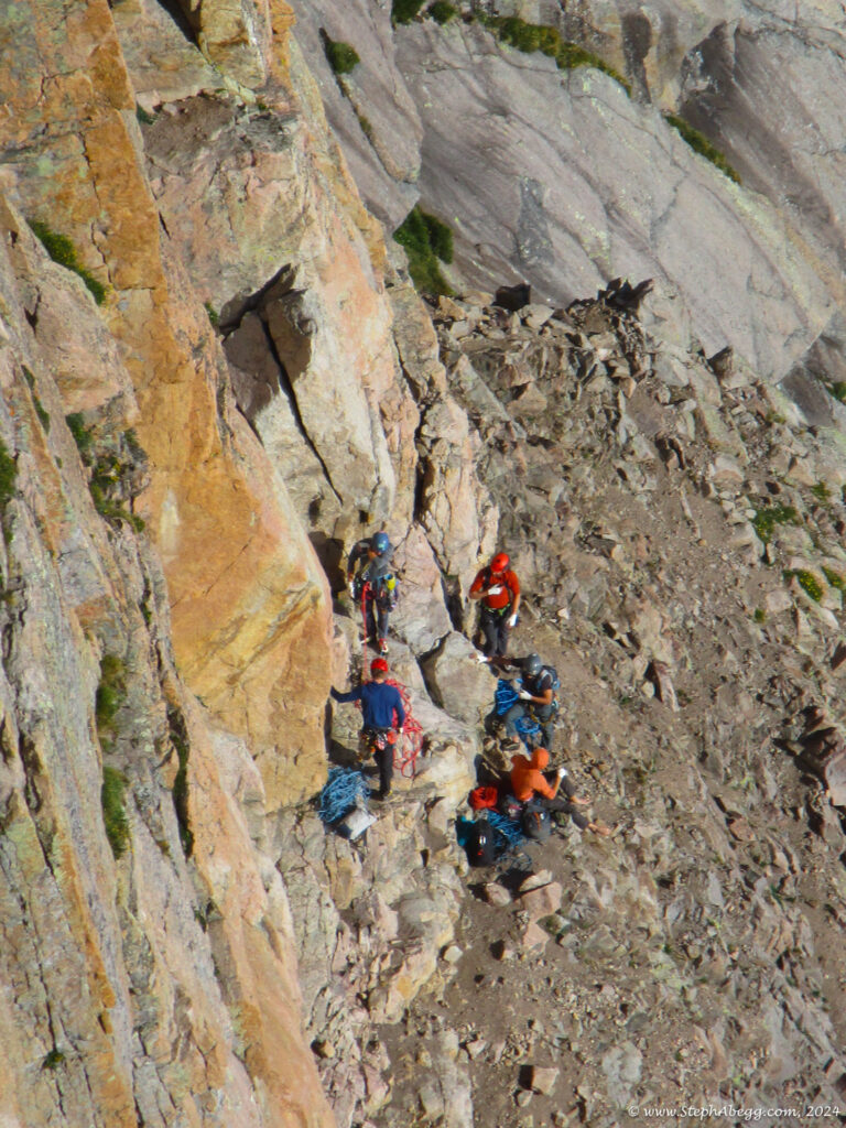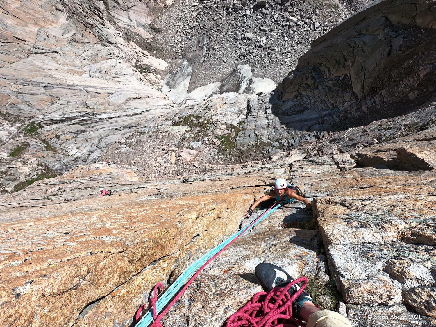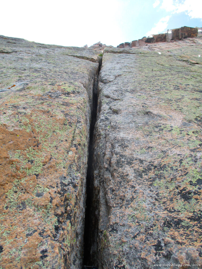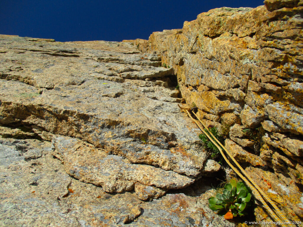 Black Dagger route is named for and climbs through the deep, 100-foot long, dagger-shaped chimney that starts a few hundred feet above the base of the Diamond and ends half a pitch from Almost Table Ledge. To get there, you can climb either the first three pitches of