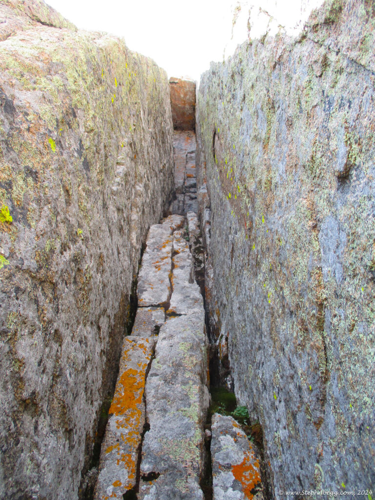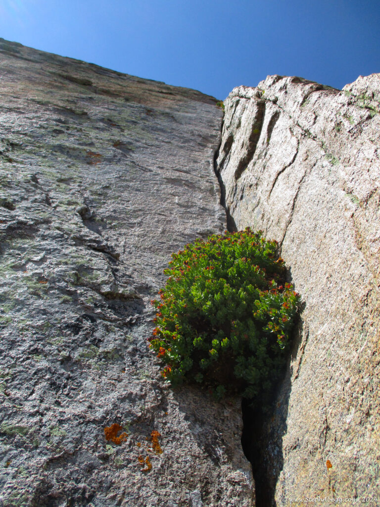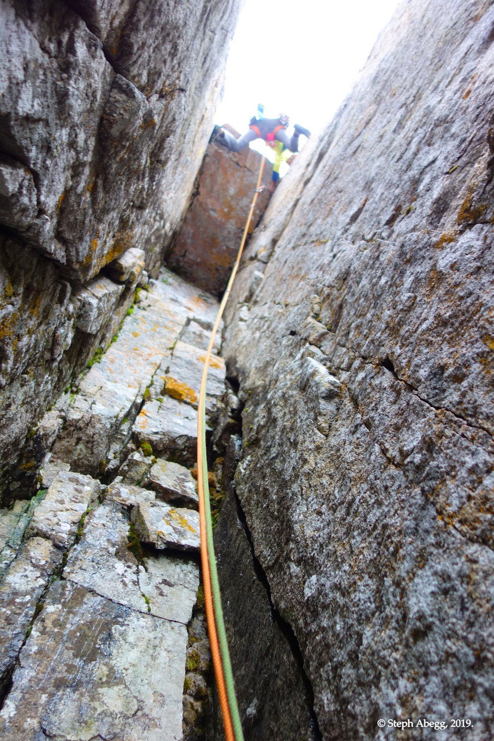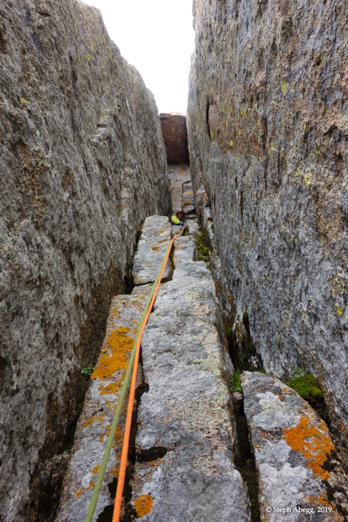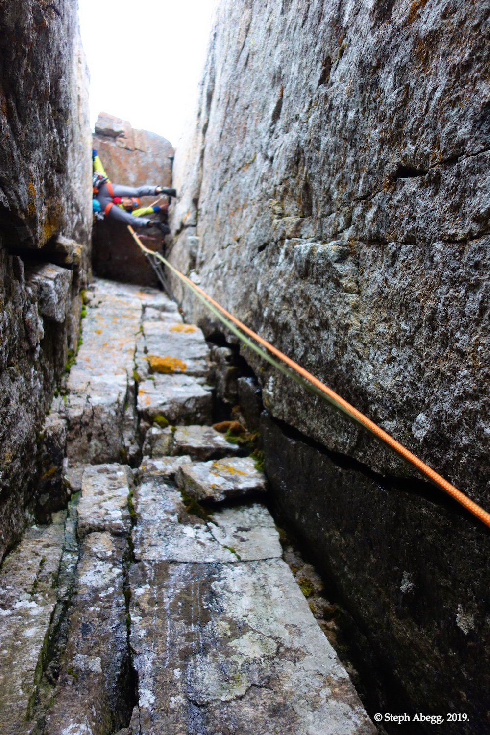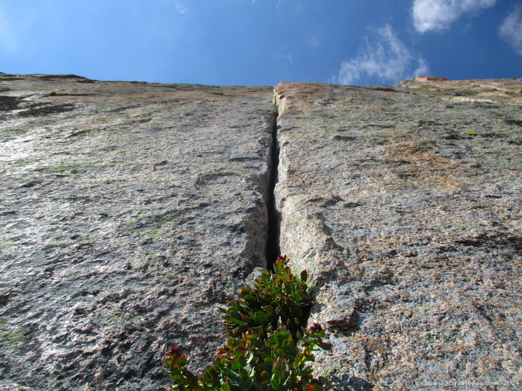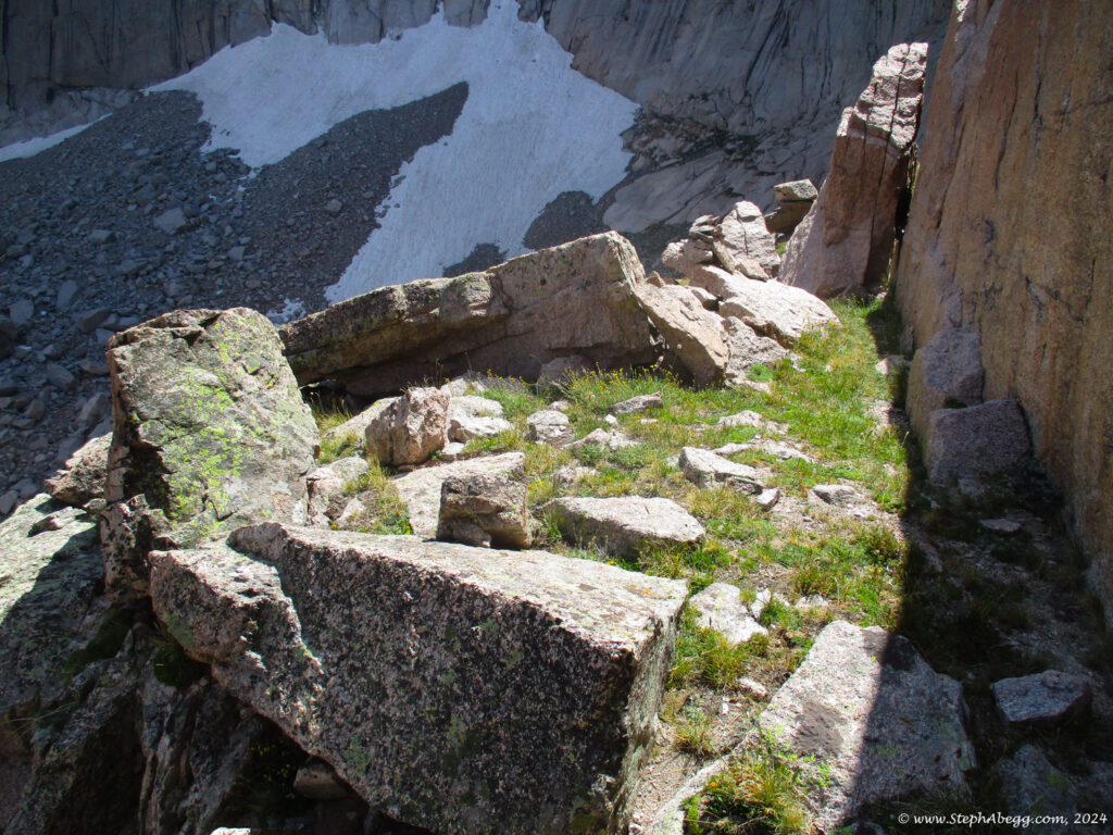 Black Dagger route is named for and climbs through the deep, 100-foot long, dagger-shaped chimney that starts a few hundred feet above the base of the Diamond and ends half a pitch from Almost Table Ledge. To get there, you can climb either the first three pitches of