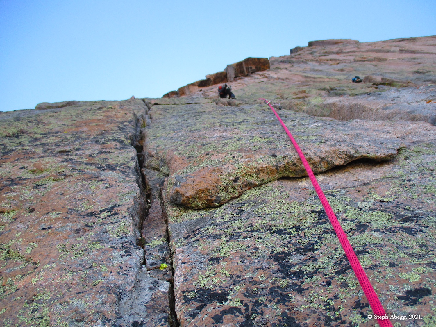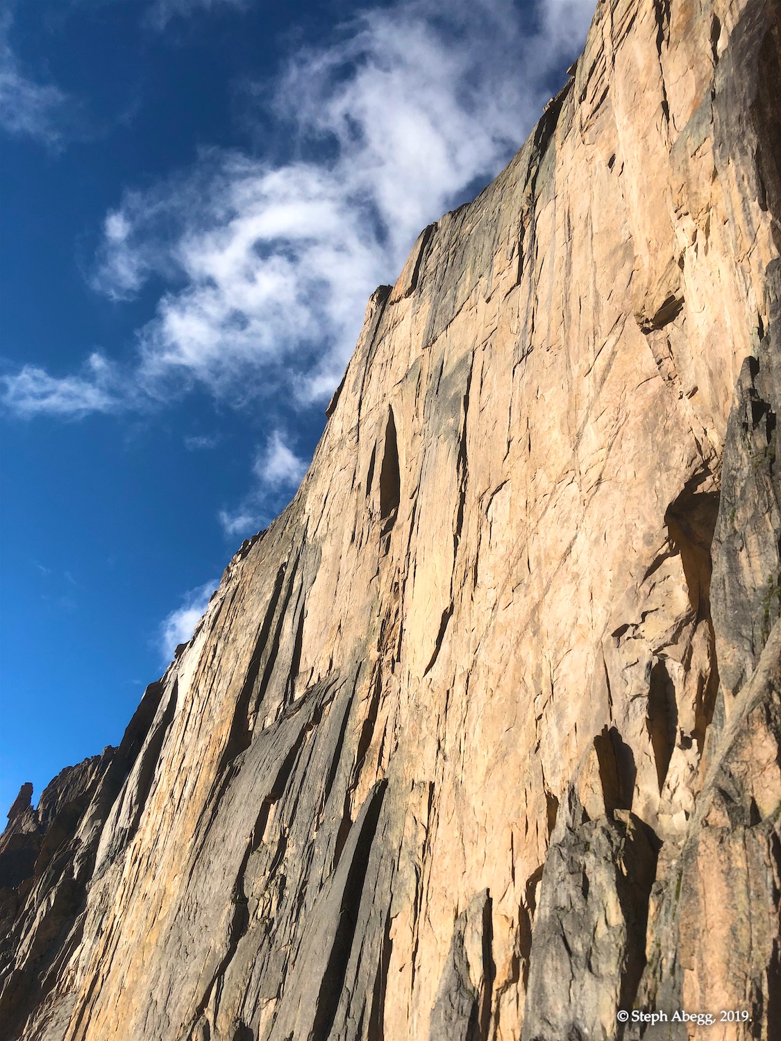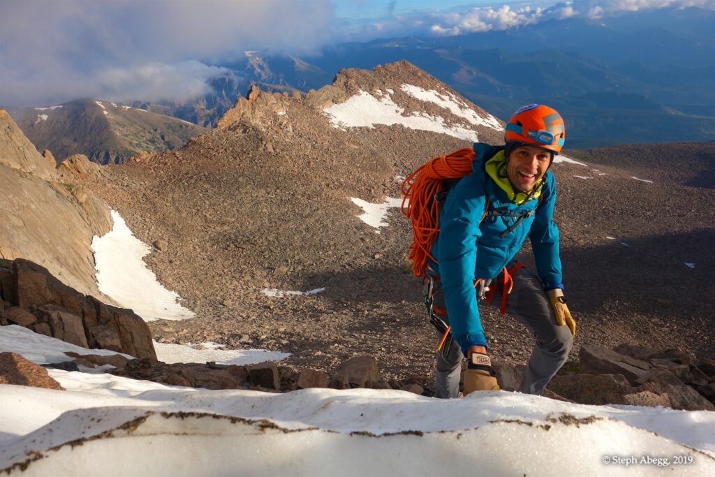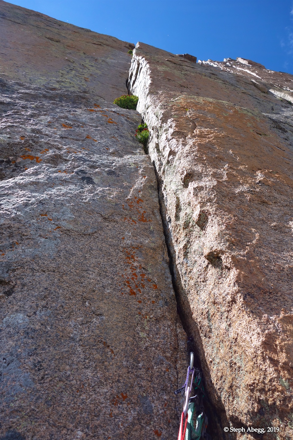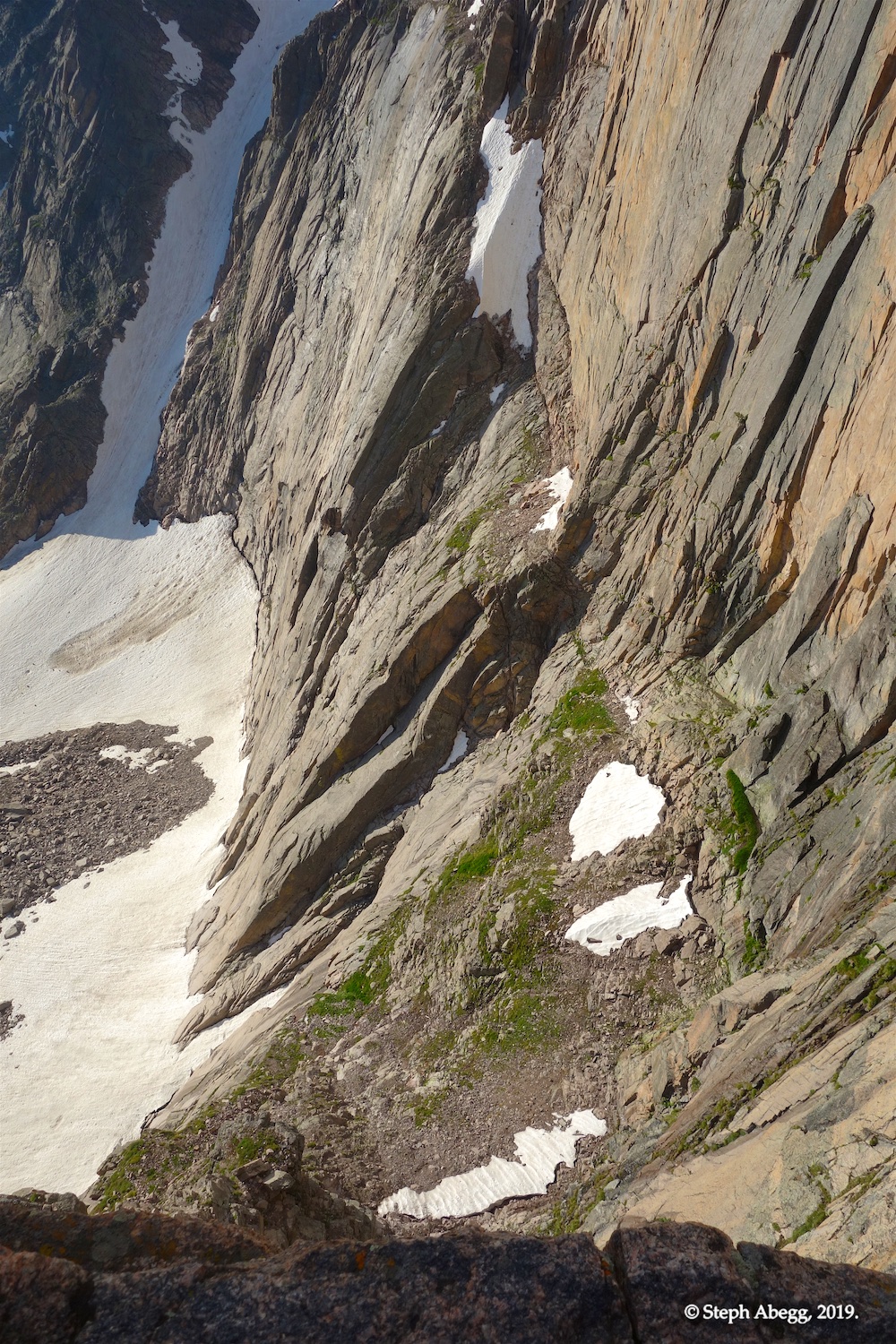 D7 five hours after we left the trailhead. And five hours after that, we were at the top of the route on Almost Table Ledge. The pitches were long with sustained difficulty and awesomeness. Nowhere else (that I've yet climbed at least) can you get hundreds of feet of vertical crack climbing up such a vast expanse of granite. Plus, it was pretty cool to be the only party climbing on the entire Diamond (there was one other party who started up Pervertical, but they bailed two pitches up). We descended via the Diamond Rappel Route, and were back in Boulder by 7:15pm. Due to an efficient pace, lack of crowds, dry rock, and no real issues to take up our time, we were car-to-car in 14.5 hours and Boulder to Boulder in 17 hours; Kishen has probably done it a bit faster, but this is my personal best car-to-car time for a single route so far. (2020 Update: Since this climb in 2019, I have climbed the Diamond several more times, and have gotten my car-to-car time to under 10 hours a couple of times.)