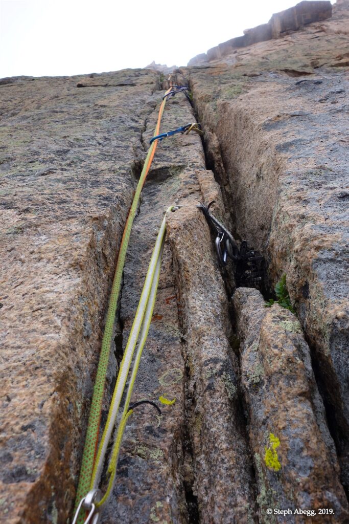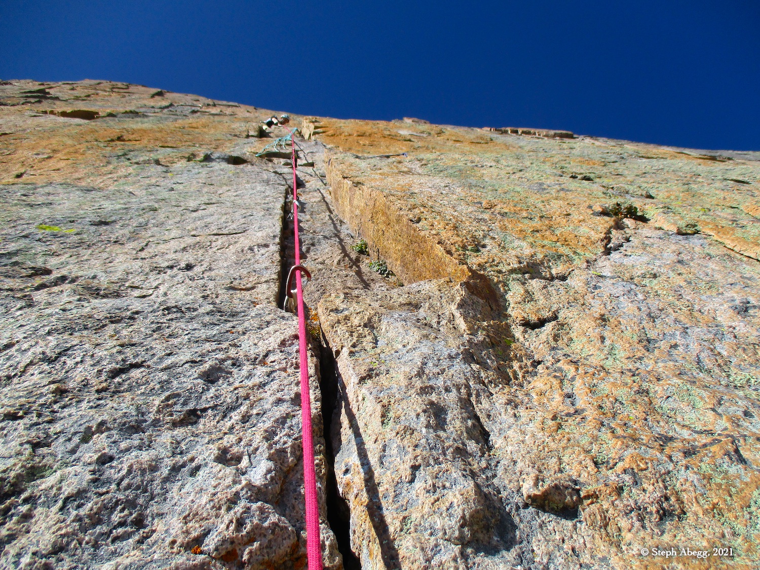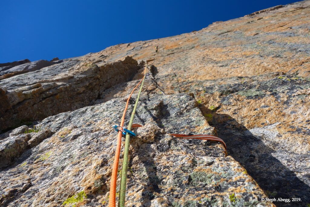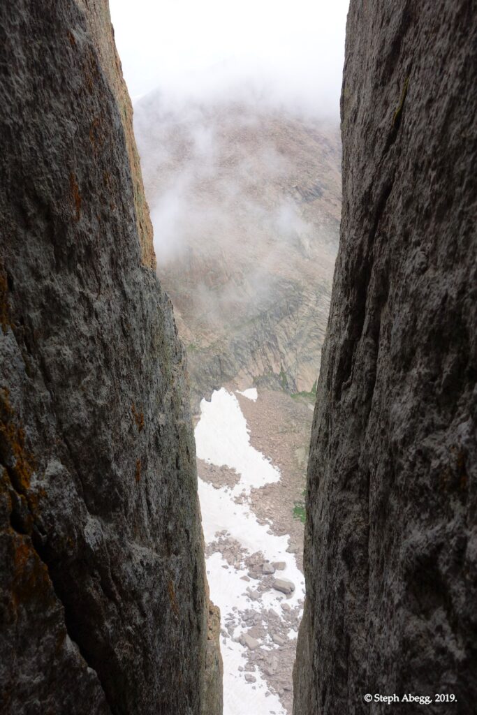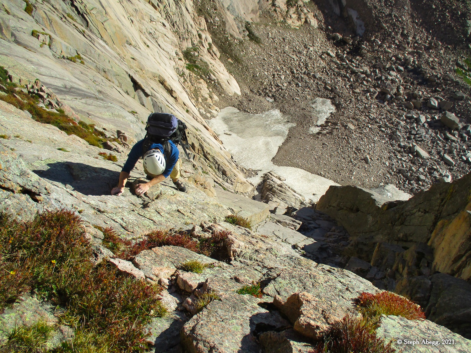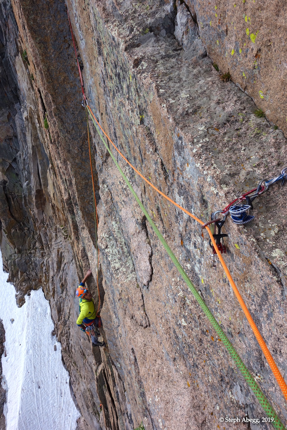 D7 five hours after we left the trailhead. And five hours after that, we were at the top of the route on Almost Table Ledge. The pitches were long with sustained difficulty and awesomeness. Nowhere else (that I've yet climbed at least) can you get hundreds of feet of vertical crack climbing up such a vast expanse of granite. Plus, it was pretty cool to be the only party climbing on the entire Diamond (there was one other party who started up Pervertical, but they bailed two pitches up). We descended via the Diamond Rappel Route, and were back in Boulder by 7:15pm. Due to an efficient pace, lack of crowds, dry rock, and no real issues to take up our time, we were car-to-car in 14.5 hours and Boulder to Boulder in 17 hours; Kishen has probably done it a bit faster, but this is my personal best car-to-car time for a single route so far. (2020 Update: Since this climb in 2019, I have climbed the Diamond several more times, and have gotten my car-to-car time to under 10 hours a couple of times.)