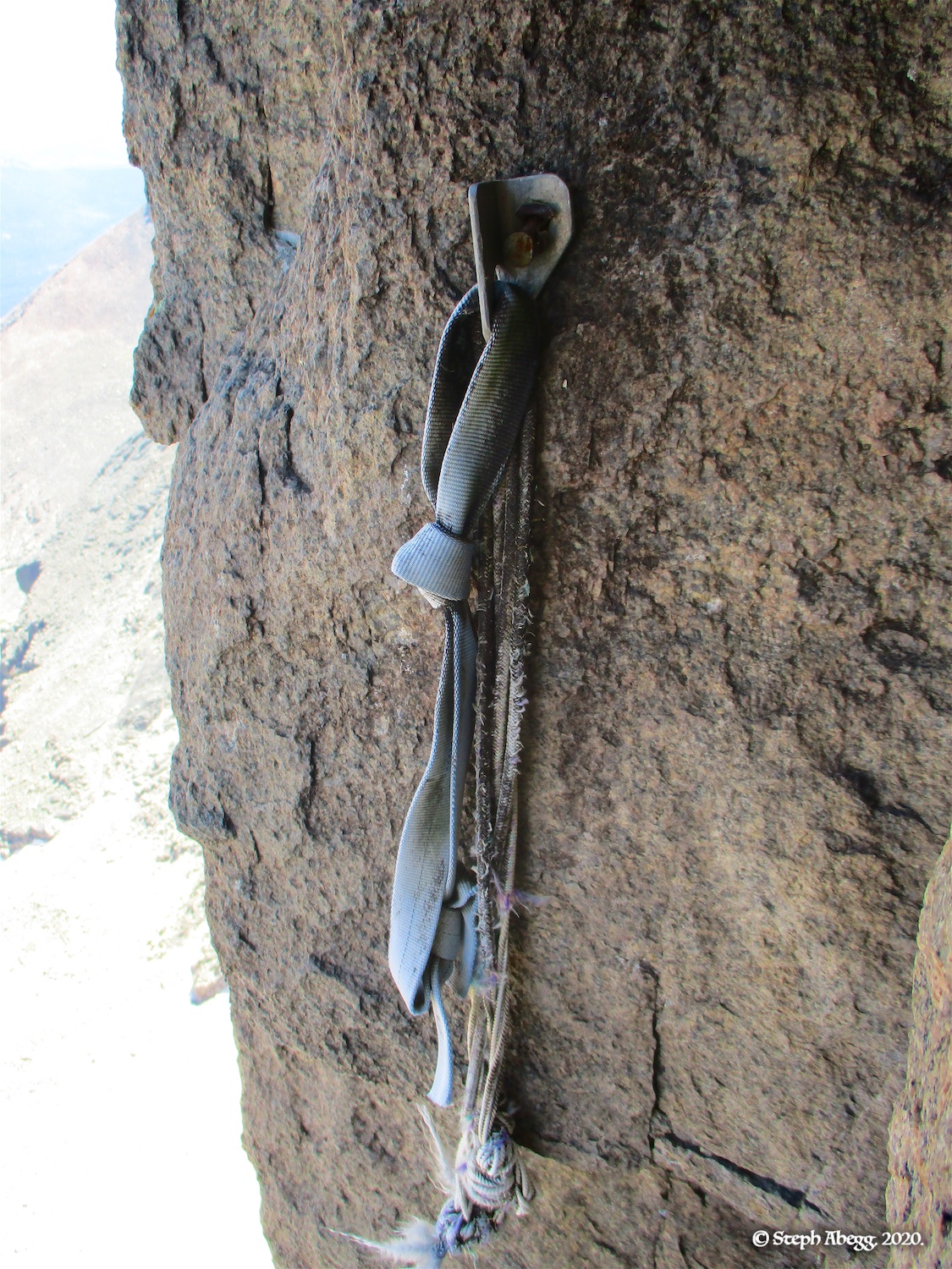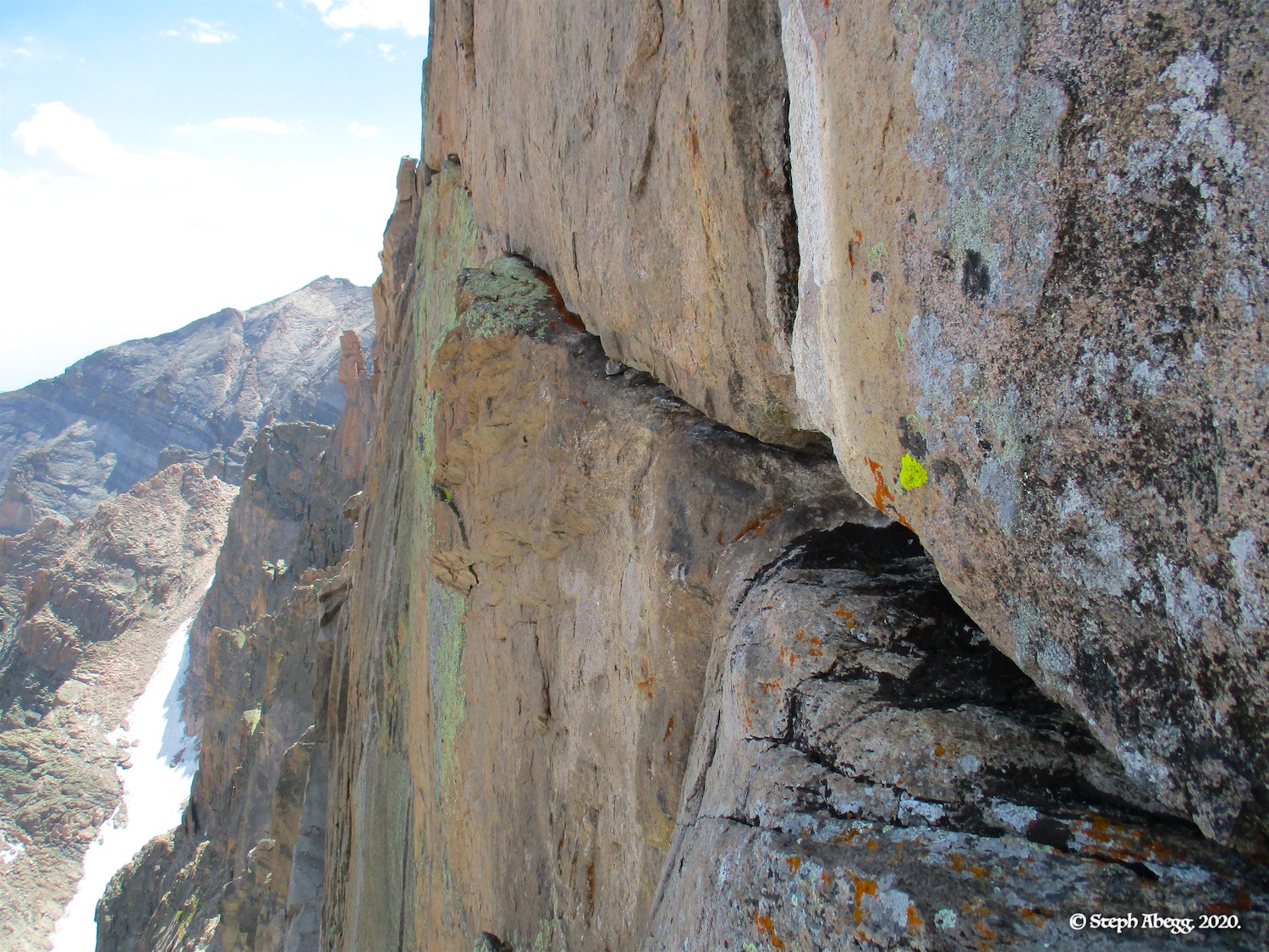 If we had gone to the top of D1, we were planning to tag the summit and then descend via the Cables Route to Camel Gully and back into Chasm Lake Cirque below Mills Glacier. But since we stopped at the top of Pitch 4, we rappelled D1 in 4 double-rope rappels off of bail anchors situated near each belay. I suspect it is quite common to get as far as Pitch 4 and throw in the towel. From Broadway Ledge, we rappelled the lower Diamond Rappel Route back into Chasm Lake Cirque and hiked out.
