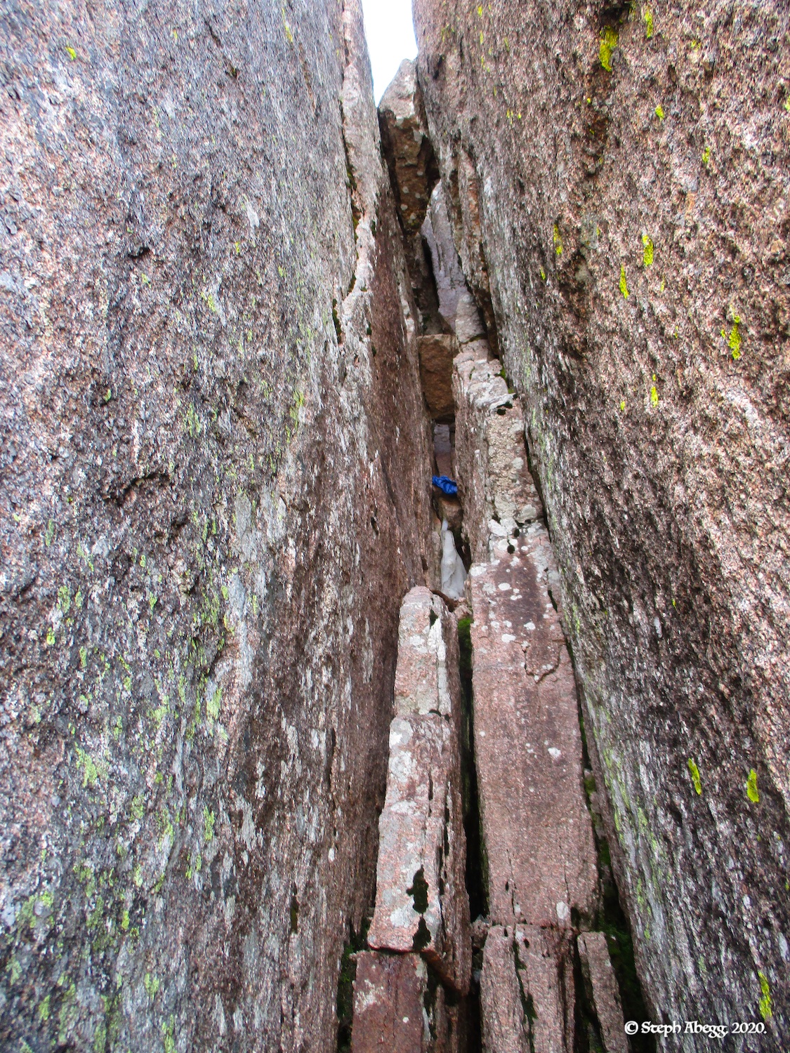 Continue up the crack system to an alcove at Table Ledge Crack.