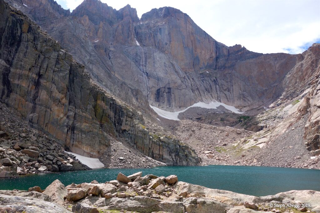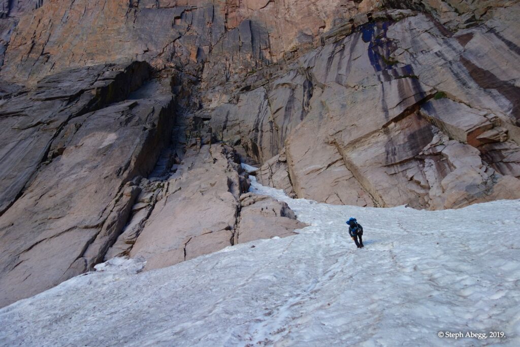 We descended via the Cables Route (3rd class scramble and 1-2 single rope rappels) to Chasm View. Then we descended Camel Gully (3rd) back into Chasm Lake Cirque and hiked out.