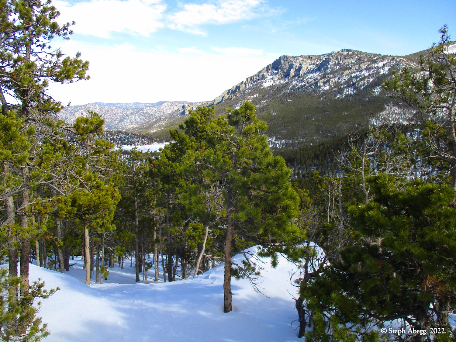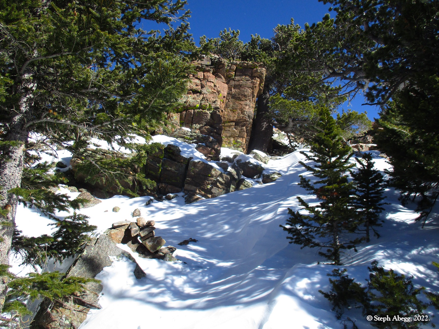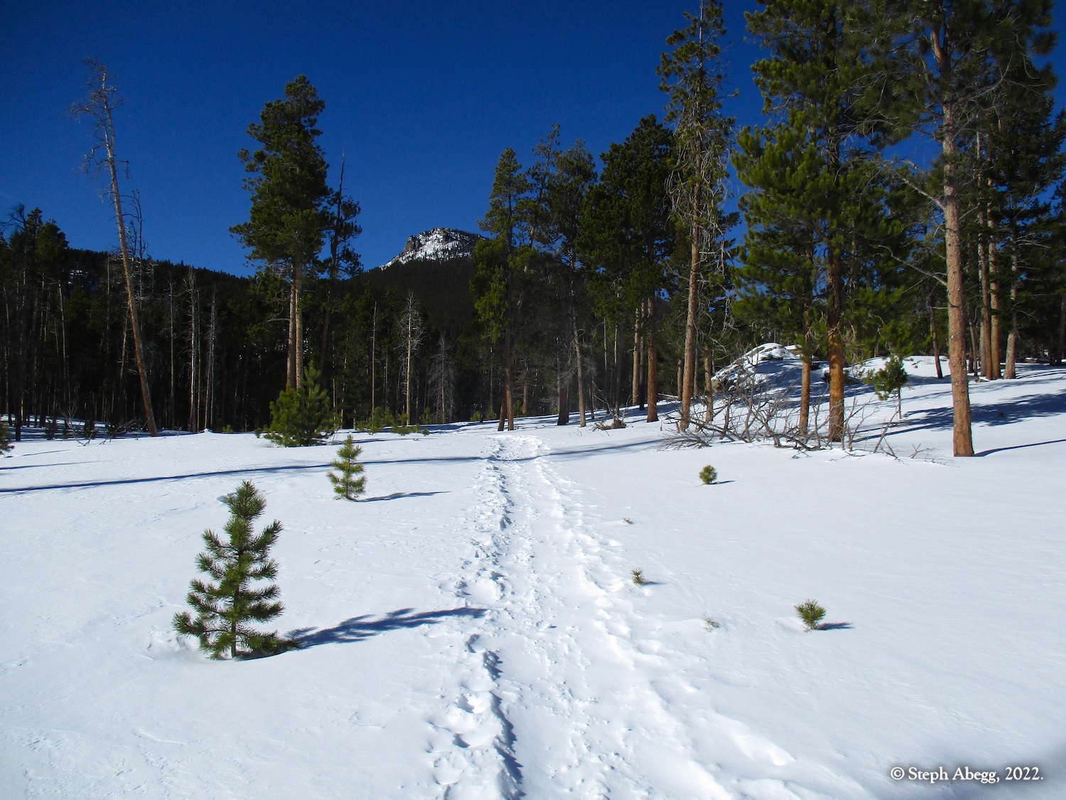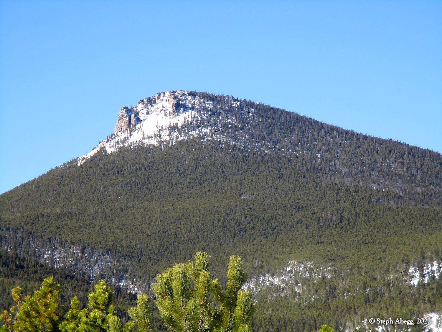 It was indeed a nice workout, since I had to cut steps through the windblown snow the entire way. I wore snowshoes until the rocky summit. The hike stays in the trees until the very top, so it was a good choice for a windy day—the sunny skies and gleaming mountains made me wish a few times that I had chosen a more mountainous objective, but when I got to the summit and experienced the "dog's head out the window of a car moving at 60mph" feeling I knew I had made a good choice for the day's hike. I did not see anyone else the entire hike.
