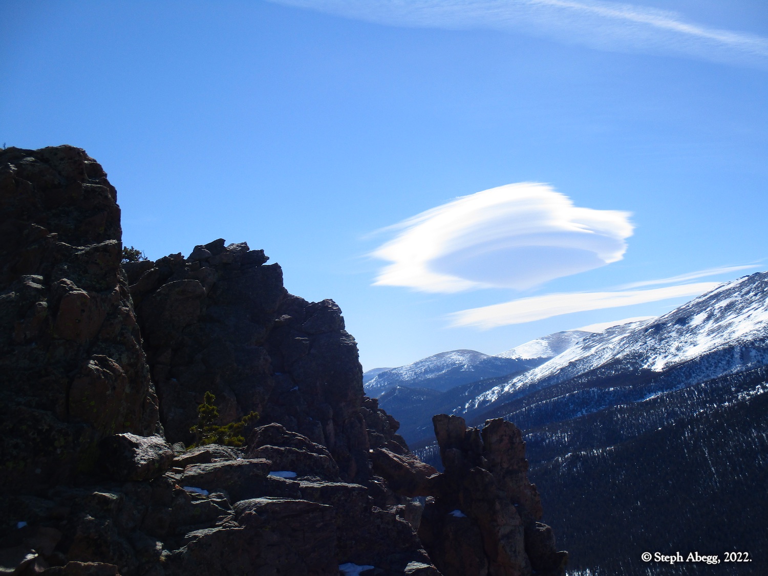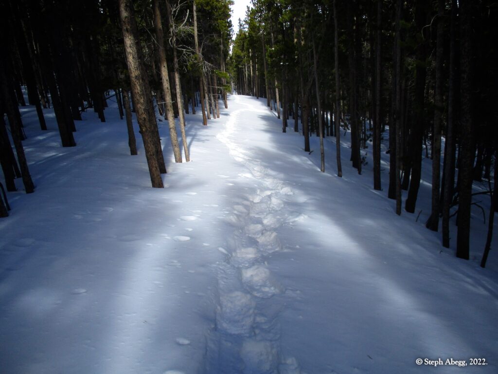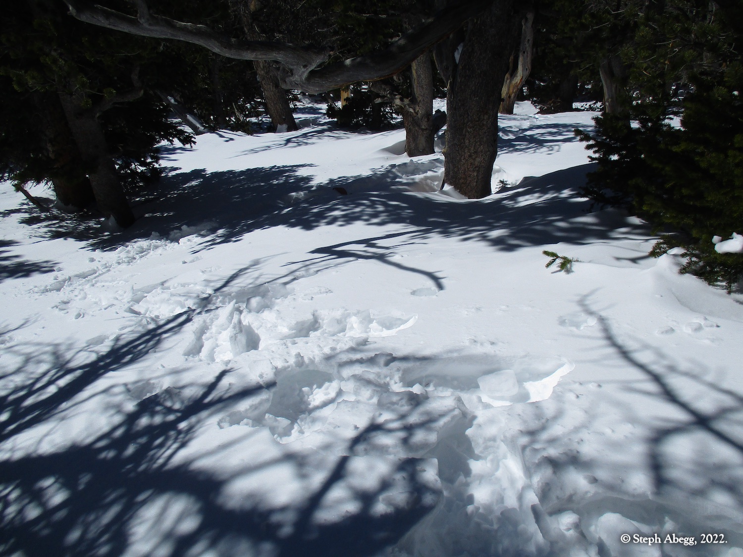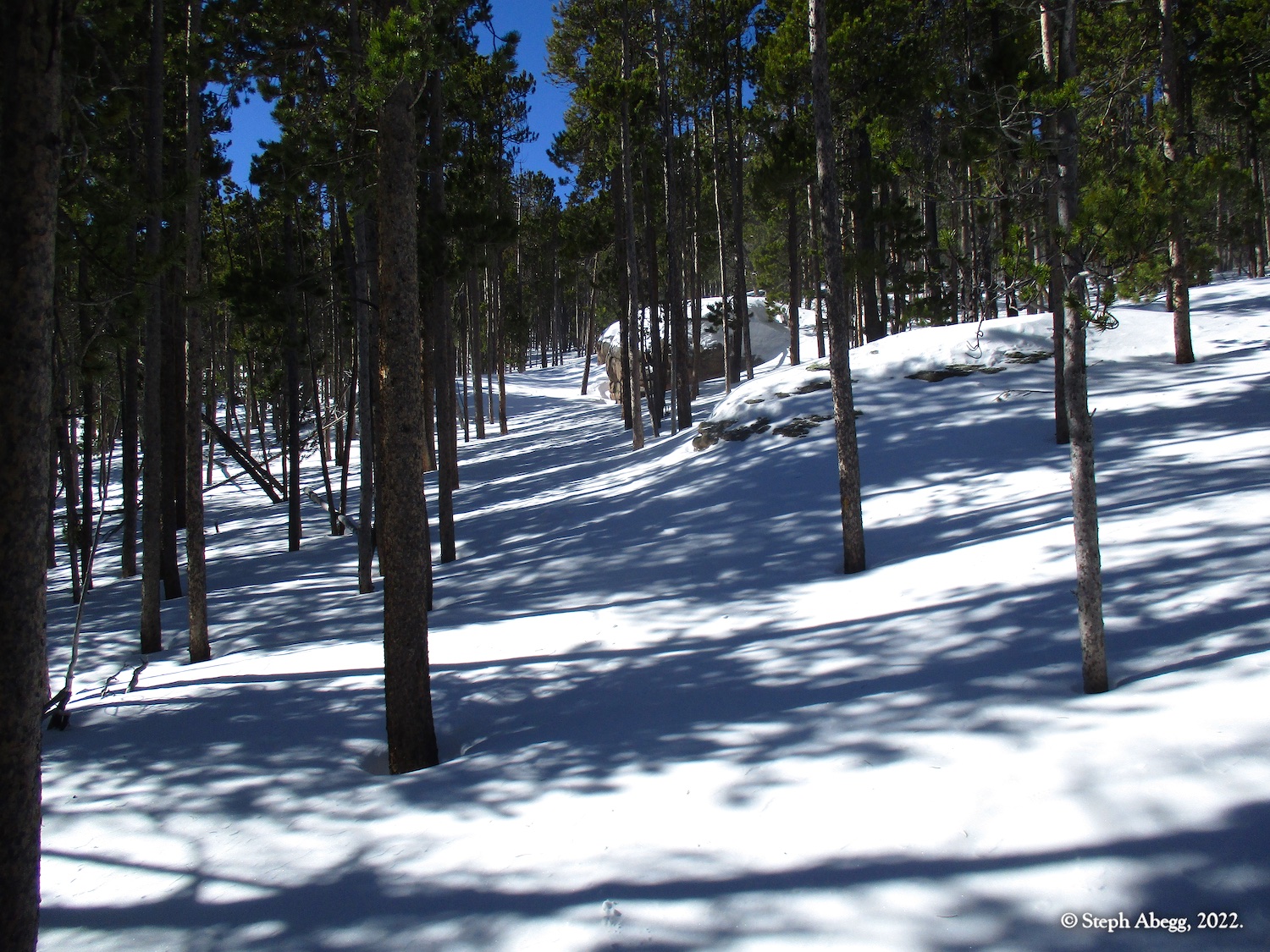 It was indeed a nice workout, since I had to cut steps through the windblown snow the entire way. I wore snowshoes until the rocky summit. The hike stays in the trees until the very top, so it was a good choice for a windy day—the sunny skies and gleaming mountains made me wish a few times that I had chosen a more mountainous objective, but when I got to the summit and experienced the "dog's head out the window of a car moving at 60mph" feeling I knew I had made a good choice for the day's hike. I did not see anyone else the entire hike.