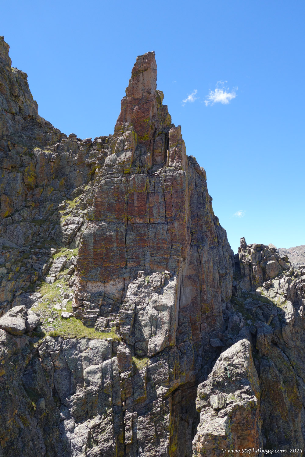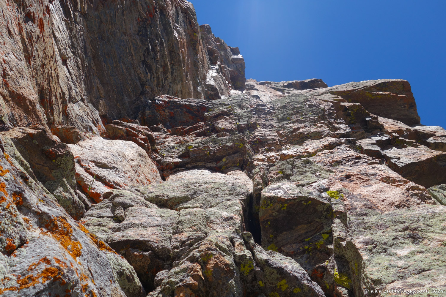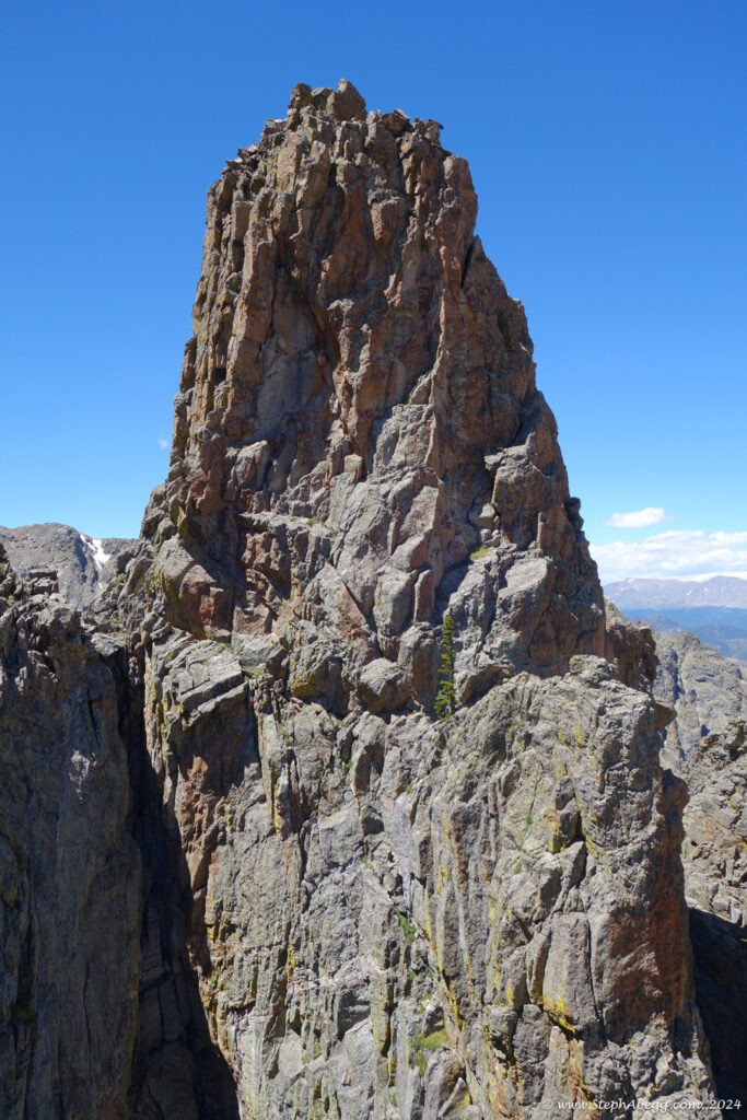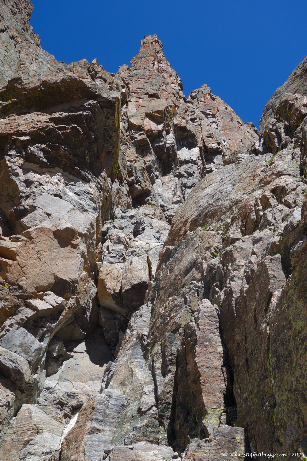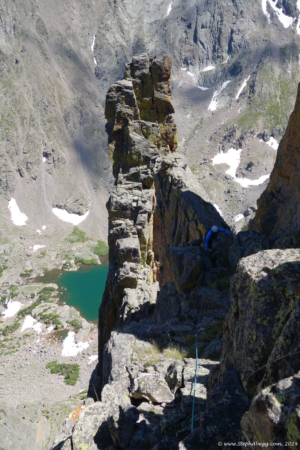 The Foil is a narrow spire right of The Petit Grepon and The Saber. It holds one of the best and narrowest summits in the park. Routes on The Foil tend to be adventurous and far less traveled than the routes on nearby spires. At 5.9, the South Face is the easiest route up The Foil. The South Face of The Foil starts out a bit lose and licheny, but the upper half offers some great alpine climbing. The route is rated "5.9 R" in the Rossier guidebook, but the "R" section on the 4th pitch is 5.7/8 and felt more PG-13 than R. That said, the "5.9" crack above this feels more like 5.9+/10-, but protects quite well.
