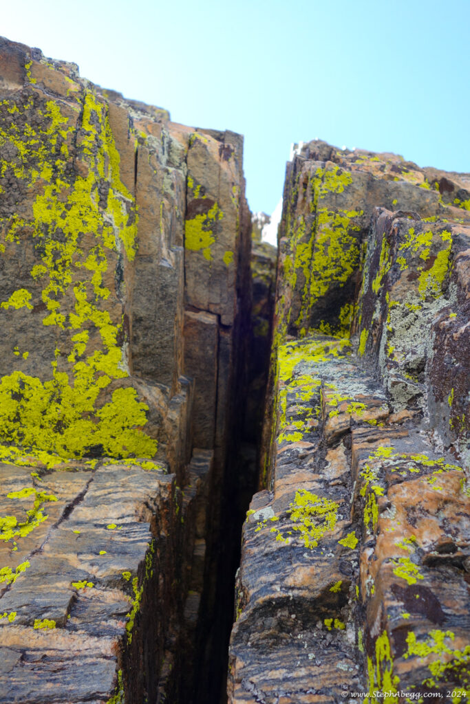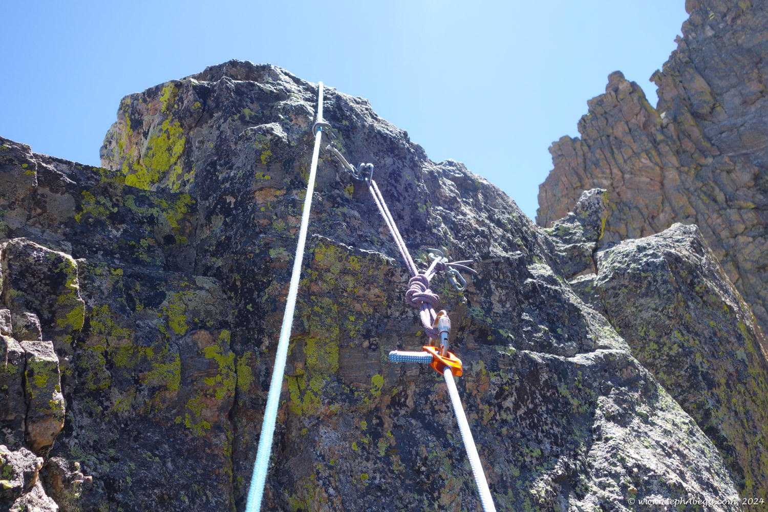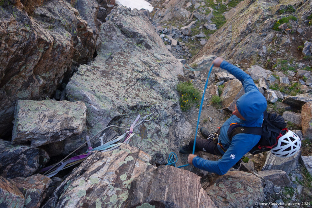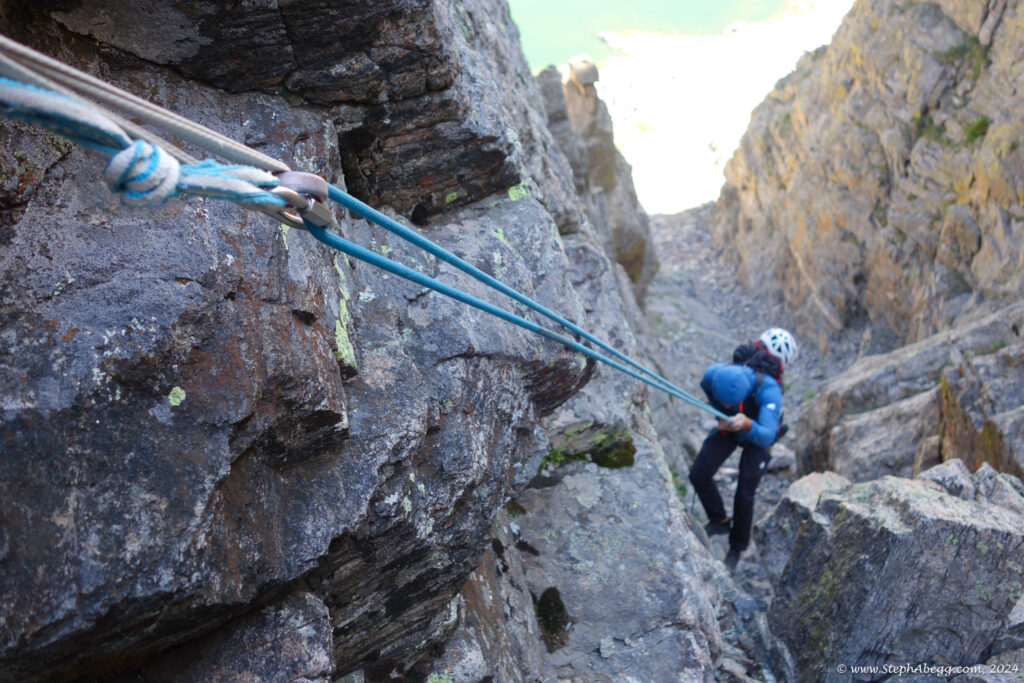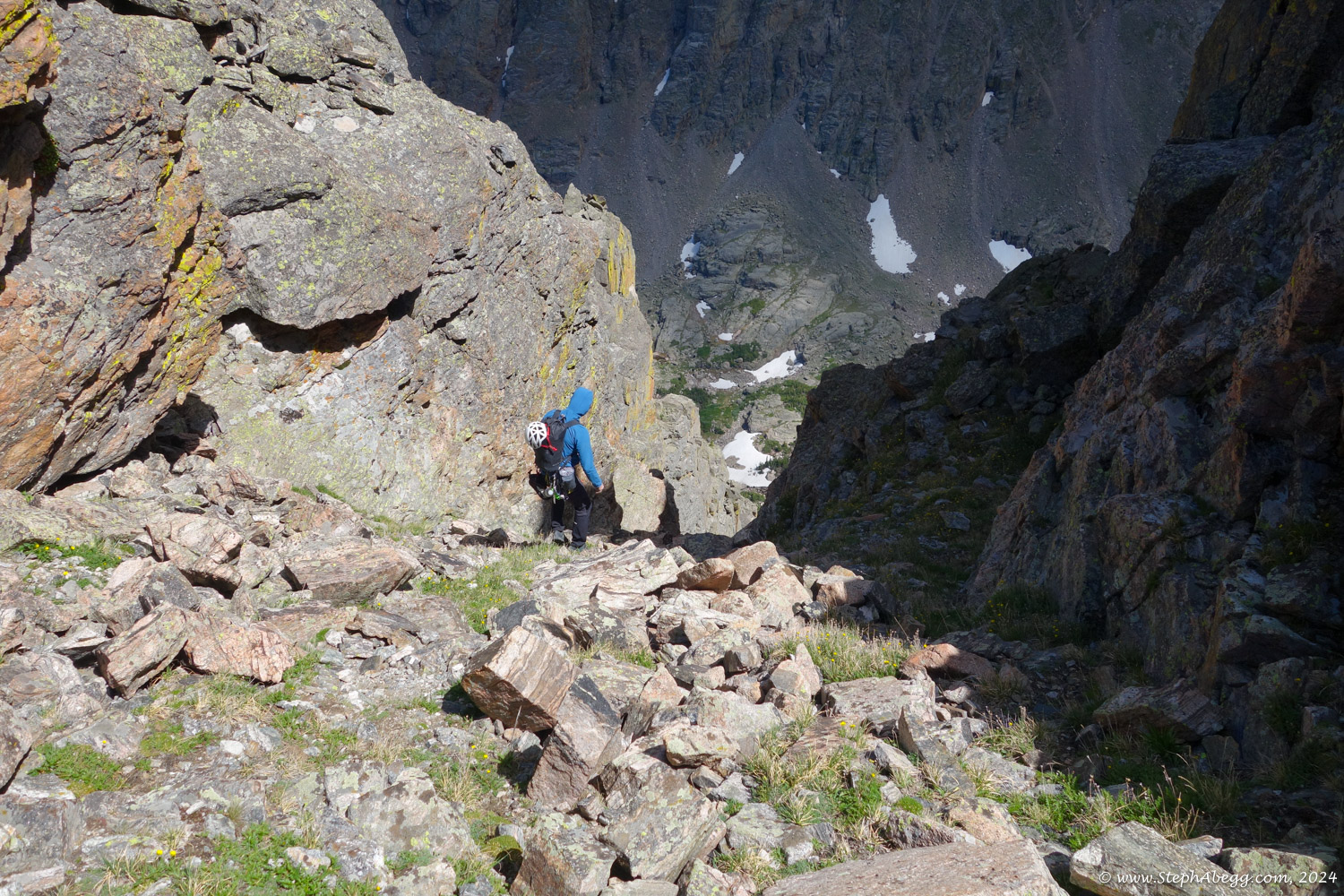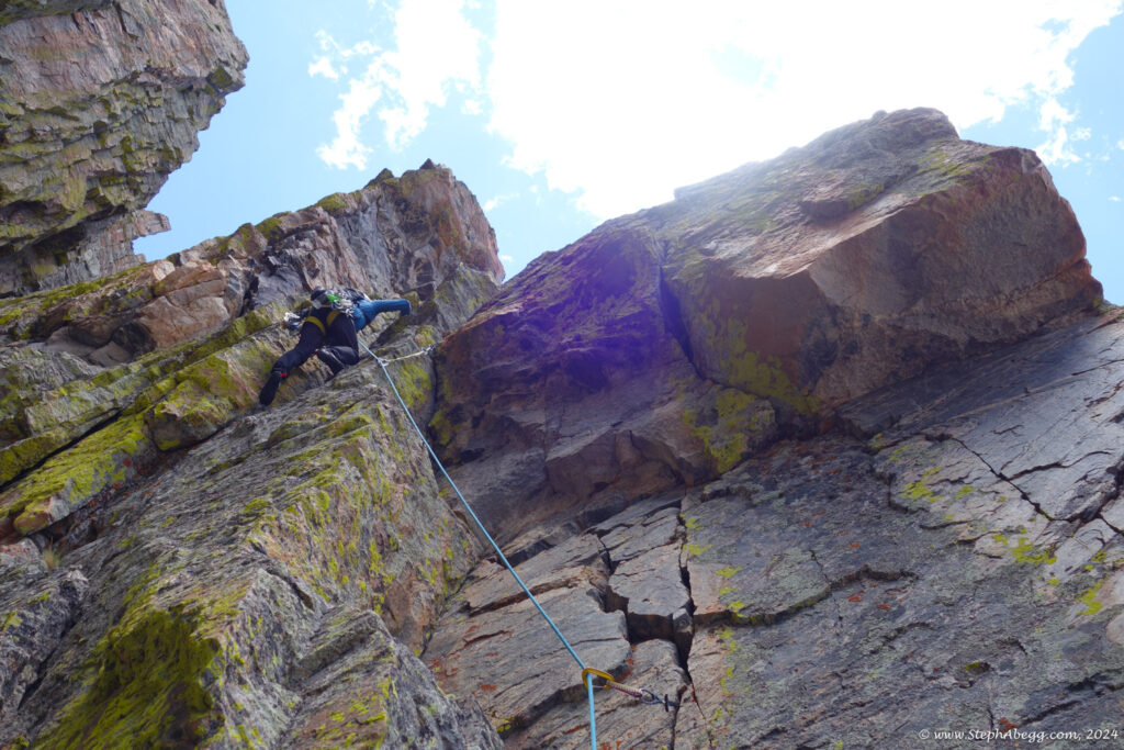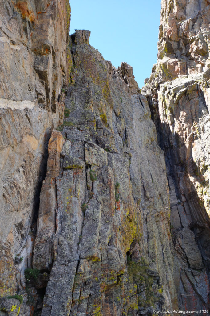 The Foil is a narrow spire right of The Petit Grepon and The Saber. It holds one of the best and narrowest summits in the park. Routes on The Foil tend to be adventurous and far less traveled than the routes on nearby spires. At 5.9, the South Face is the easiest route up The Foil. The South Face of The Foil starts out a bit lose and licheny, but the upper half offers some great alpine climbing. The route is rated "5.9 R" in the Rossier guidebook, but the "R" section on the 4th pitch is 5.7/8 and felt more PG-13 than R. That said, the "5.9" crack above this feels more like 5.9+/10-, but protects quite well.