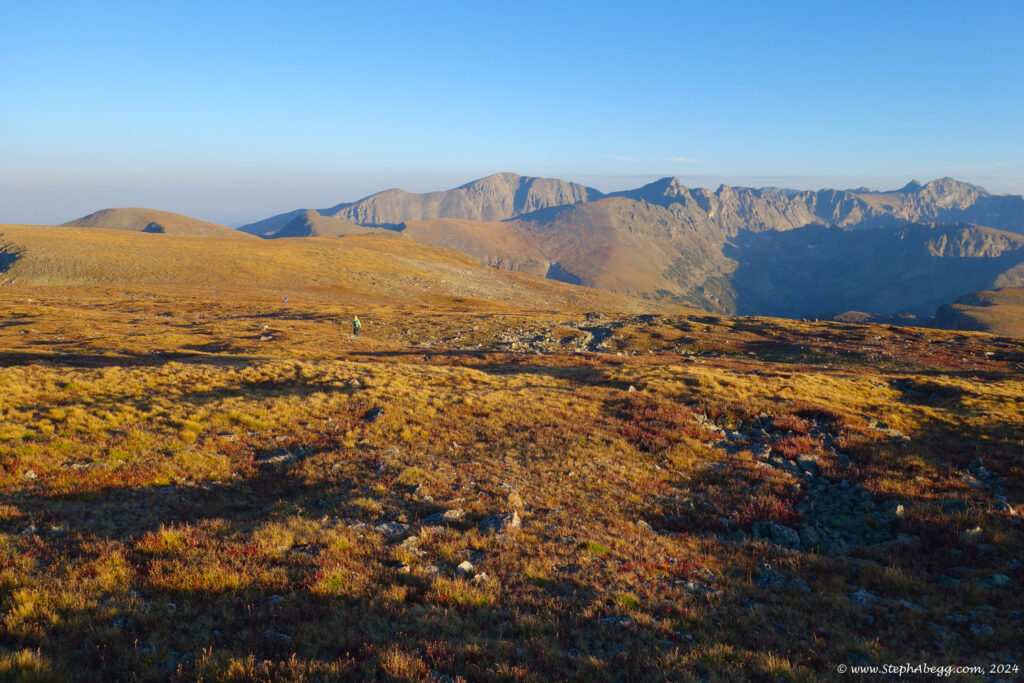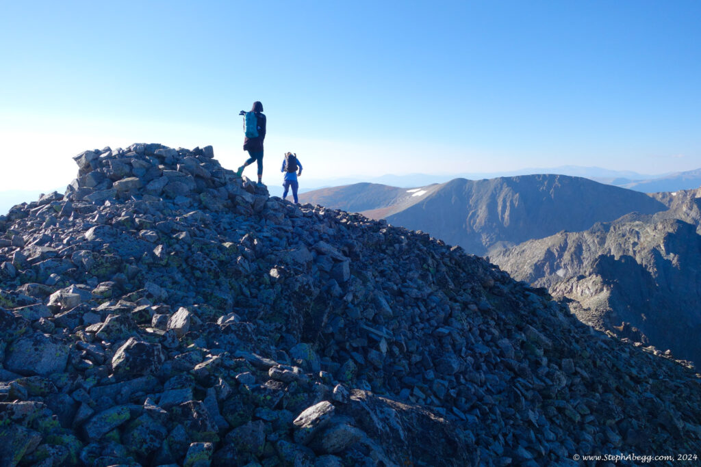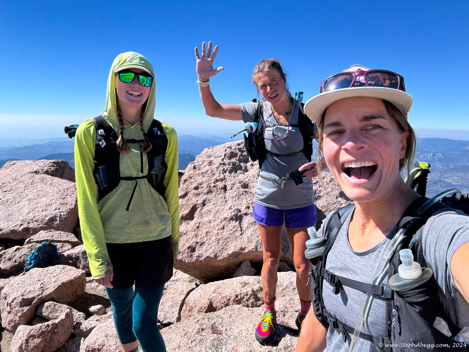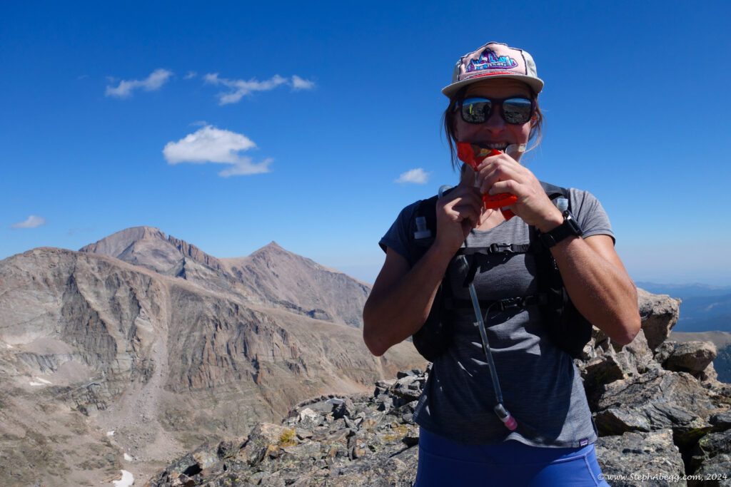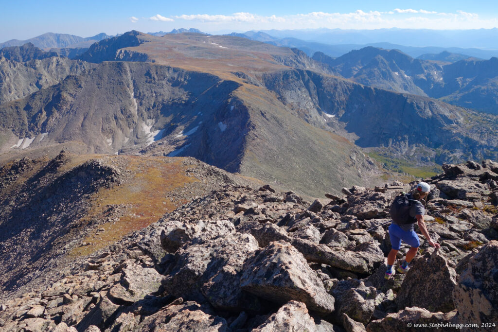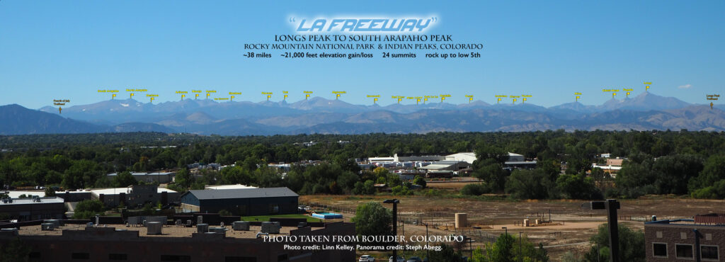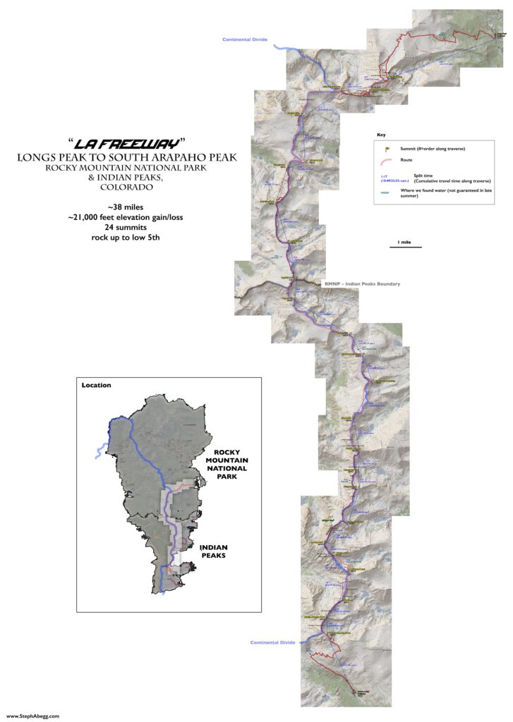 In August 2024, I did the "LA Freeway", a 38-mile ridge traverse from Longs Peak in RMNP to the Arapaho Peaks in the Indian Peaks (LA=Longs-Arapaho). Wanting to maximize my chances of success, I chose to bring bivy gear and spend one night out halfway along the traverse. Due to late summer conditions and plan to bivy, I stashed a couple of gallons of water on the route in advance. The entire adventure took me 39 hours and 45 minutes, breaking the previous self-supported female FKT by several hours. Doing something like this solo and executing with success was a special experience.