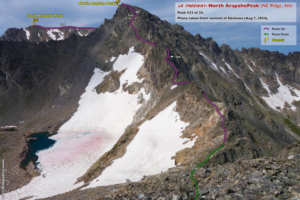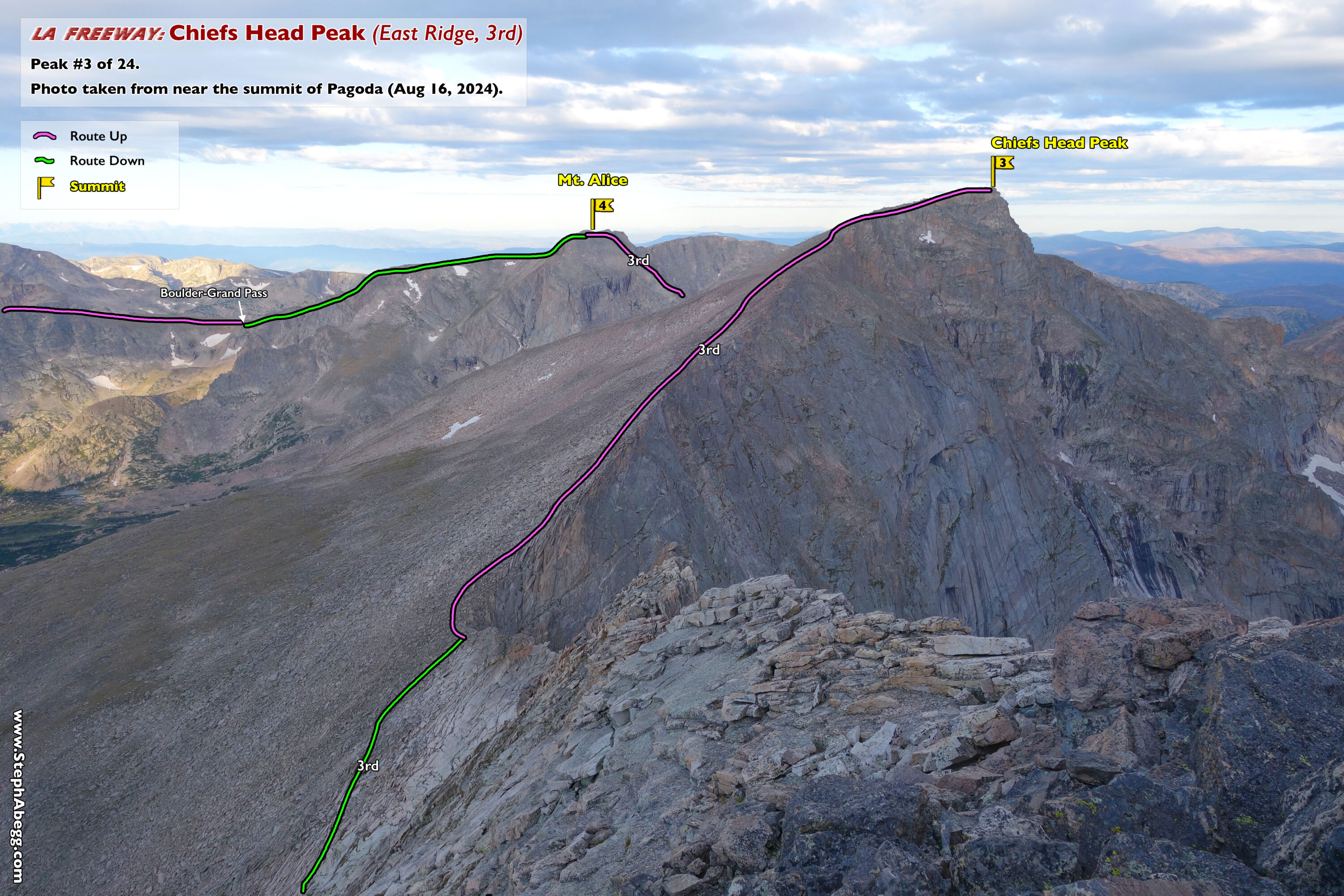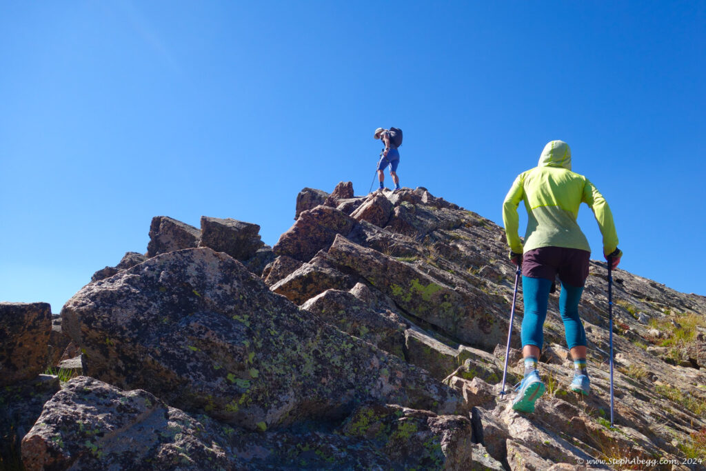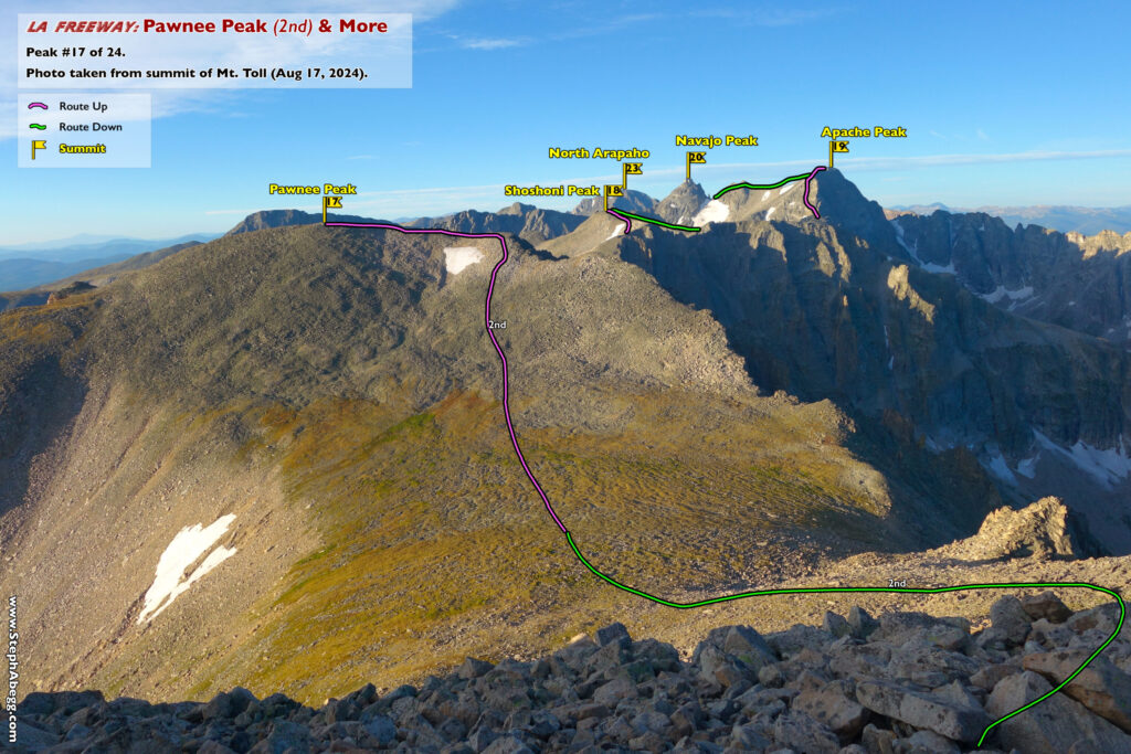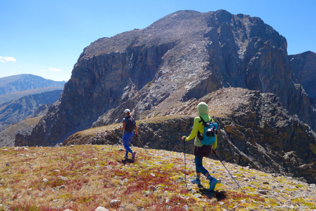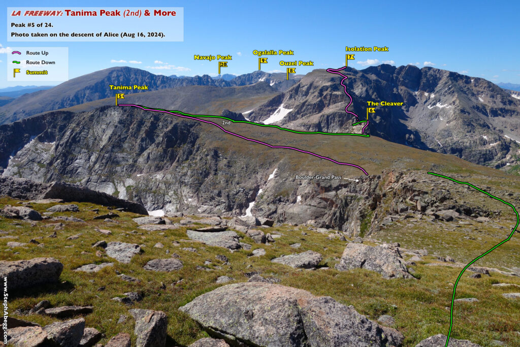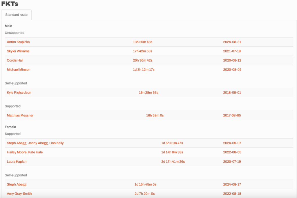 In August 2024, I did the "LA Freeway", a 38-mile ridge traverse from Longs Peak in RMNP to the Arapaho Peaks in the Indian Peaks (LA=Longs-Arapaho). Wanting to maximize my chances of success, I chose to bring bivy gear and spend one night out halfway along the traverse. Due to late summer conditions and plan to bivy, I stashed a couple of gallons of water on the route in advance. The entire adventure took me 39 hours and 45 minutes, breaking the previous self-supported female FKT by several hours. Doing something like this solo and executing with success was a special experience.