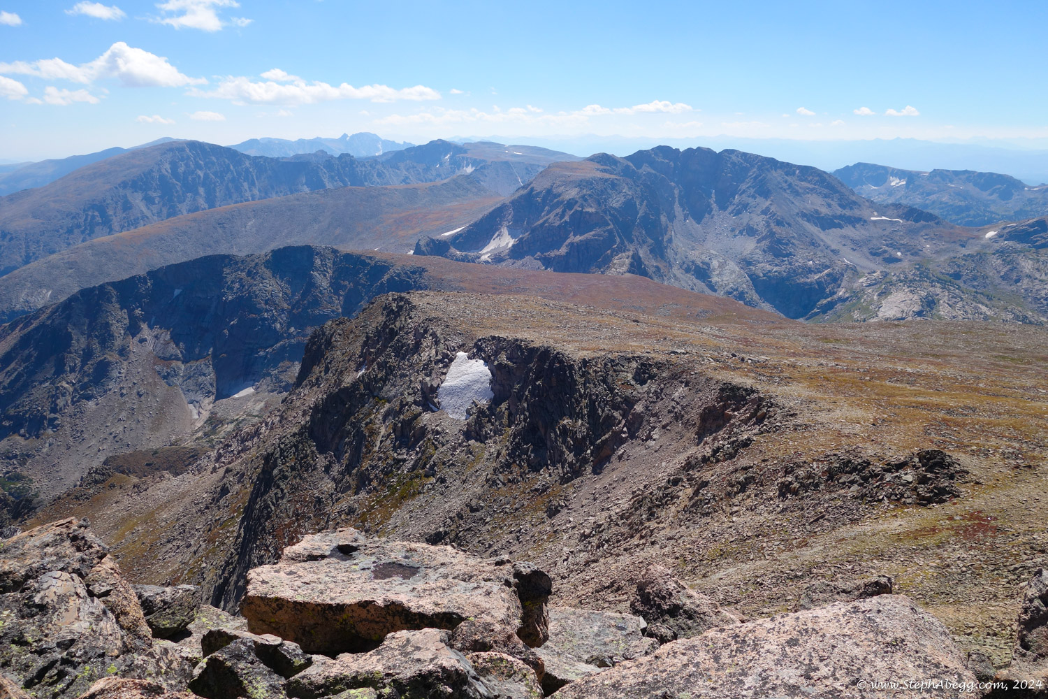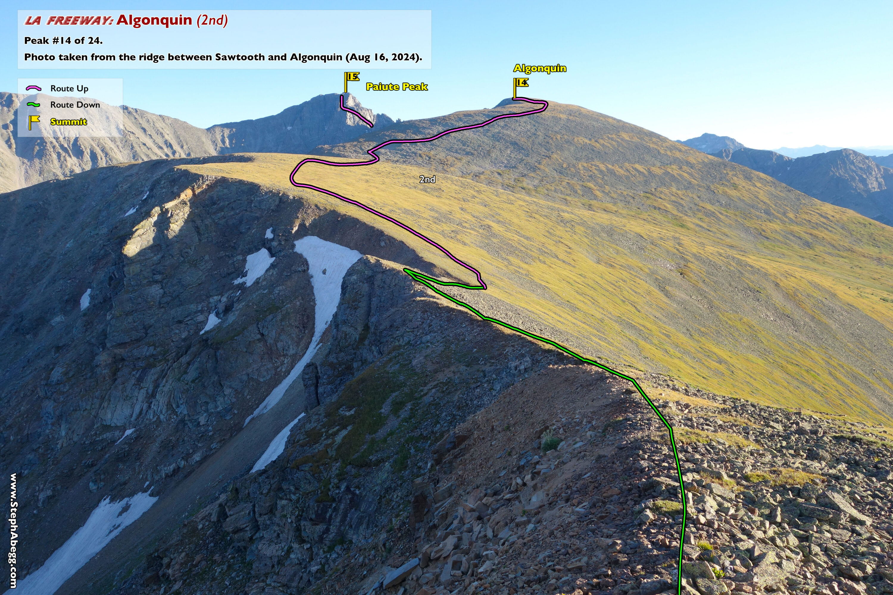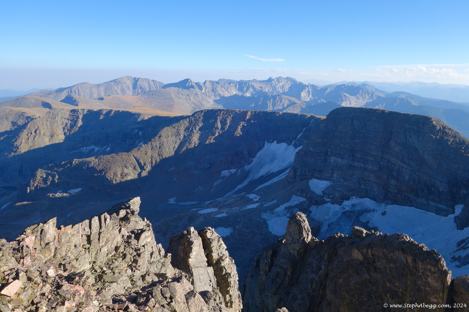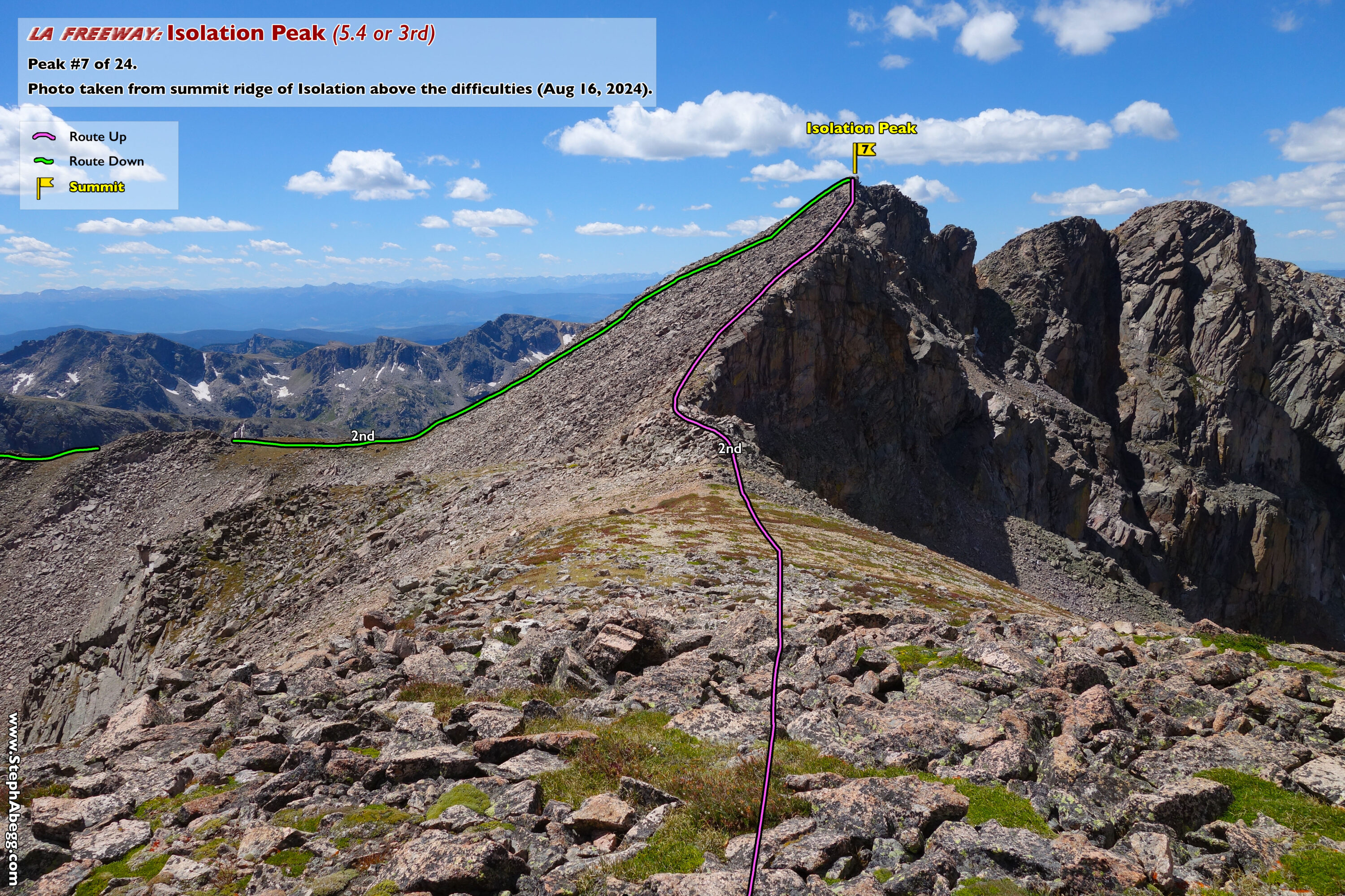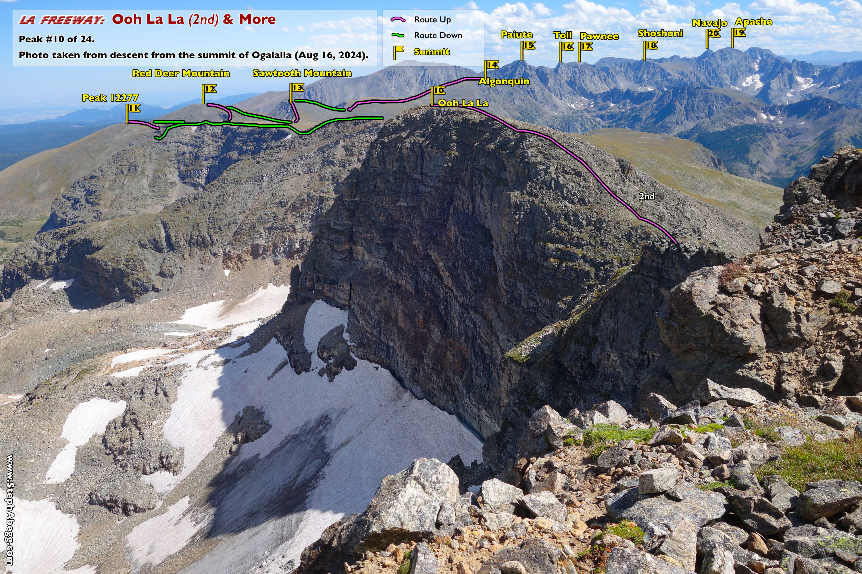 In August 2024, I did the "LA Freeway", a 38-mile ridge traverse from Longs Peak in RMNP to the Arapaho Peaks in the Indian Peaks (LA=Longs-Arapaho). Wanting to maximize my chances of success, I chose to bring bivy gear and spend one night out halfway along the traverse. Due to late summer conditions and plan to bivy, I stashed a couple of gallons of water on the route in advance. The entire adventure took me 39 hours and 45 minutes, breaking the previous self-supported female FKT by several hours. Doing something like this solo and executing with success was a special experience.