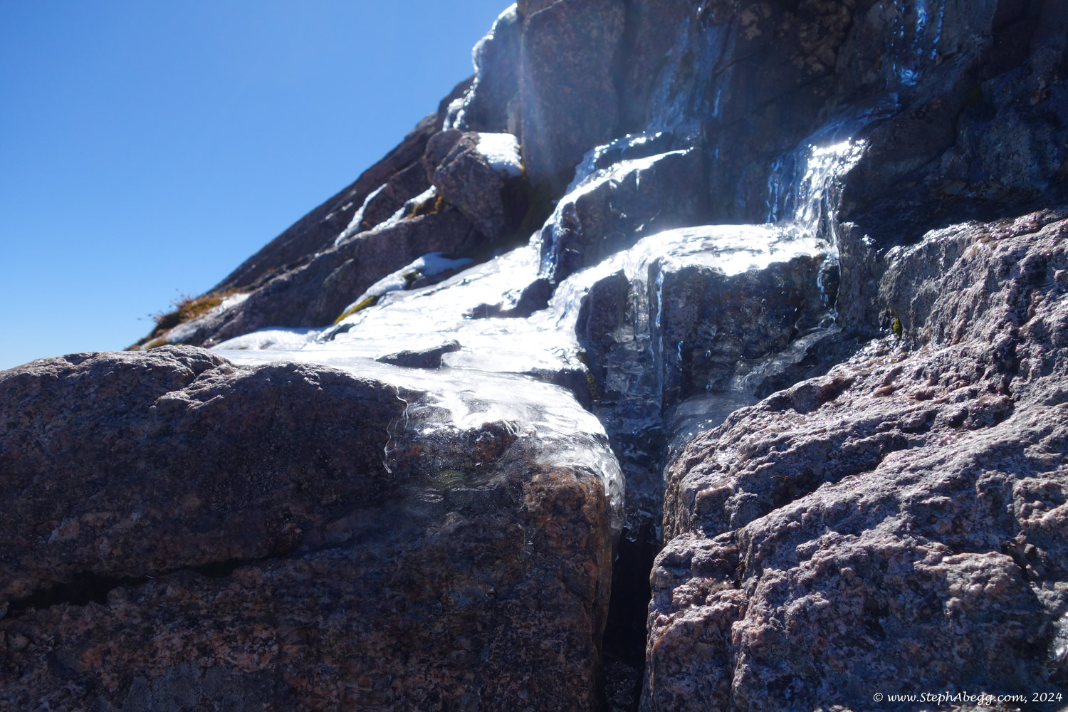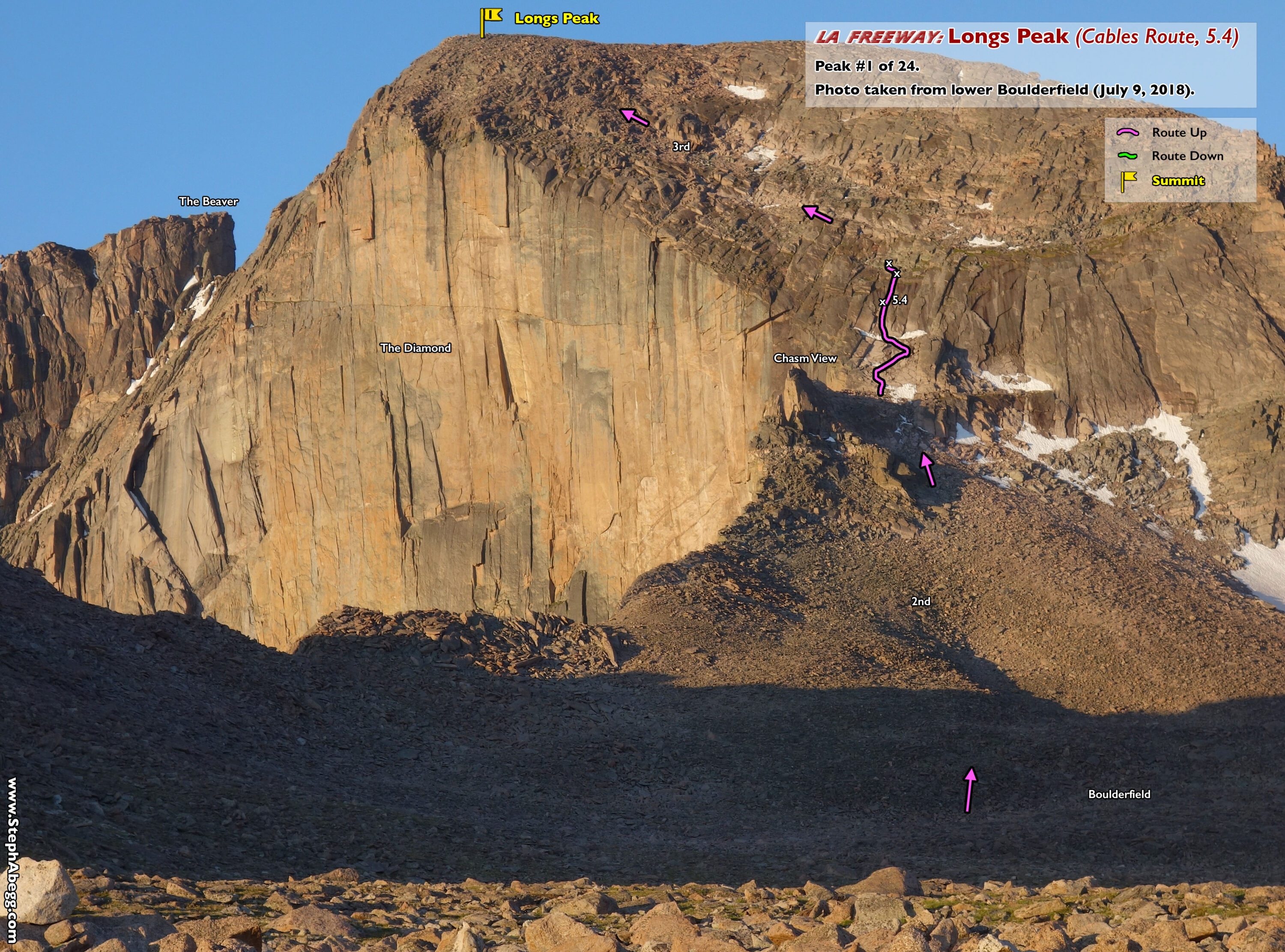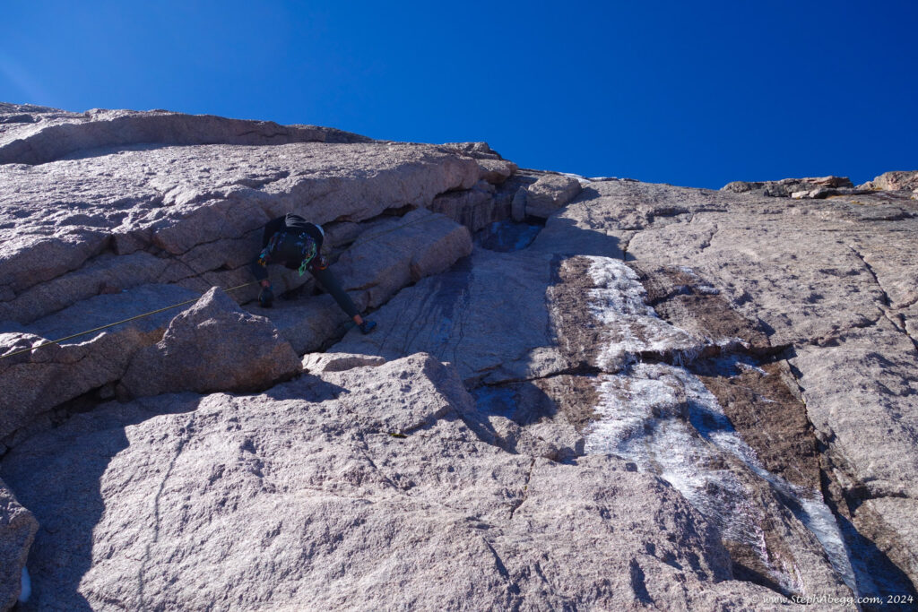 - Getting halfway up the Cables Route (5.4) on Longs Peak only to find the latter half coated in thick ice. While debating the value of our lives vs burning a couple of hours by retreating and going up another route (the NW Couloir (4th) or Keyhole Route (3rd)), we heard a party arriving at the eyebolt at the top of the iced up corner, preparing to rappel. It turned out to be Dom, an Estes Park local guide who I had met once or twice before. Chagrined and feeling like a gumbie in trouble but inspired by the idea of saving either our lives or a couple of hours of time, I asked if it would be okay if we tied into his rope to safely make the exit moves from the ice-encrusted 5.4 crux. He was happy to do so, so the three of us gumbies got safely to the top of the Cables Route and continued on our merry way. Thanks Dom!