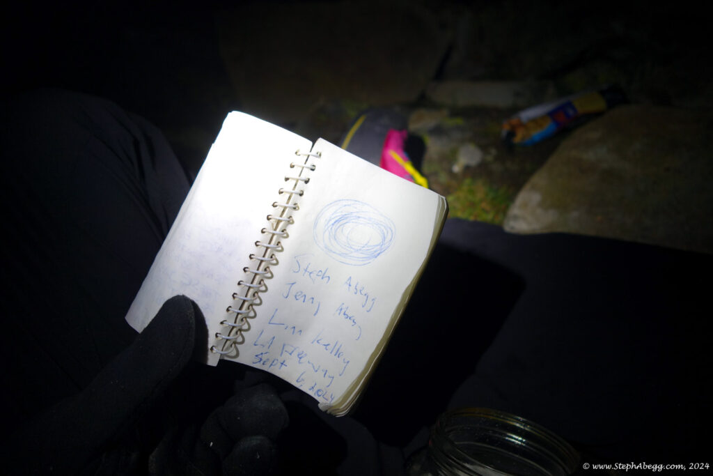 - Taking a 1.5 hour break from 3:30-5am on the ridge between Shoshoni and the Chessmen, encased in a gold foil mylar emergency blanket. I was a bit too cold to ever fall asleep, but Jenny caught a few winks.