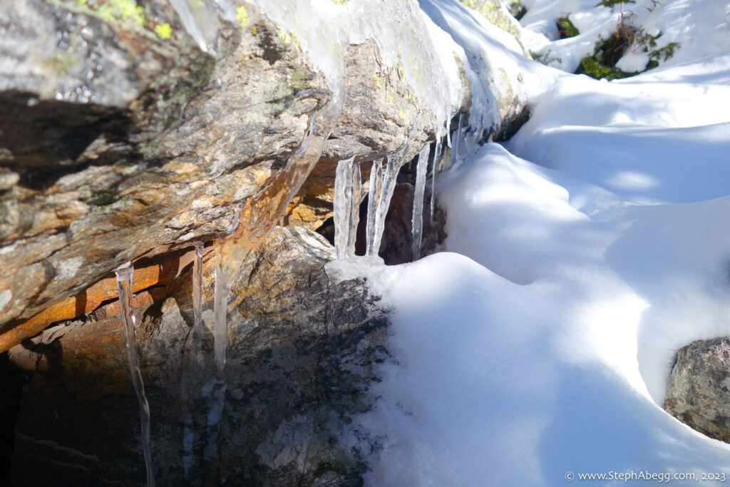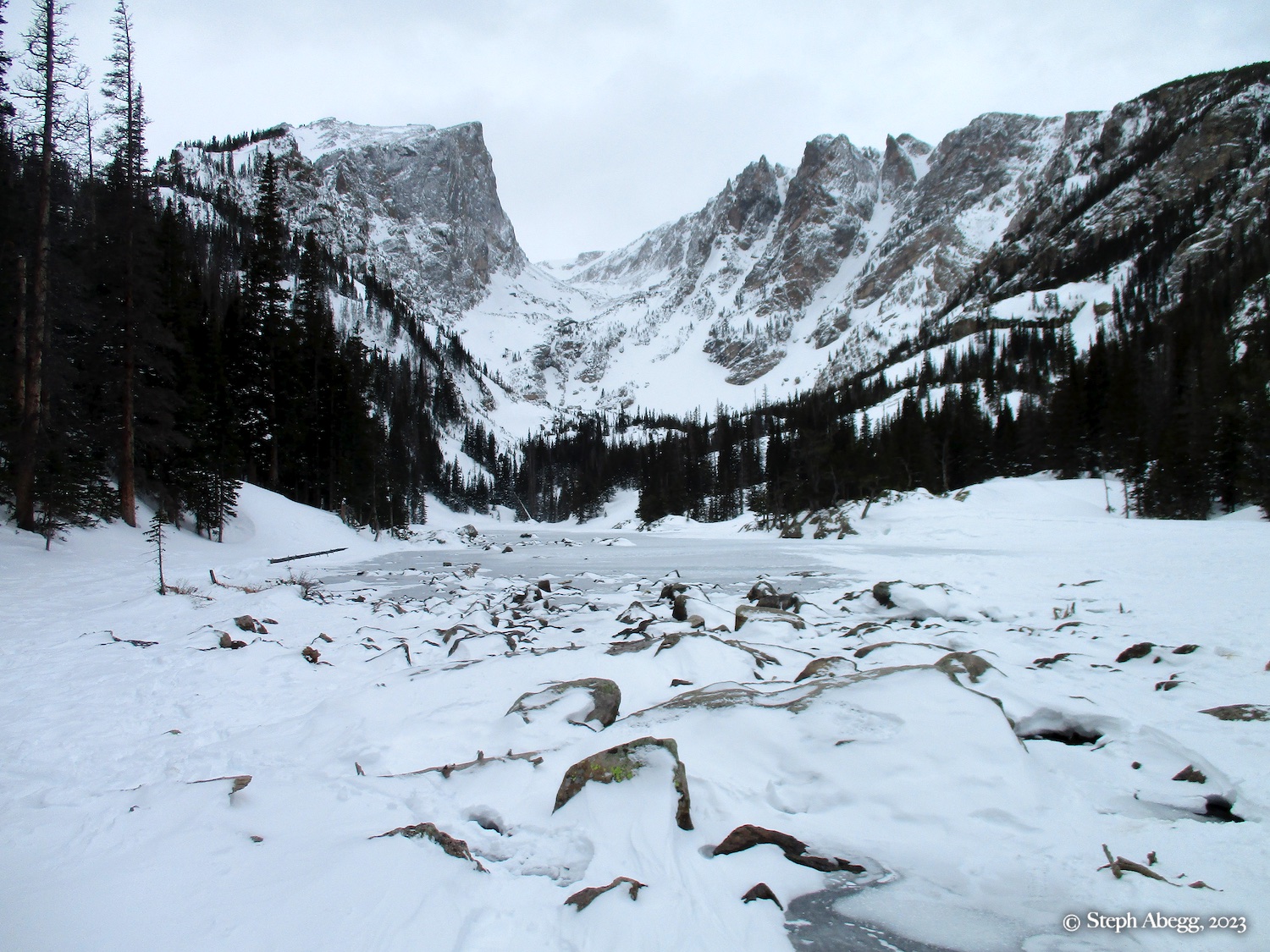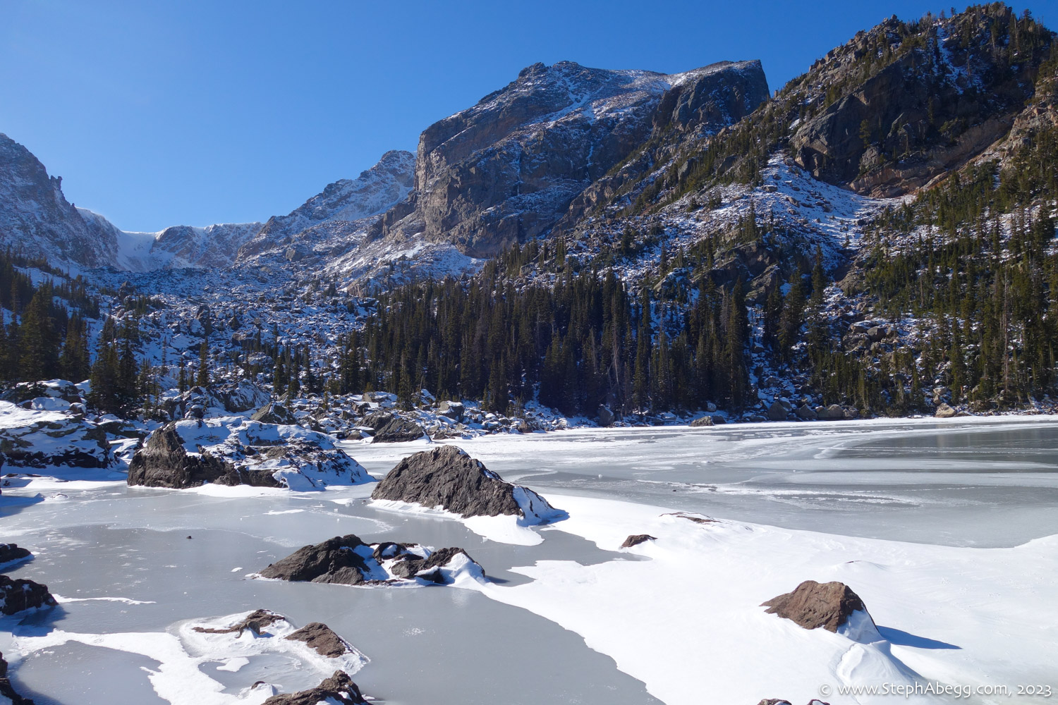I had heard that in the winter, Lake Haiyaha has some unique ice formations. I was curious to check them out. So during a midweek afternoon lull in my workload, I took advantage of a couple of free afternoon hours to do a quick hike up to Lake Haiyaha.