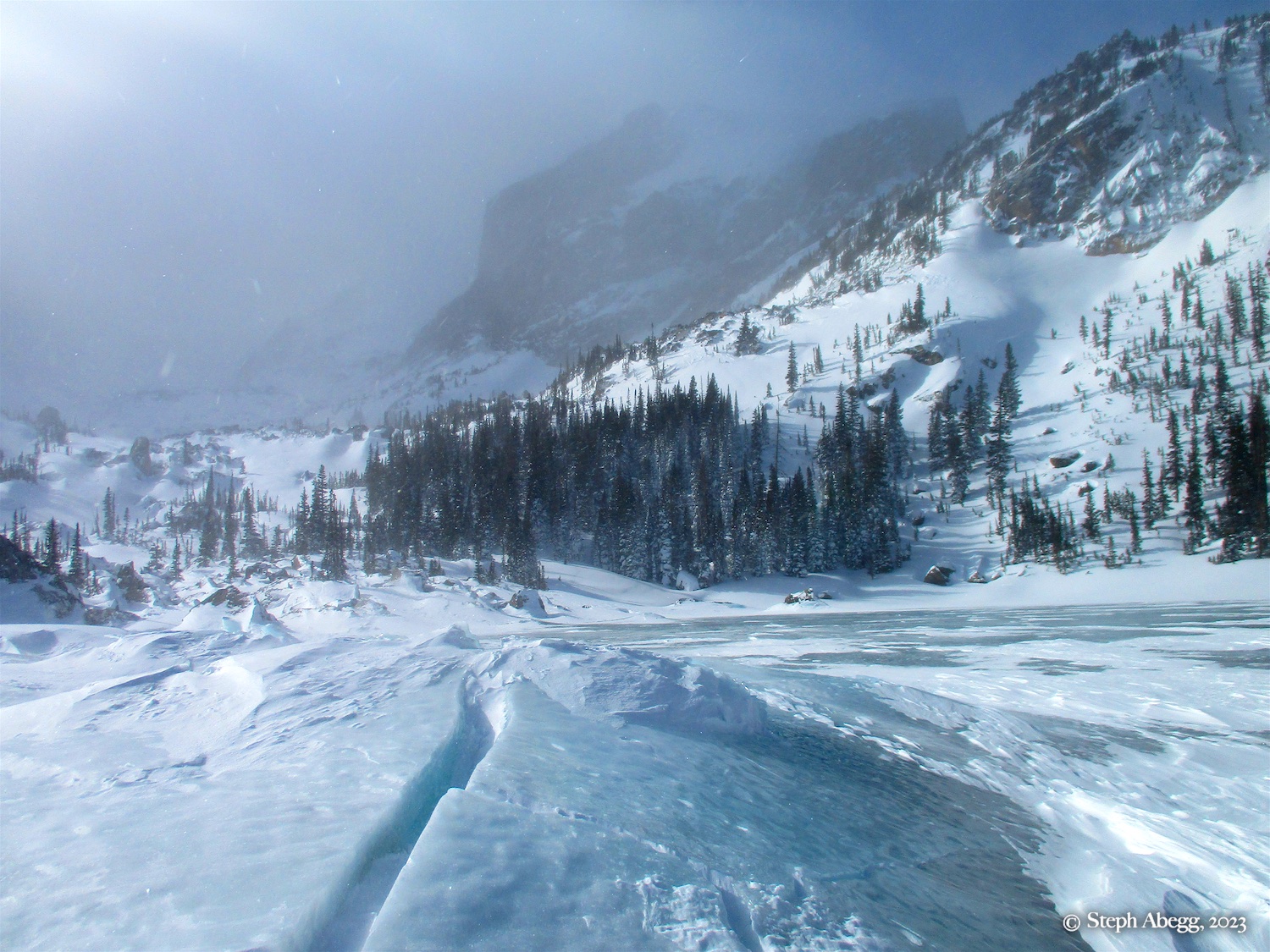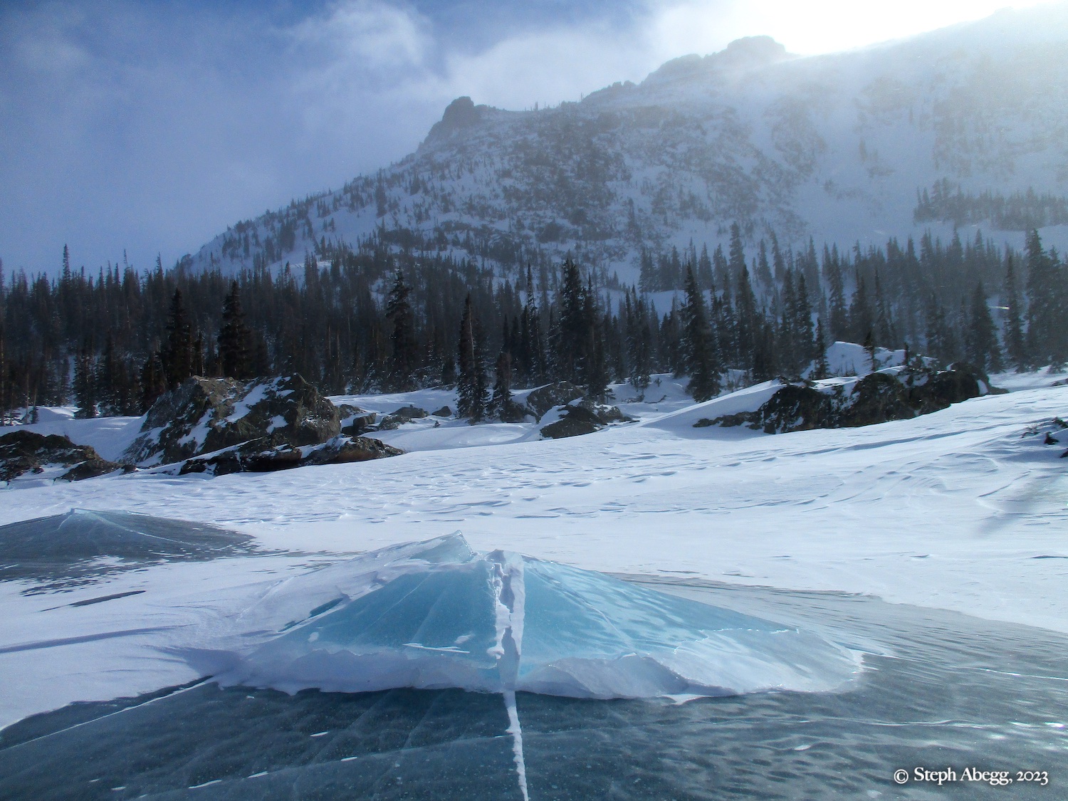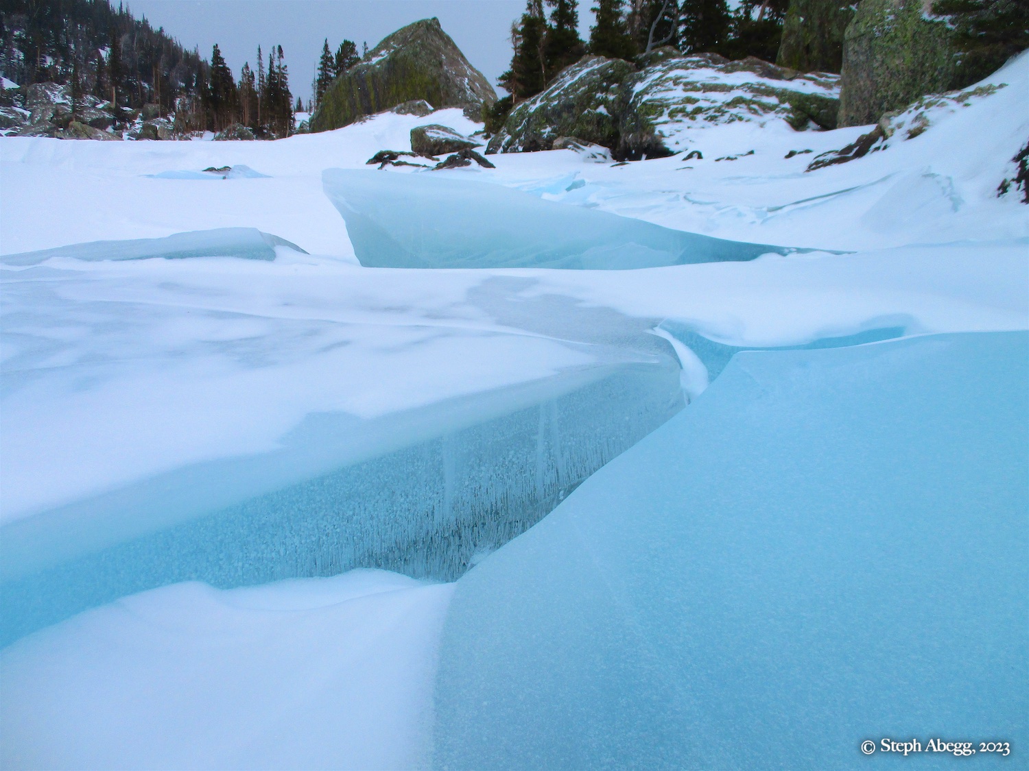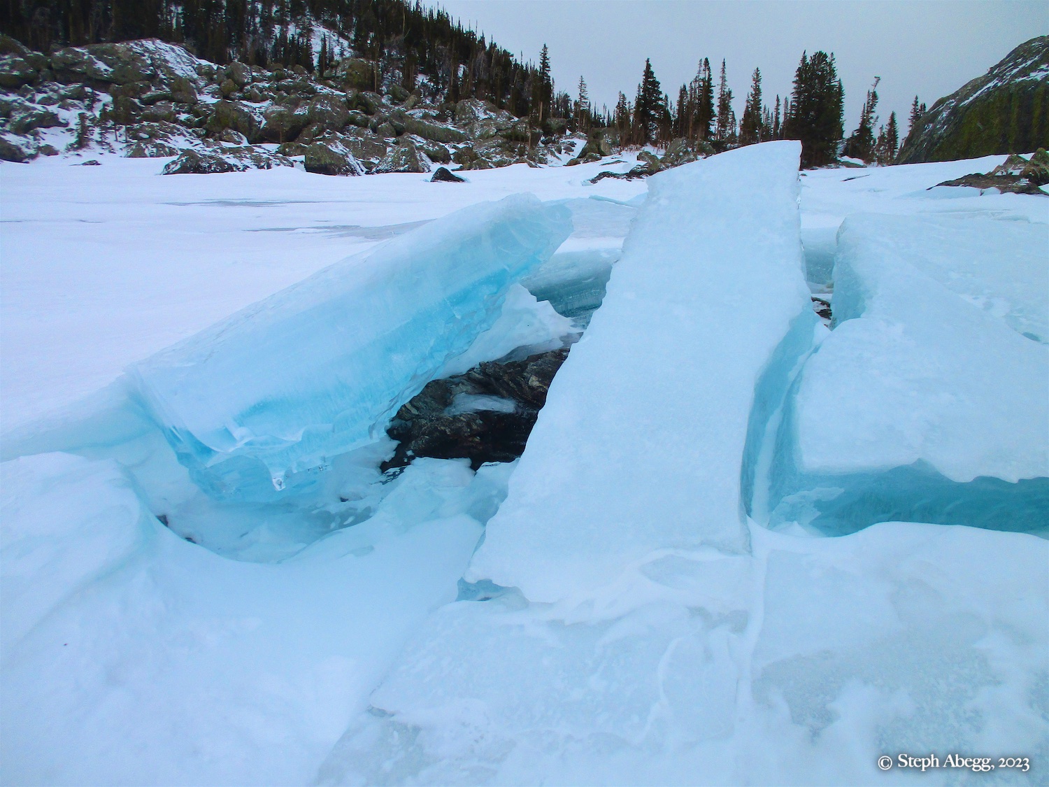 Indeed, the ice formations on Lake Haiyaha were quite fascinating! Most of the frozen lakes I have encountered in RMNP in the winter are relatively smooth and sometimes even glassy, but not Lake Haiyaha: The ice around the edges of the lake had been pushed up to create jagged edges and there were large cracked mounds of ice. There are giant boulders and rocks at the shore of Lake Haiyaha, so perhaps these "ice pimples" form over these boulders and rocks, which create disturbances in the flow of water.