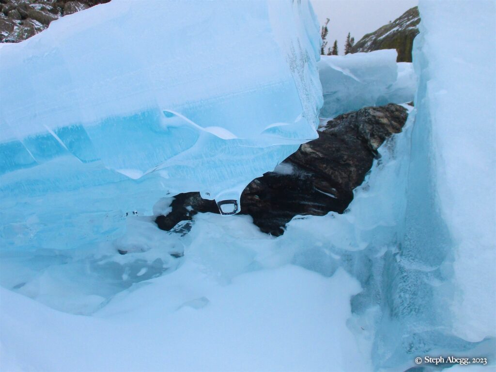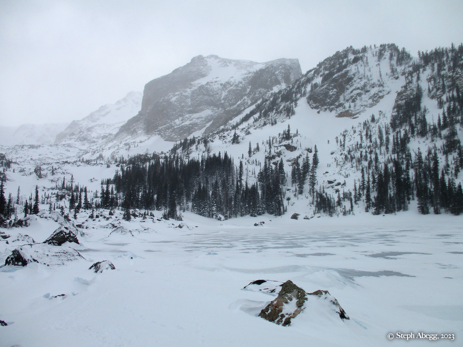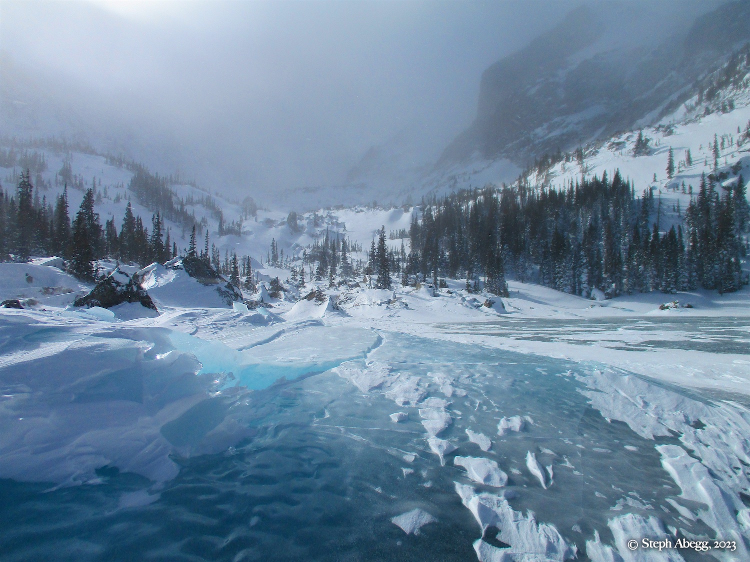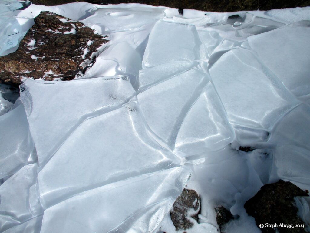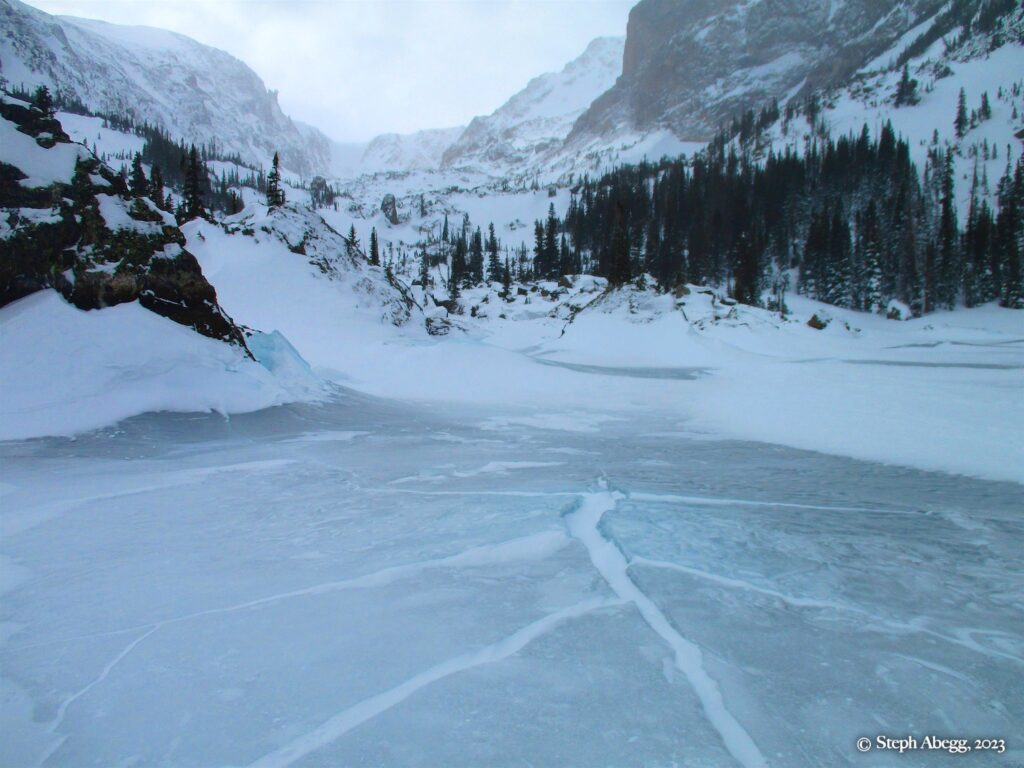 Indeed, the ice formations on Lake Haiyaha were quite fascinating! Most of the frozen lakes I have encountered in RMNP in the winter are relatively smooth and sometimes even glassy, but not Lake Haiyaha: The ice around the edges of the lake had been pushed up to create jagged edges and there were large cracked mounds of ice. There are giant boulders and rocks at the shore of Lake Haiyaha, so perhaps these "ice pimples" form over these boulders and rocks, which create disturbances in the flow of water.