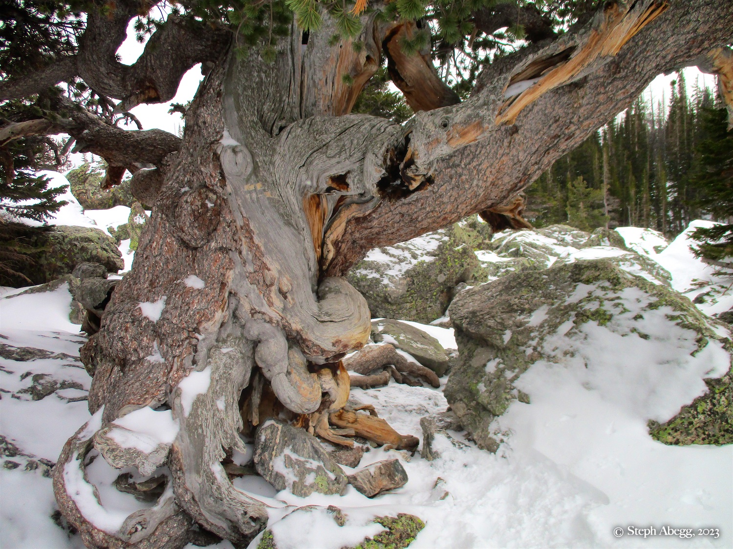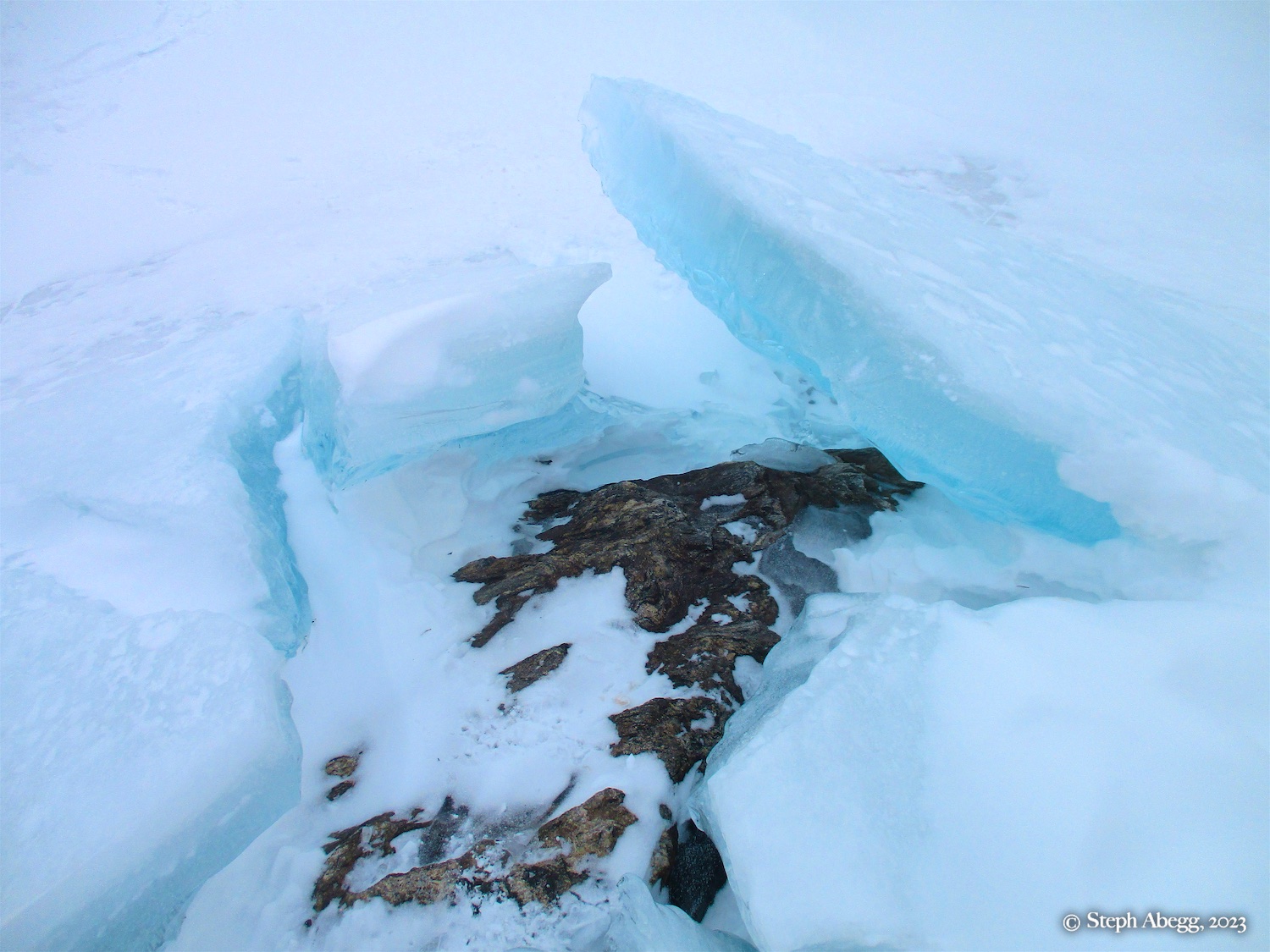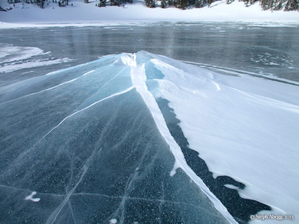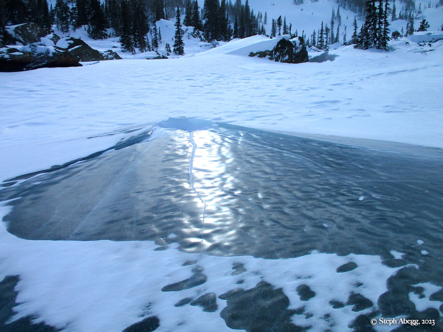 Indeed, the ice formations on Lake Haiyaha were quite fascinating! Most of the frozen lakes I have encountered in RMNP in the winter are relatively smooth and sometimes even glassy, but not Lake Haiyaha: The ice around the edges of the lake had been pushed up to create jagged edges and there were large cracked mounds of ice. There are giant boulders and rocks at the shore of Lake Haiyaha, so perhaps these "ice pimples" form over these boulders and rocks, which create disturbances in the flow of water.