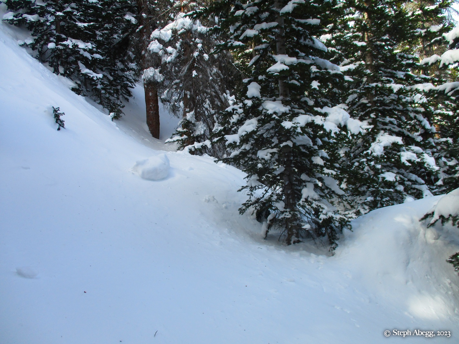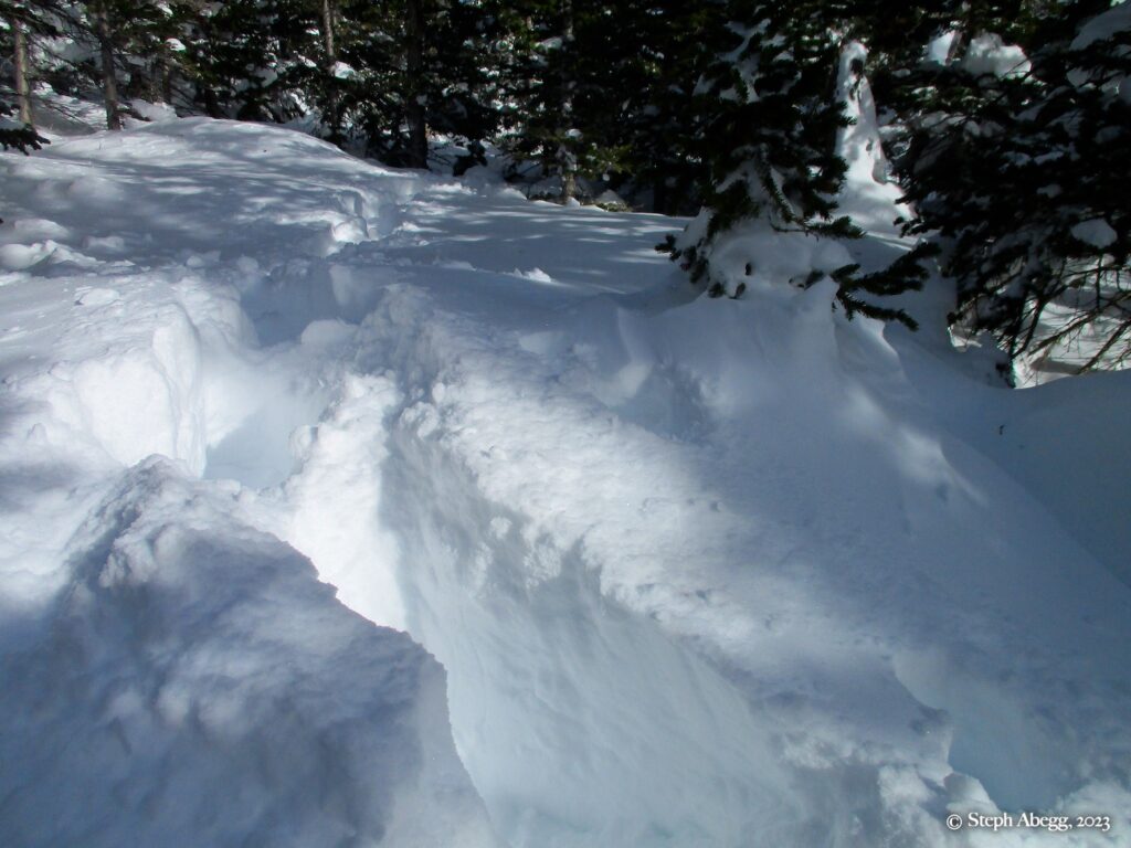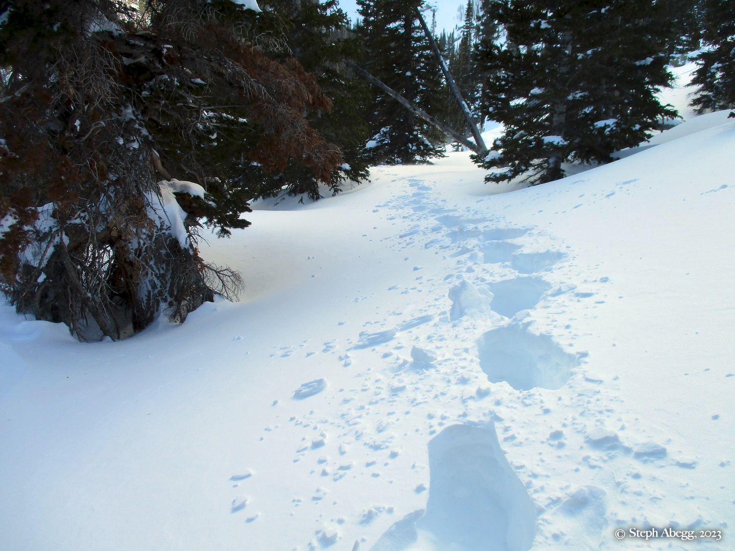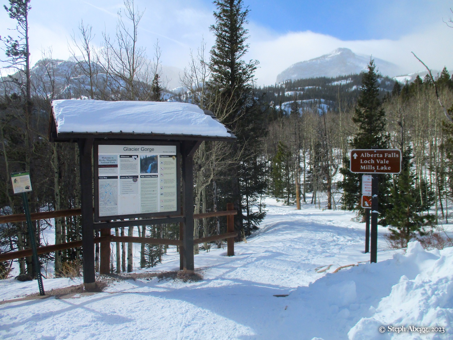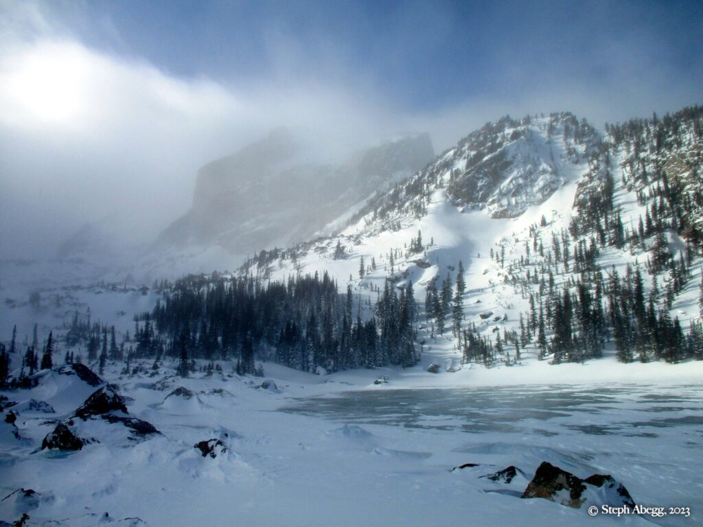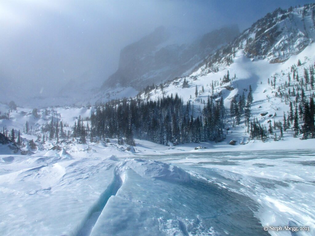 My round trip time starting and ending at the Bear Lake Trailhead was just under 2 hours (involving about 20 minutes photographing cool ice formations at Lake Haiyaha). It had not snowed recently and this is a popular area, so I did not bring or need snowshoes, but spikes were nice to have. (Note that you can also get to Lake Haiyaha by taking the Glacier Gorge trail up to the Mills Lake/Sky Pond junction—this is a longer way to go, but could be used to create a nice loop or avoid a short section of open slope on the direct approach from Bear Lake. In fact, a couple of weeks after my first visit to Lake Haiyaha, I returned to Lake Haiyaha via the Glacier Gorge approach. It had snowed just before this second trip to Lake Haiyaha, making snowshoes necessary and adding some extra wallowing exercise to the trip. Photos from this trip are given on this page as well.)