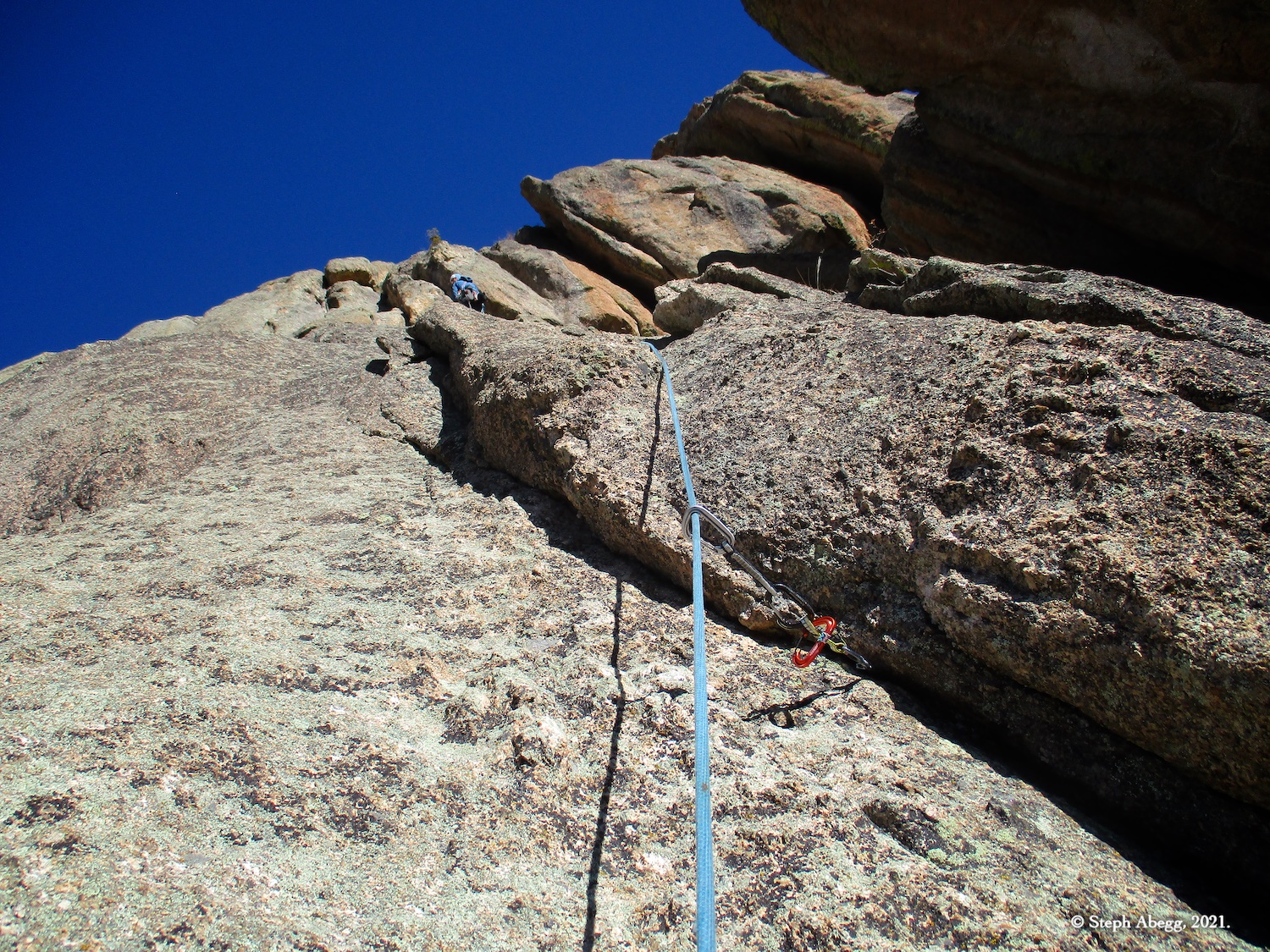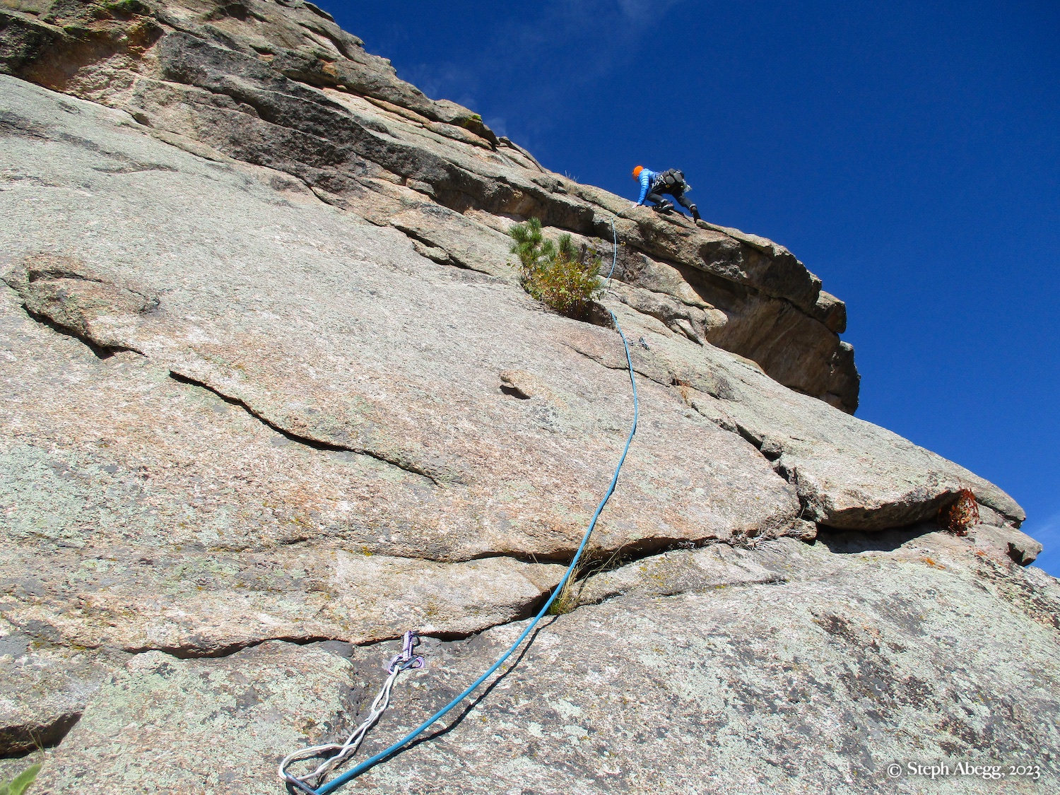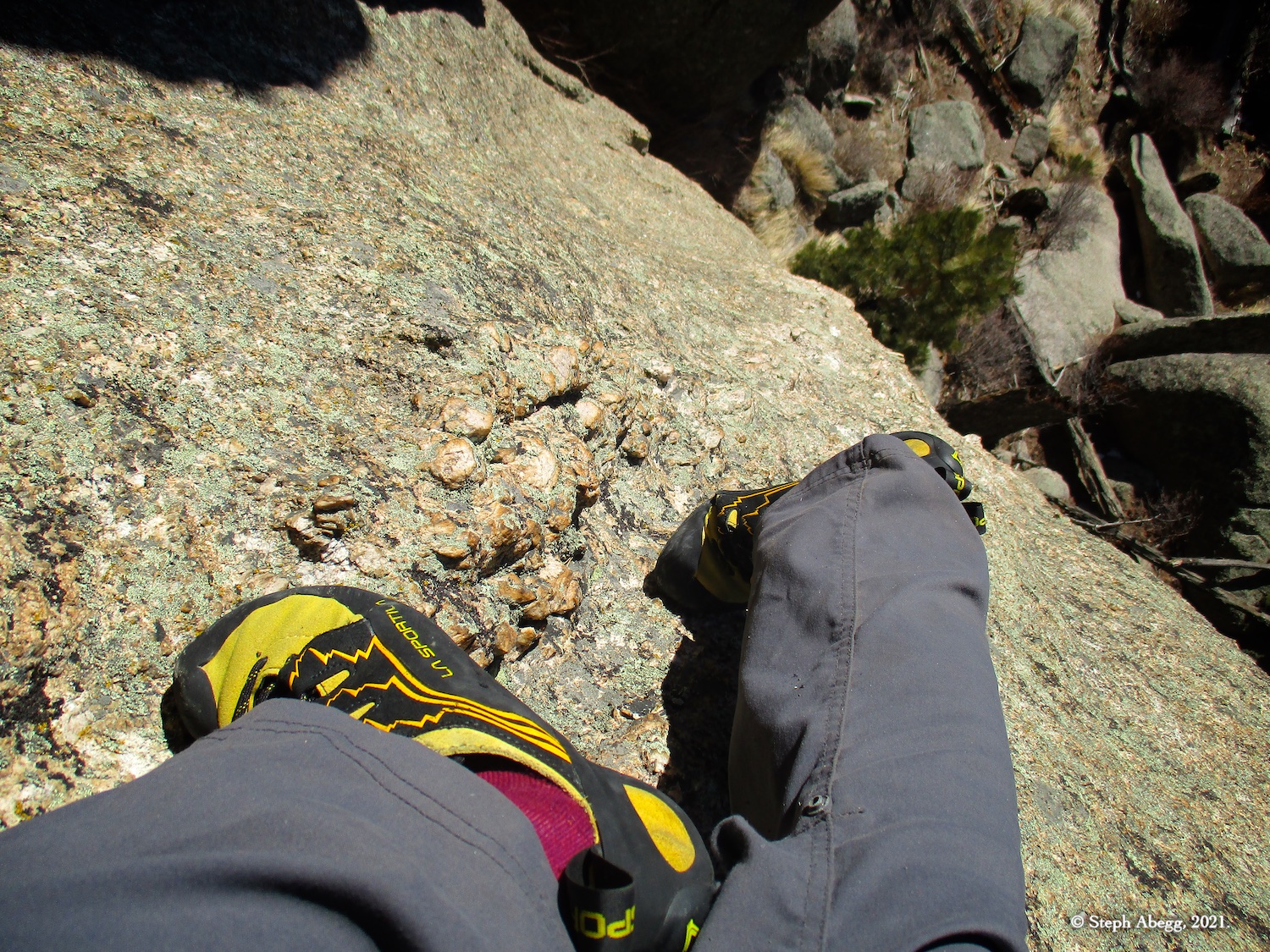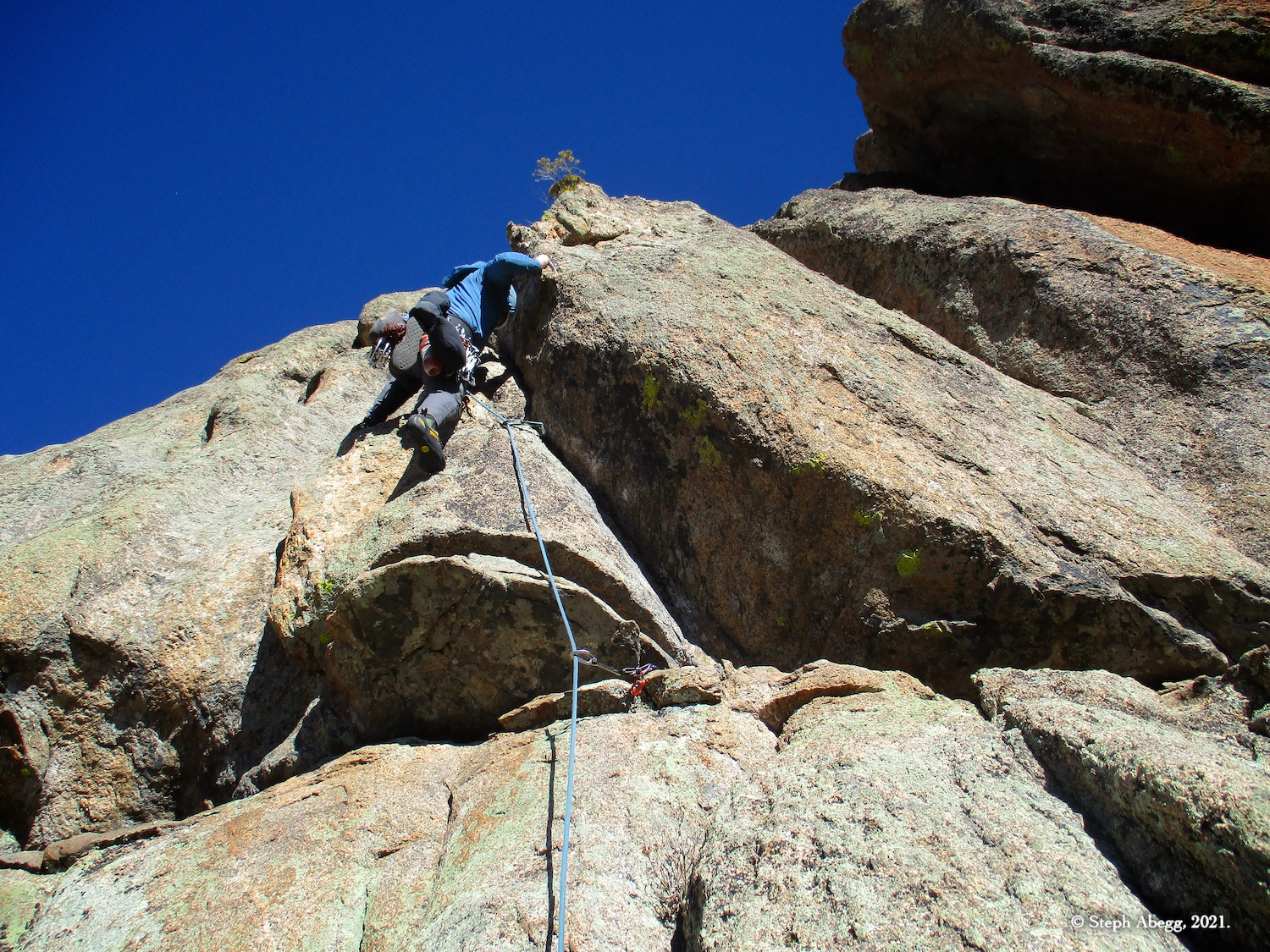 This was a fun 6+ pitch link-up of the three main features in the Batman Rock area. We started off with Crystal Catch on Checkerboard Rock. From the top of Checkerboard Rock, a 5 minute scramble brought us to the base of Batman Pinnacle. We climbed the classic Batman and Robin route to the top of the pinnacle, then did a short rap off an anchor on top to the base of Batman Rock across the way, and climbed Hand Jive to the top of Batman Rock. It was one of those unusually warm and calm winter days where Lumpy is just the best place to be.