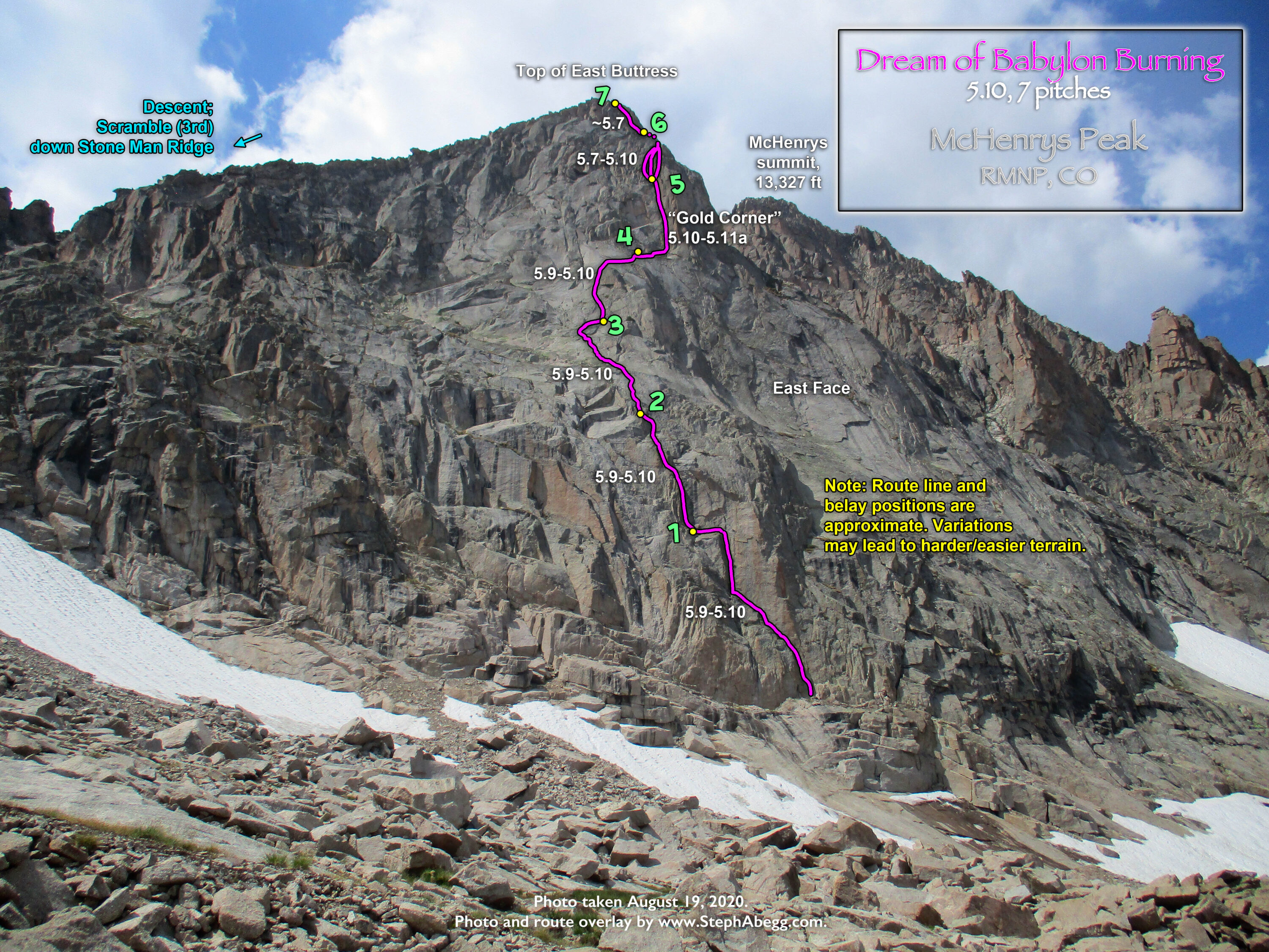 | 1-2. Our bivy cave. Arrowhead behind. 3. Water near the bivy. It was about 5 minutes left of the bivy at about the same elevation. 4. Plenty of room inside the bivy cave to hang packs. 5. An old piton in the roof of the bivy cave. 6-7. Pretty rainbow above Longs and Spearhead. 8. Evening light from the bivy. 9. Nate made a yummy looking sandwich for dinner. 10. Part of my dinner. 11. Citronella candle with a couple of dead bugs in it. 12. A cozy night at the bivy. 13. A cozy night at the bivy. 14. A nice morning from the bivy, 15. Nice light on Spearhead. 16. Some big mica crystals. 17. Flowers. 18. I found an old summit register for McHenrys in the boulder field below McHenrys. It entertained me for an hour at camp. |