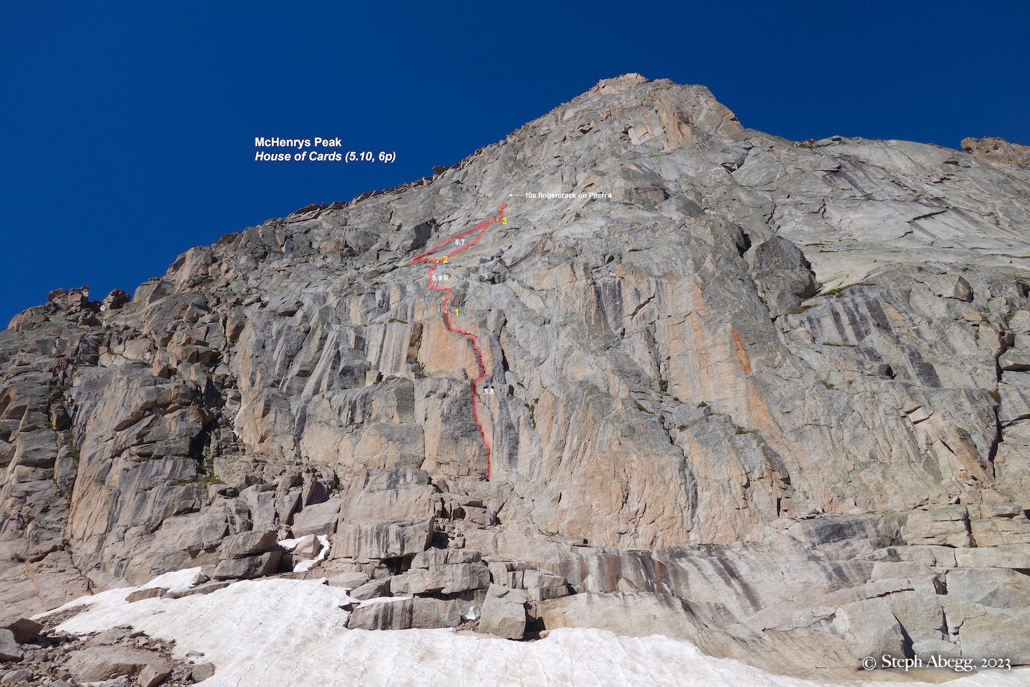 The following page gives an overlay and pitch-by-pitch photos of the climb of the North Buttress (5.7, 6p) of Pagoda, and below that a photo smorgasbord from our mini work vacation hanging out in Upper Glacier Gorge. Enjoy!