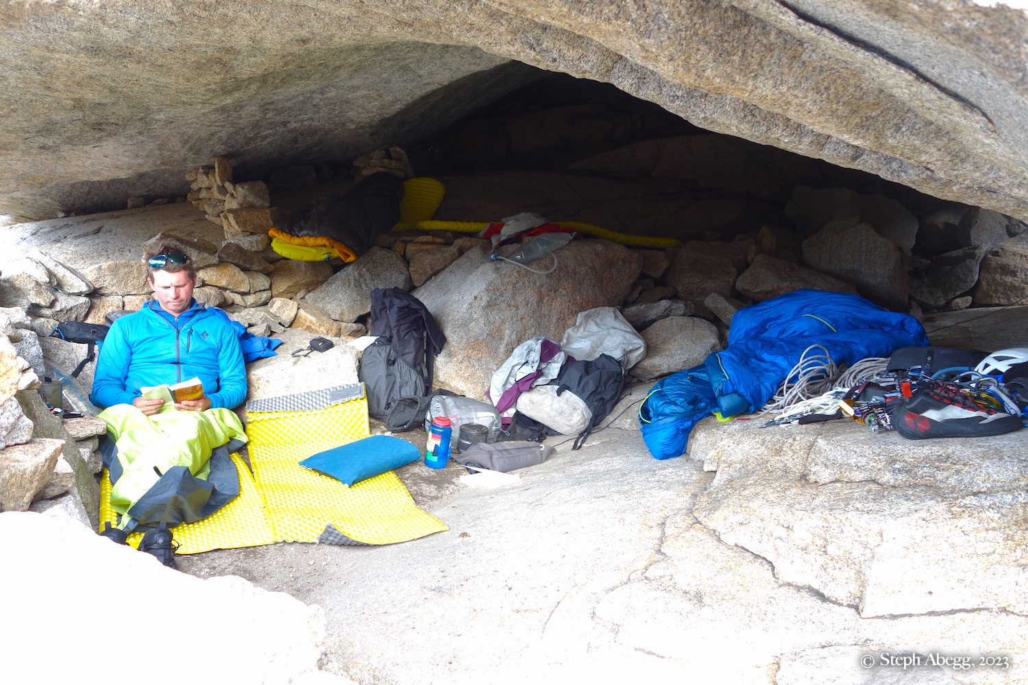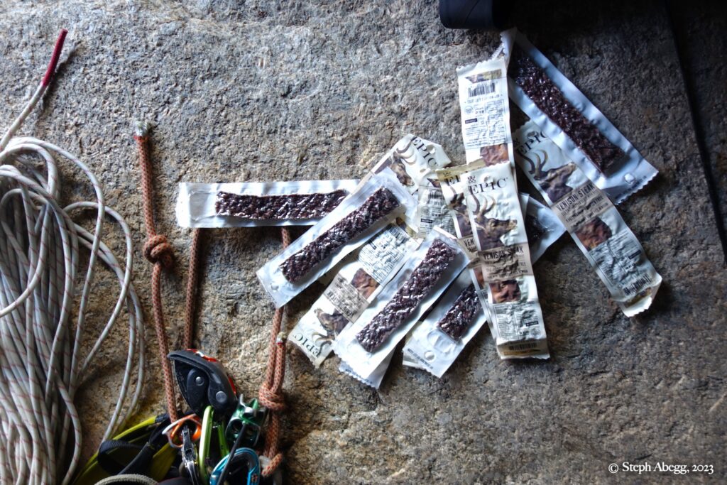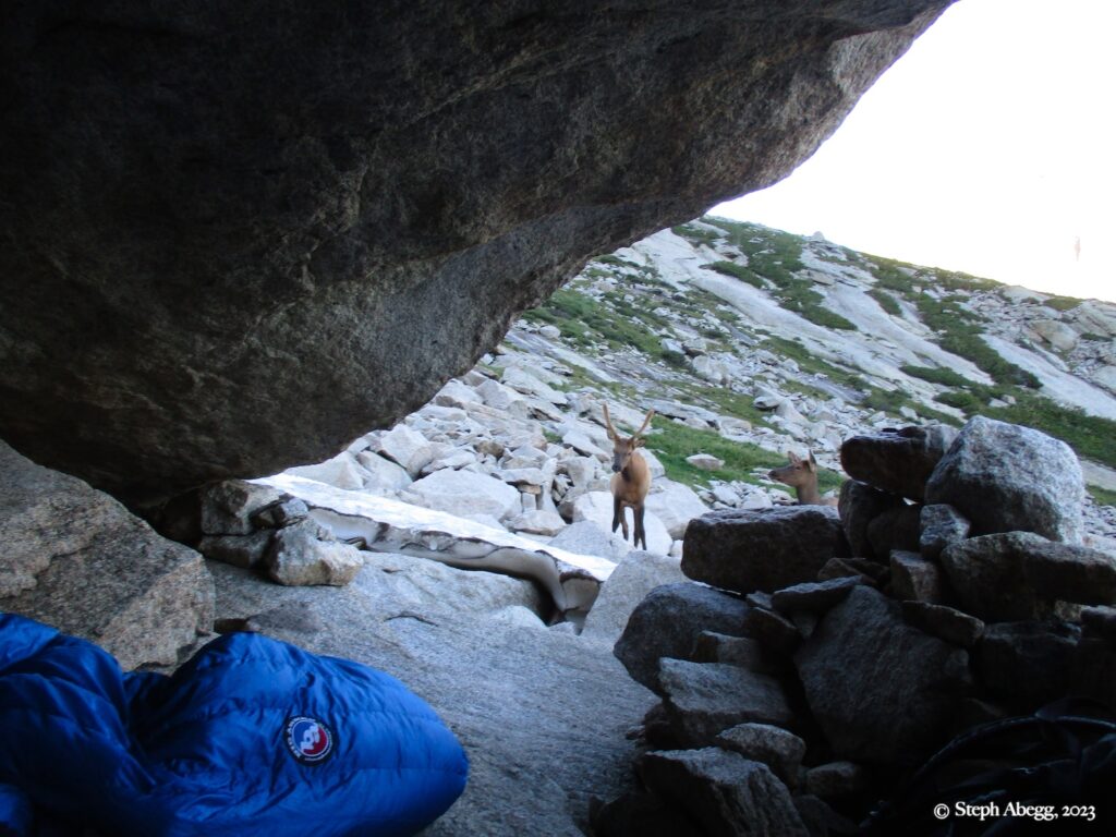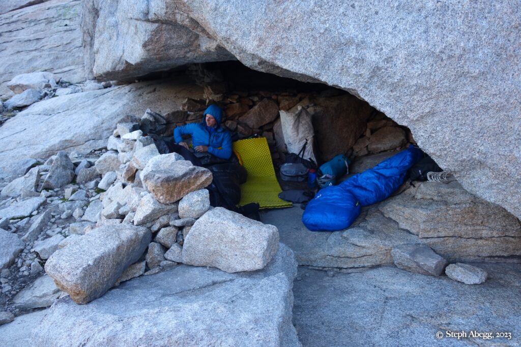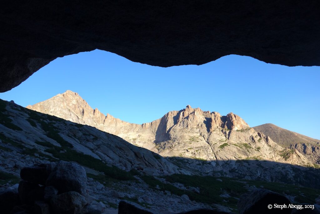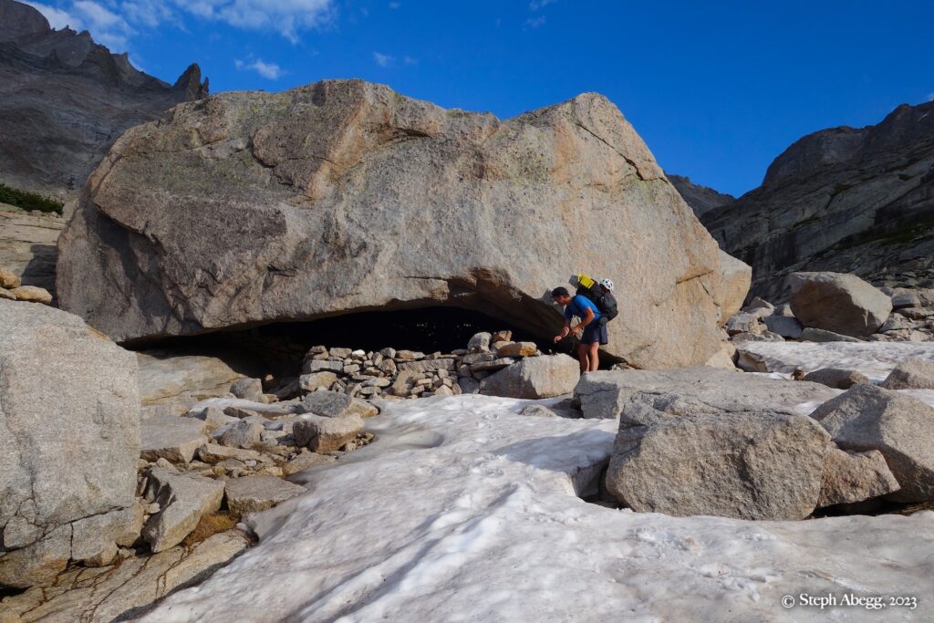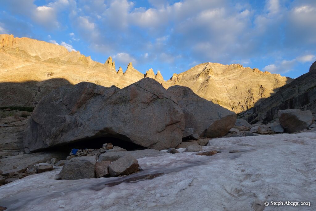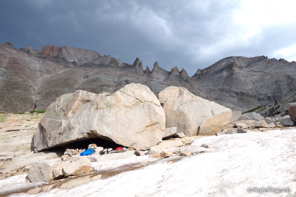 If you are climbing a route that is at least four pitches, you can get a bivy permit to camp up high in the park. Upper Glacier Gorge is one of Nate and my favorite places to bivy. There are bivy sites nestled under boulders. On this trip we stayed at one of our favorite bivy locations underneath a giant boulder.