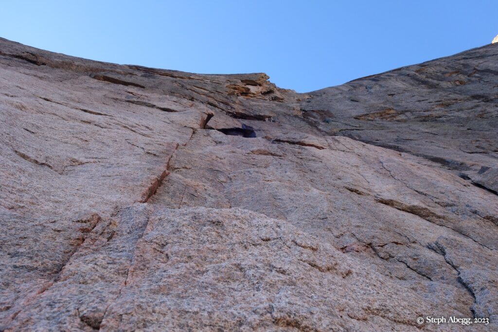 Climb up and right on white rock, traverse left under a roof, and continue to a good stance in a chimney. This was my favorite pitch on the route.