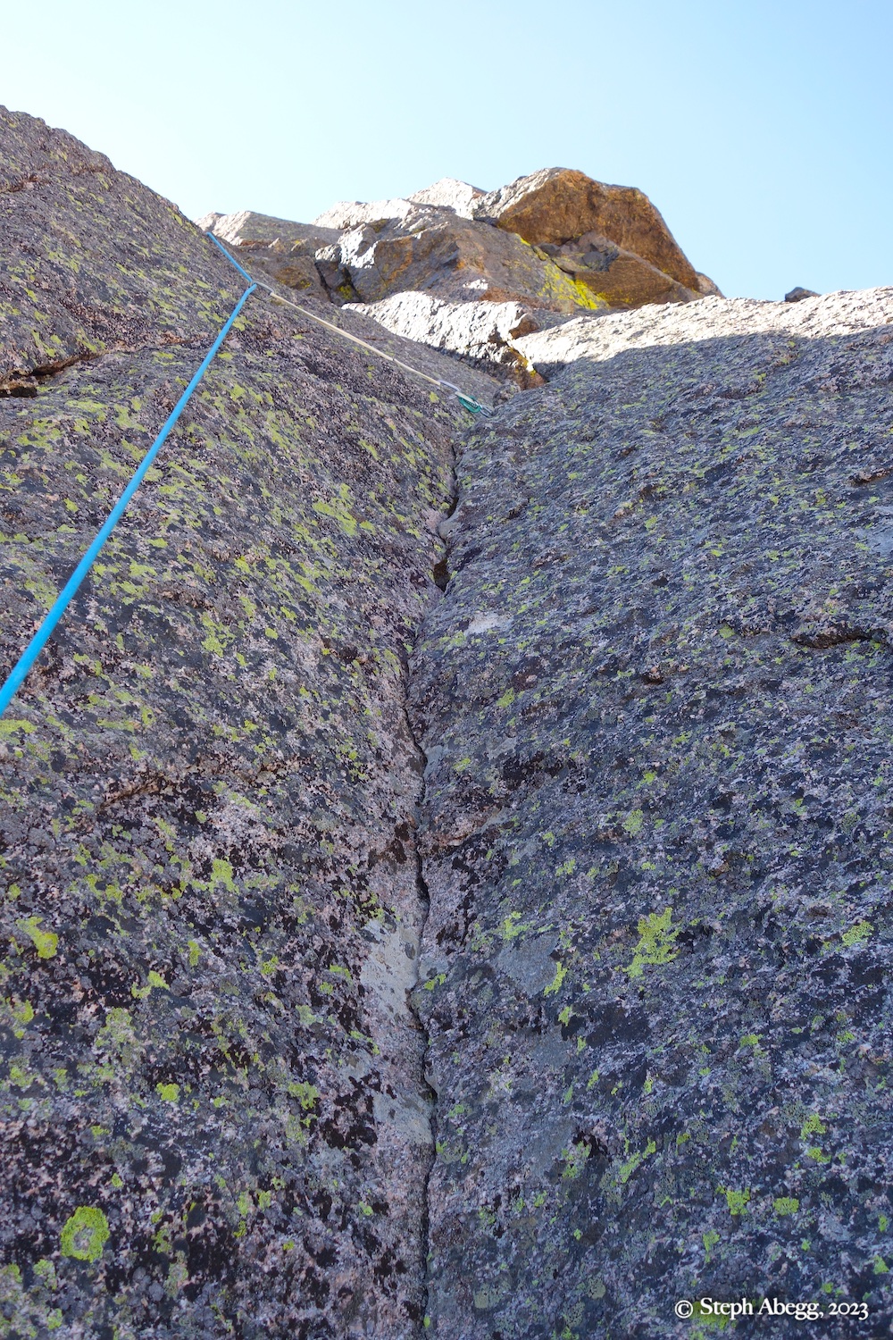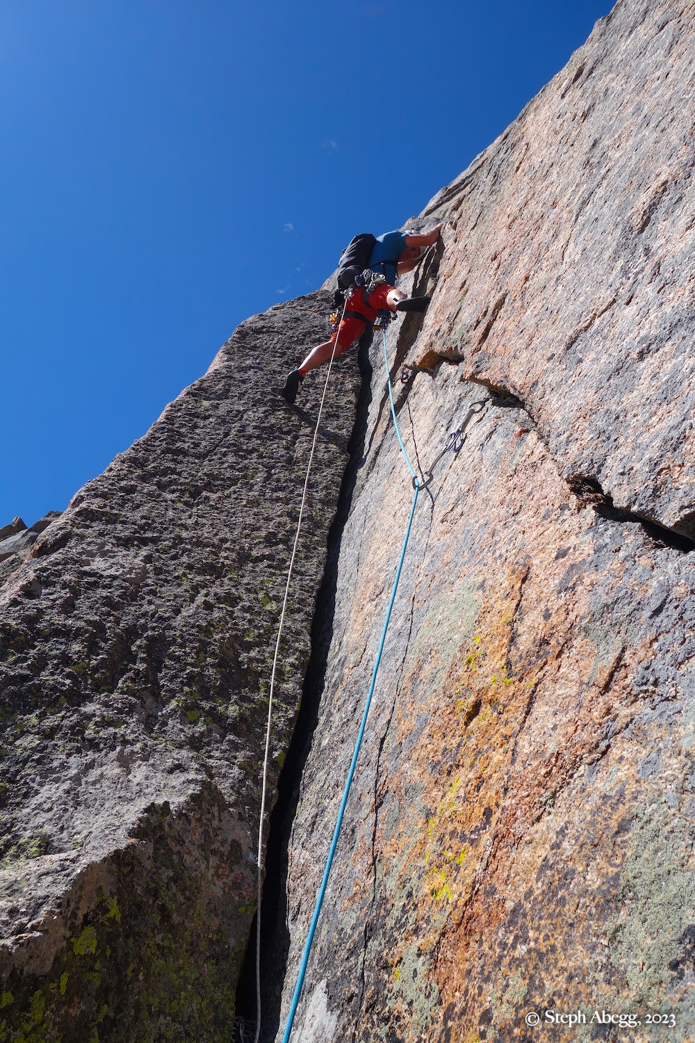 We climbed Pitches 1-3 as two long pitches with a little bit of simulclimbing on each.