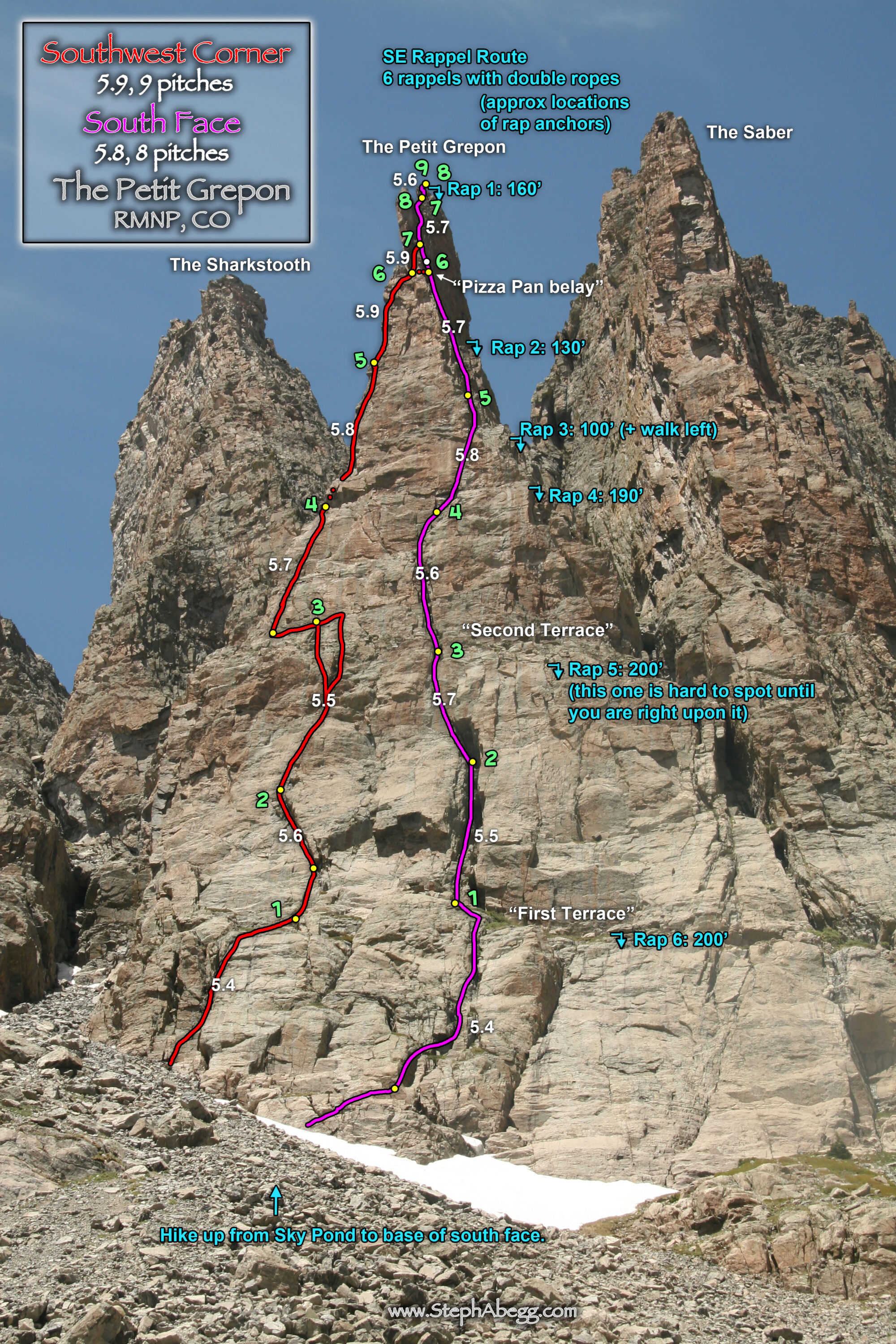 If I was to climb only one thing in the Park, I wanted to climb the South Face of the Petit Grepon, one of Steck and Roper’s Fifty Classics. It is a 8-pitch 5.8 route on a cool spire just 4.5 miles up from the Glacier Gorge trailhead.