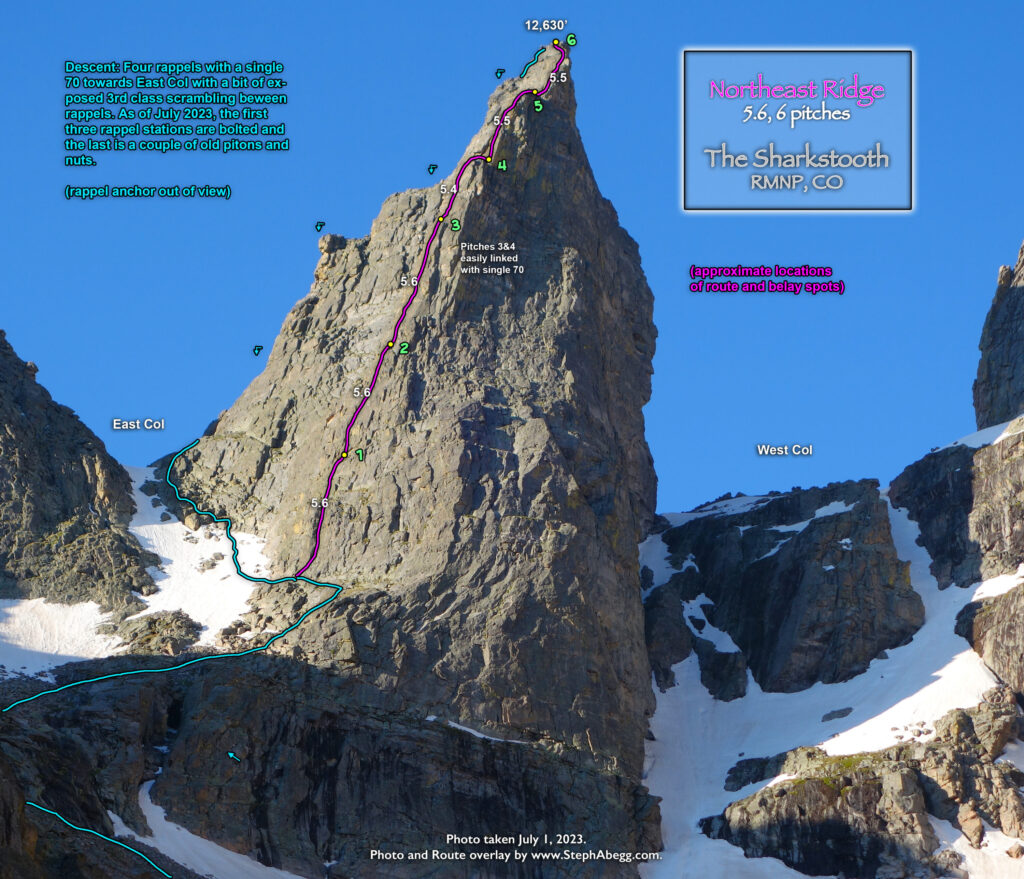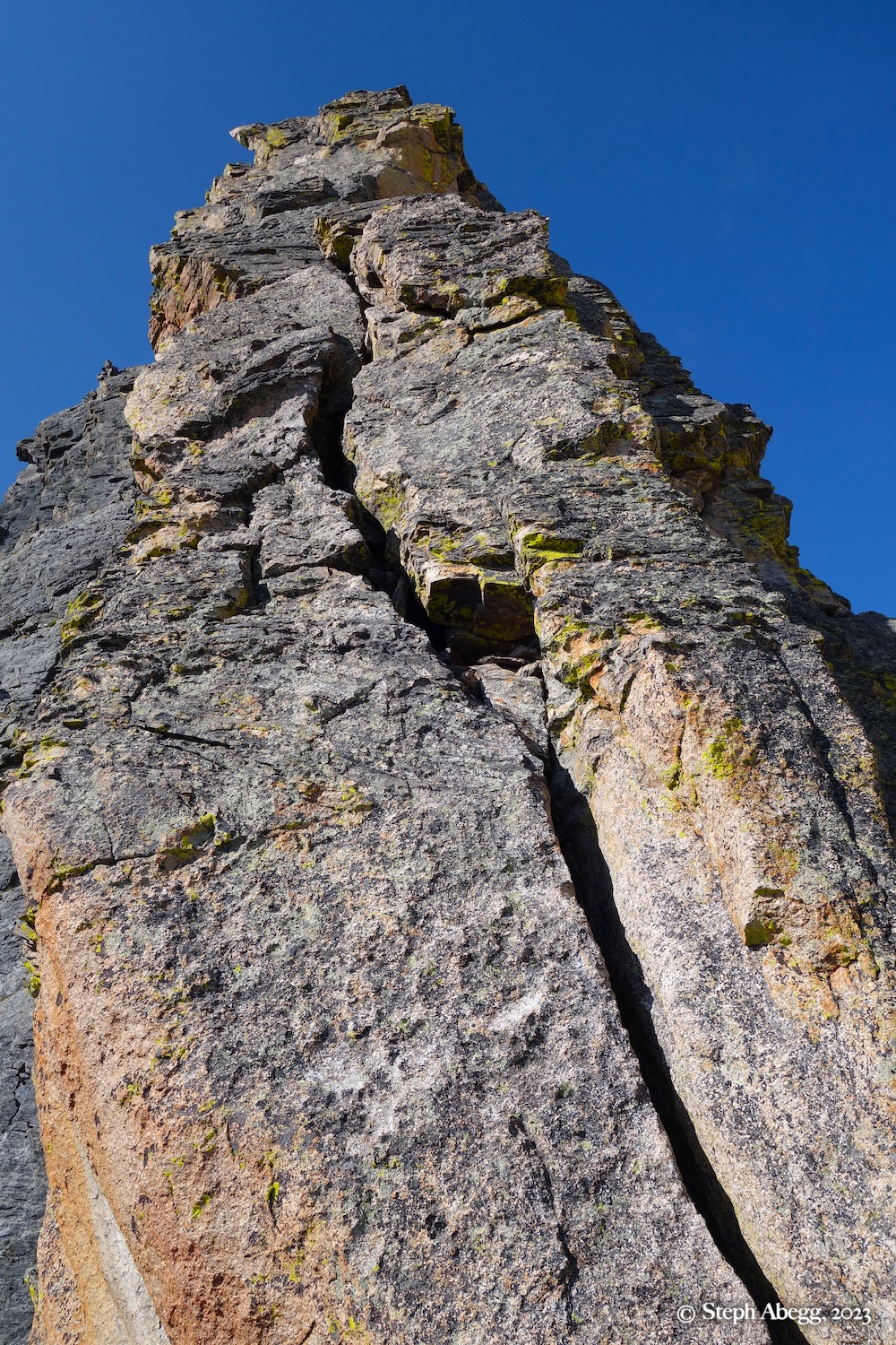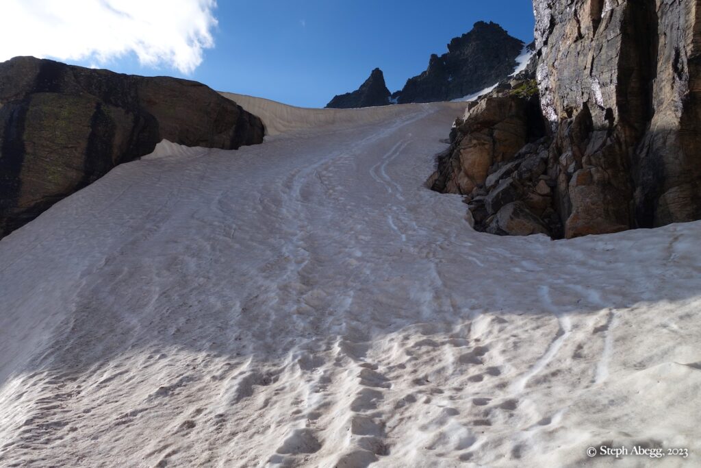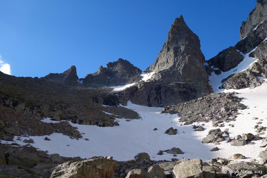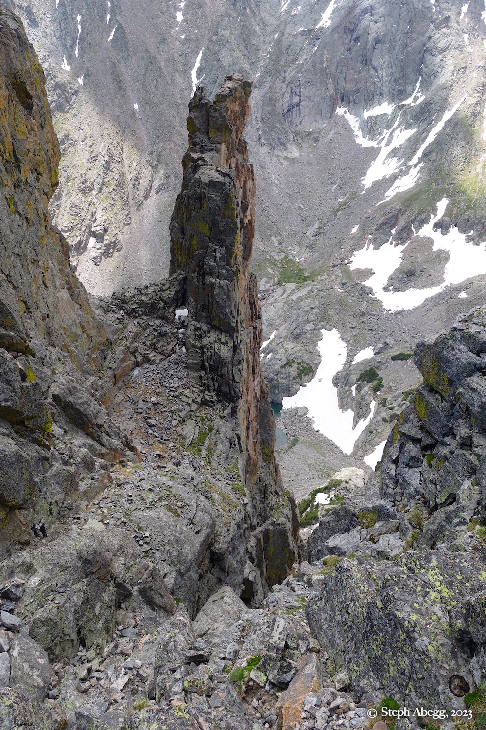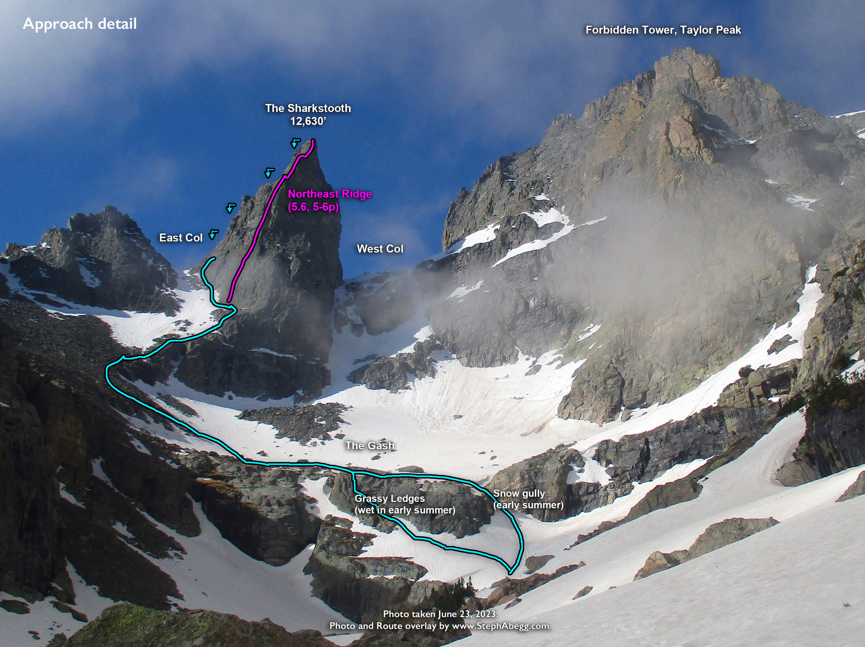 Approach from the Andrews Glacier Trail and The Gash. The Gash is a rugged valley of oversized talus on the "backside" of Cathedral Spires, about 0.7 miles up the Andrews Glacier Trail. The Gash provides access to the East Col, The Sharkstooth, West Col, and Northeast Spur of Taylor Peak. It also provides a safe (but long) return fromt he summits of The Foil, The Saber, and The Petit Grepon. A low cliff hand blocks access to the upper valley. Climb a narrow snow gully trough the middle of the cliff, or scramble up a series of big steps to the left. The valley splits above the cliff. The left branch heads to The Saber, the East Col, and the East Face of the Sharsktooth. The right branch leads to the West Col, West Fin of The Sharkstooth, and the Northeast Spur of Taylor Peak.