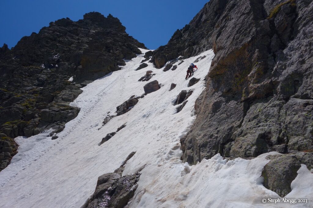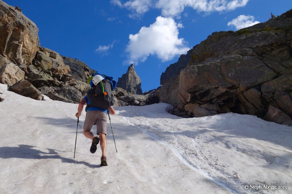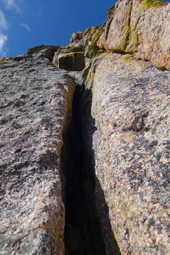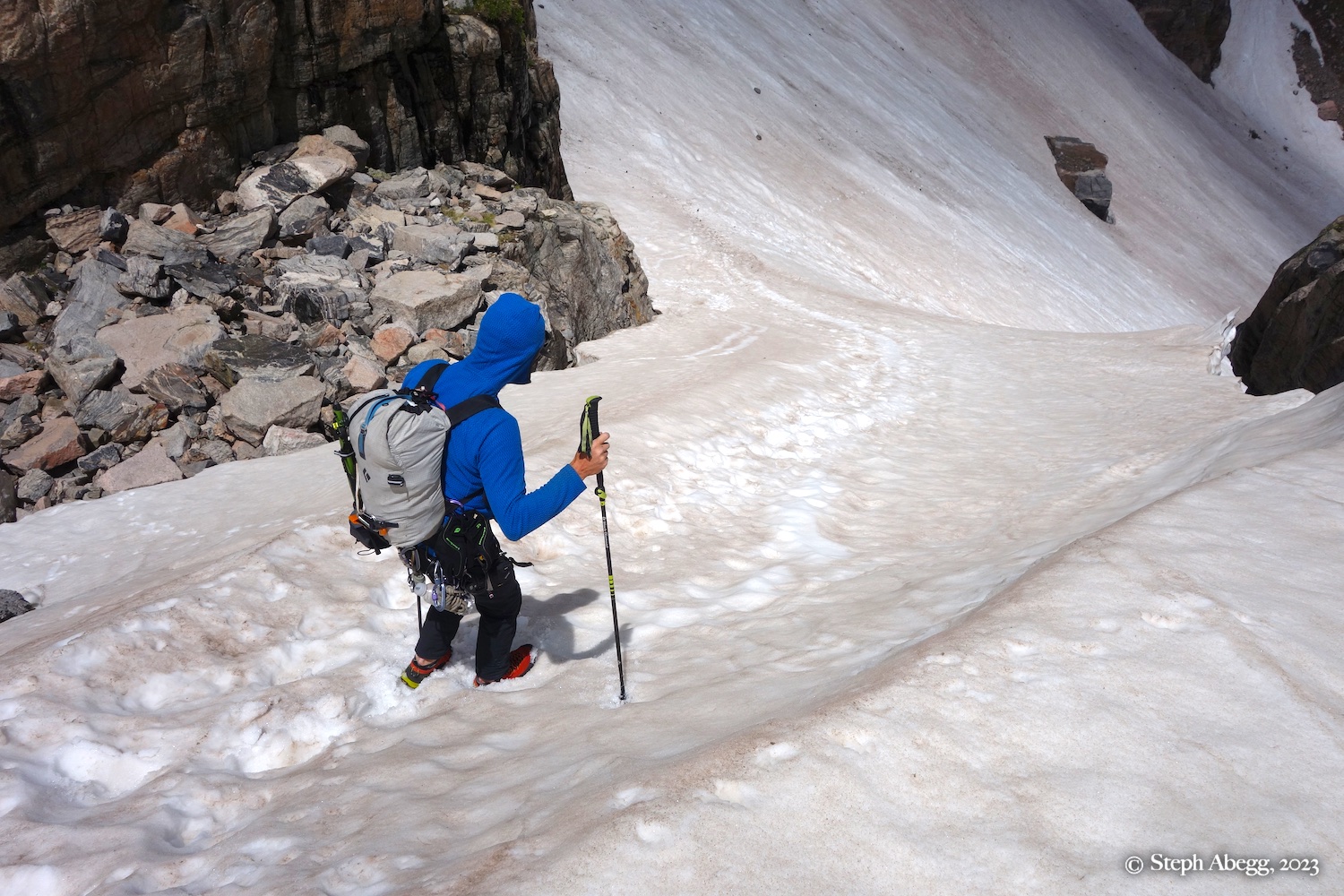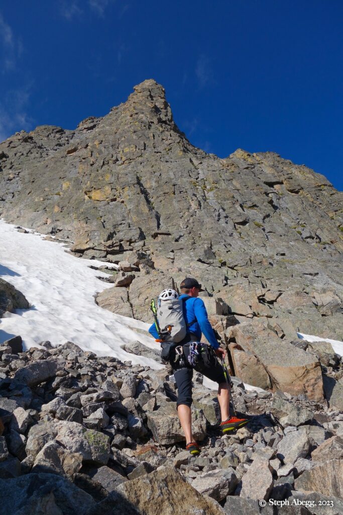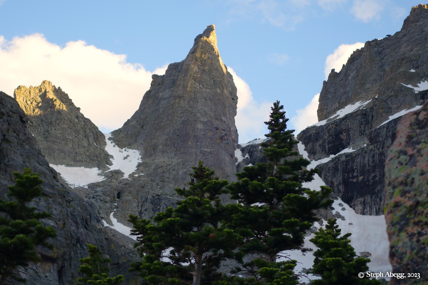 Approach from the Andrews Glacier Trail and The Gash. The Gash is a rugged valley of oversized talus on the "backside" of Cathedral Spires, about 0.7 miles up the Andrews Glacier Trail. The Gash provides access to the East Col, The Sharkstooth, West Col, and Northeast Spur of Taylor Peak. It also provides a safe (but long) return fromt he summits of The Foil, The Saber, and The Petit Grepon. A low cliff hand blocks access to the upper valley. Climb a narrow snow gully trough the middle of the cliff, or scramble up a series of big steps to the left. The valley splits above the cliff. The left branch heads to The Saber, the East Col, and the East Face of the Sharsktooth. The right branch leads to the West Col, West Fin of The Sharkstooth, and the Northeast Spur of Taylor Peak.
