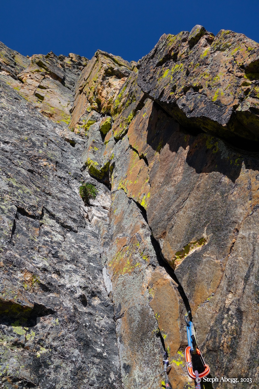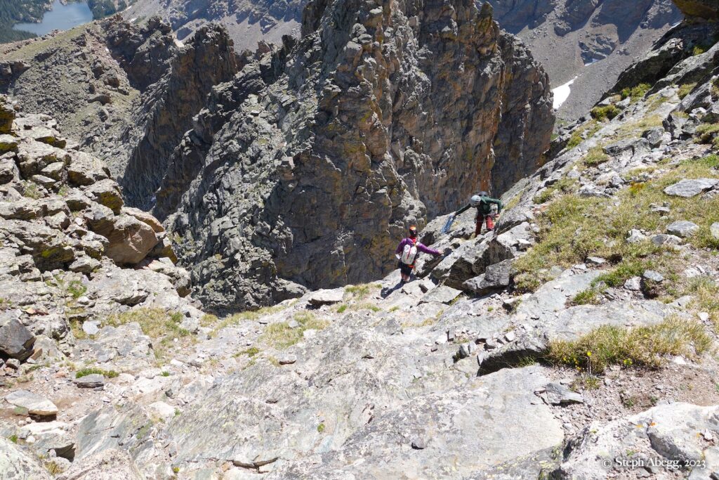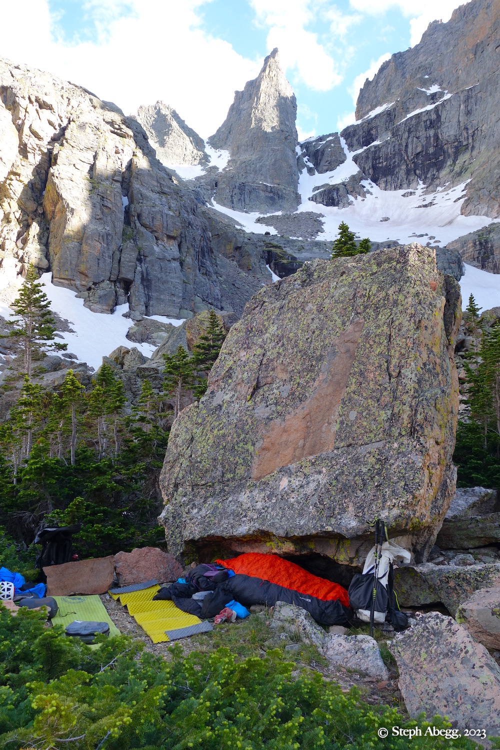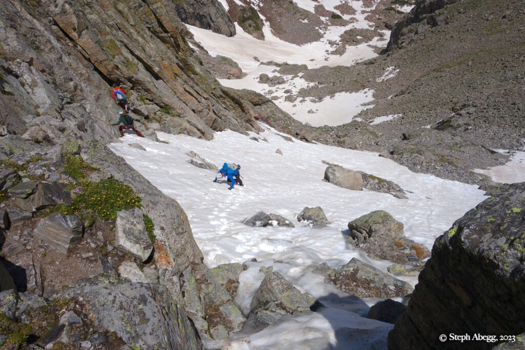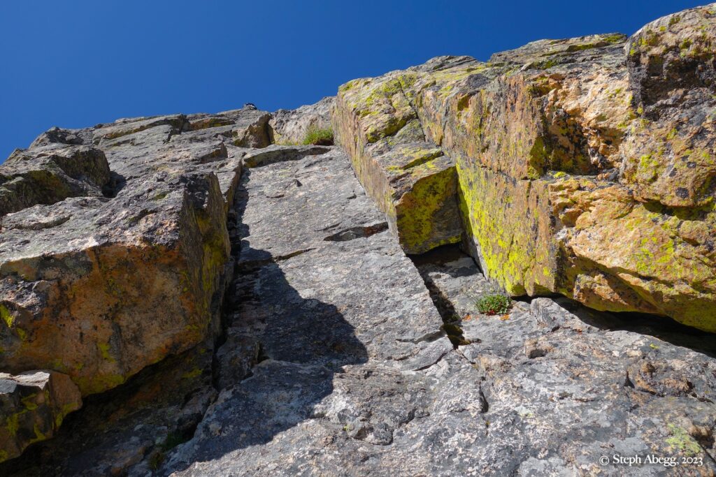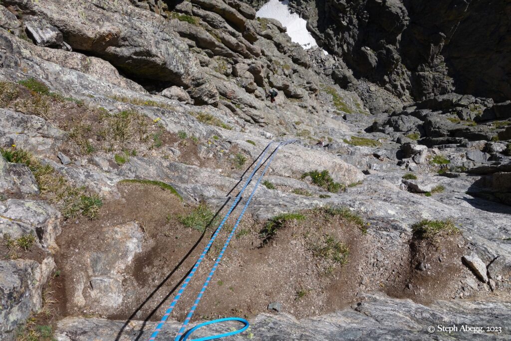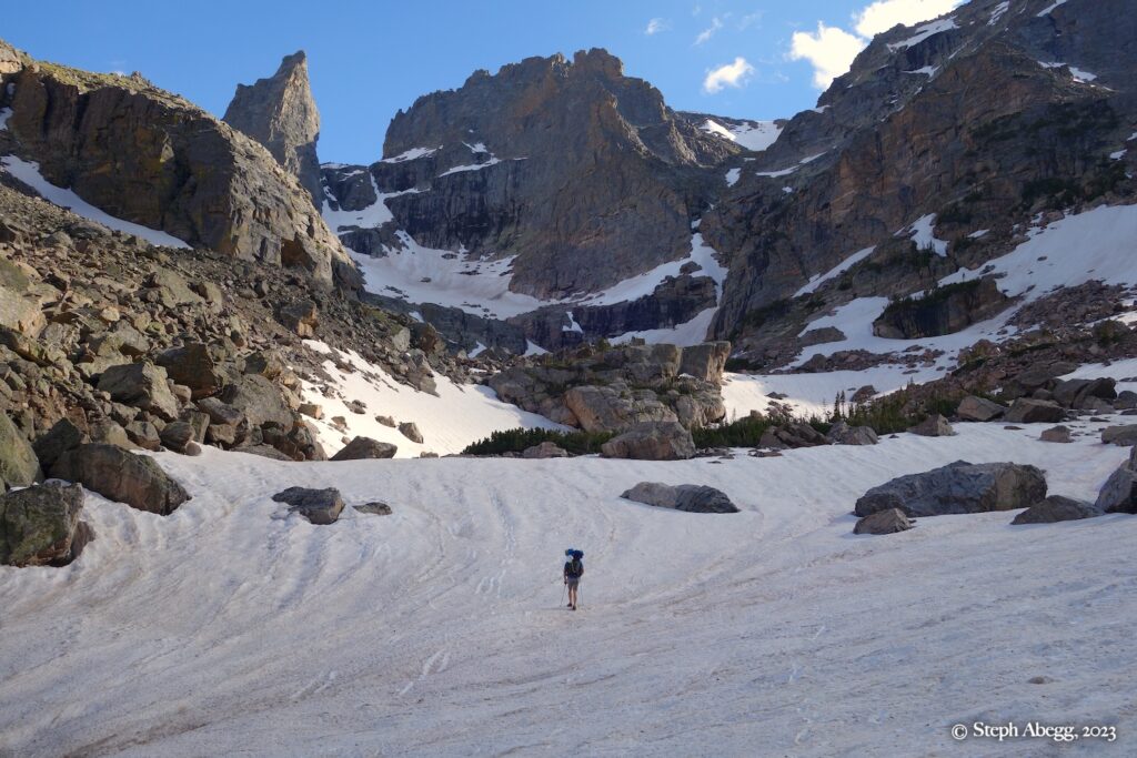 Approach from the Andrews Glacier Trail and The Gash. The Gash is a rugged valley of oversized talus on the "backside" of Cathedral Spires, about 0.7 miles up the Andrews Glacier Trail. The Gash provides access to the East Col, The Sharkstooth, West Col, and Northeast Spur of Taylor Peak. It also provides a safe (but long) return fromt he summits of The Foil, The Saber, and The Petit Grepon. A low cliff hand blocks access to the upper valley. Climb a narrow snow gully trough the middle of the cliff, or scramble up a series of big steps to the left. The valley splits above the cliff. The left branch heads to The Saber, the East Col, and the East Face of the Sharsktooth. The right branch leads to the West Col, West Fin of The Sharkstooth, and the Northeast Spur of Taylor Peak.