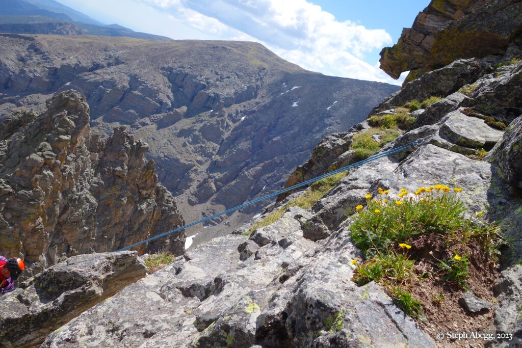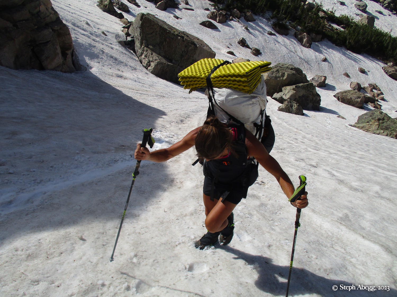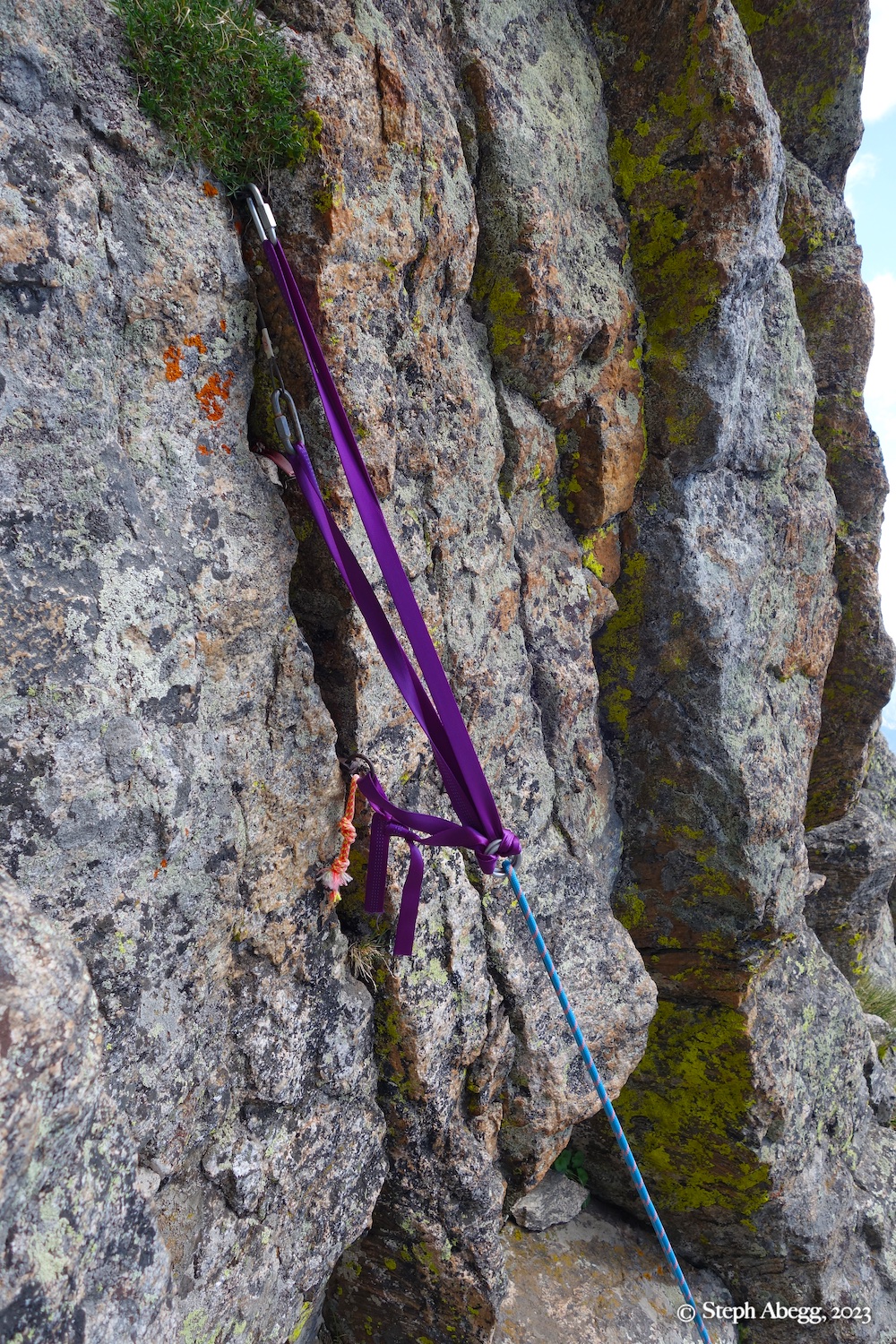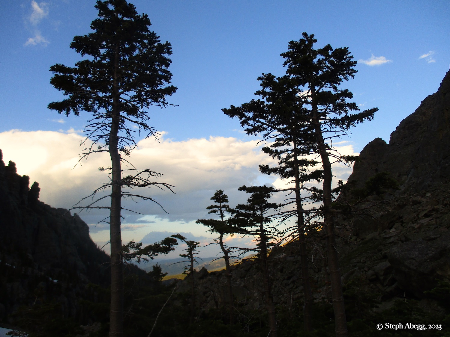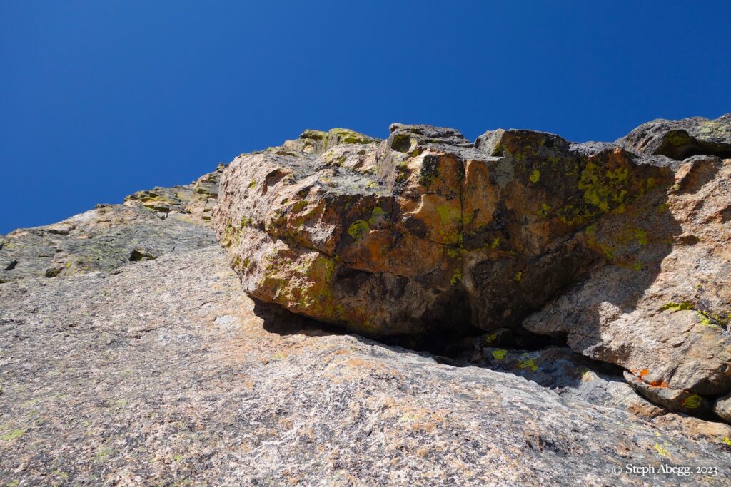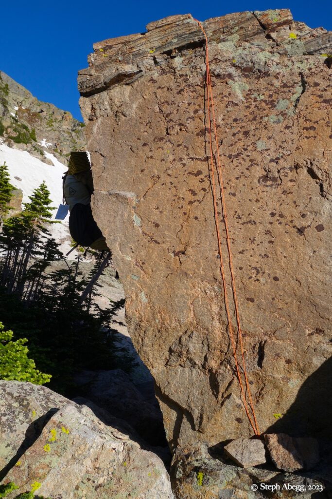 Approach from the Andrews Glacier Trail and The Gash. The Gash is a rugged valley of oversized talus on the "backside" of Cathedral Spires, about 0.7 miles up the Andrews Glacier Trail. The Gash provides access to the East Col, The Sharkstooth, West Col, and Northeast Spur of Taylor Peak. It also provides a safe (but long) return fromt he summits of The Foil, The Saber, and The Petit Grepon. A low cliff hand blocks access to the upper valley. Climb a narrow snow gully trough the middle of the cliff, or scramble up a series of big steps to the left. The valley splits above the cliff. The left branch heads to The Saber, the East Col, and the East Face of the Sharsktooth. The right branch leads to the West Col, West Fin of The Sharkstooth, and the Northeast Spur of Taylor Peak.
