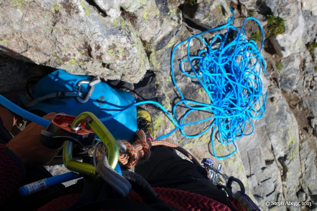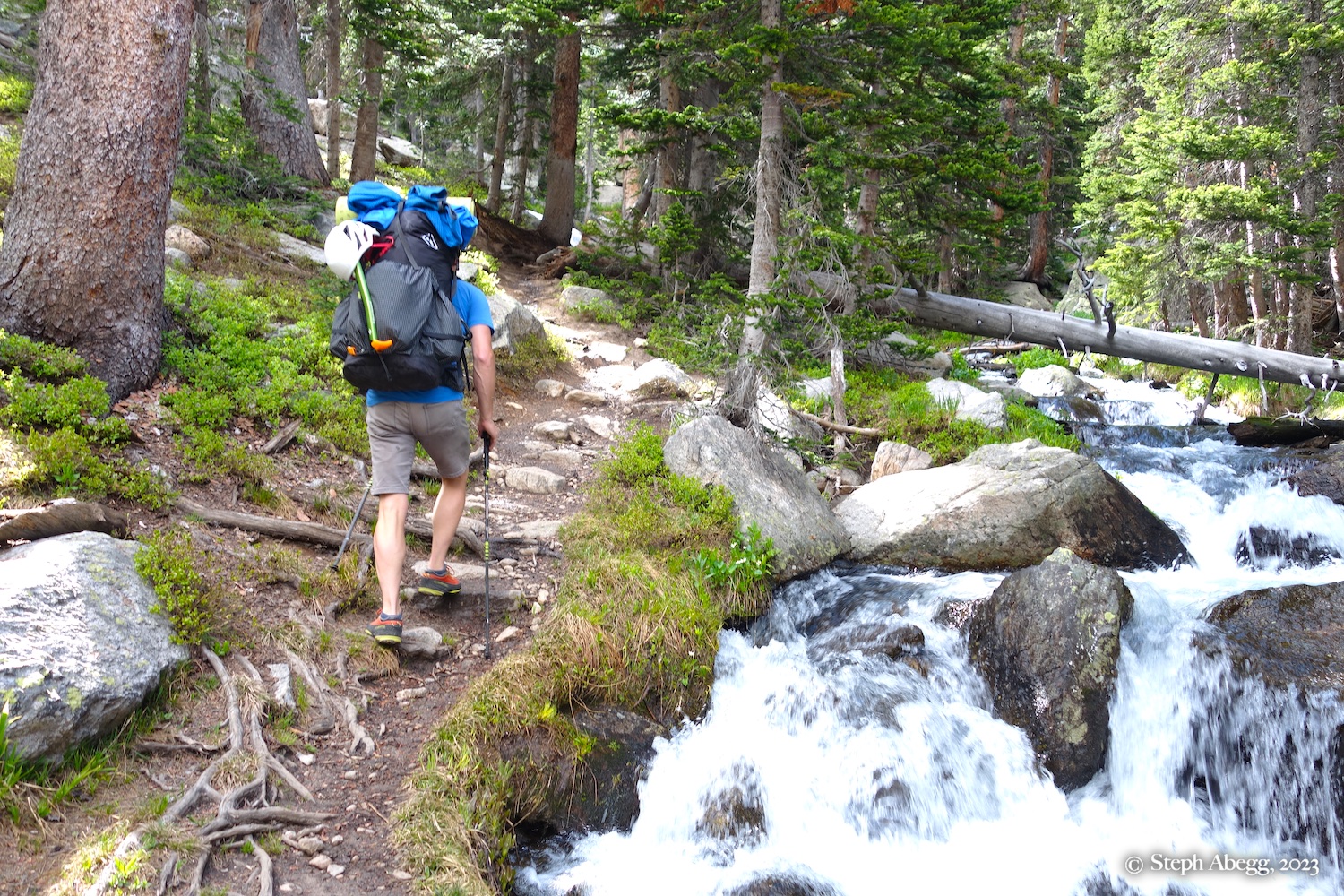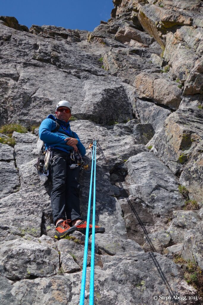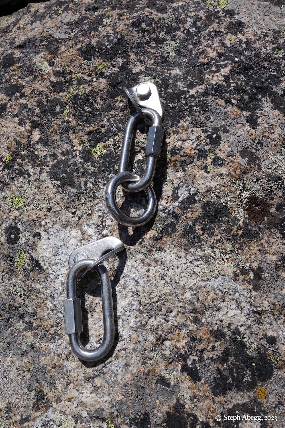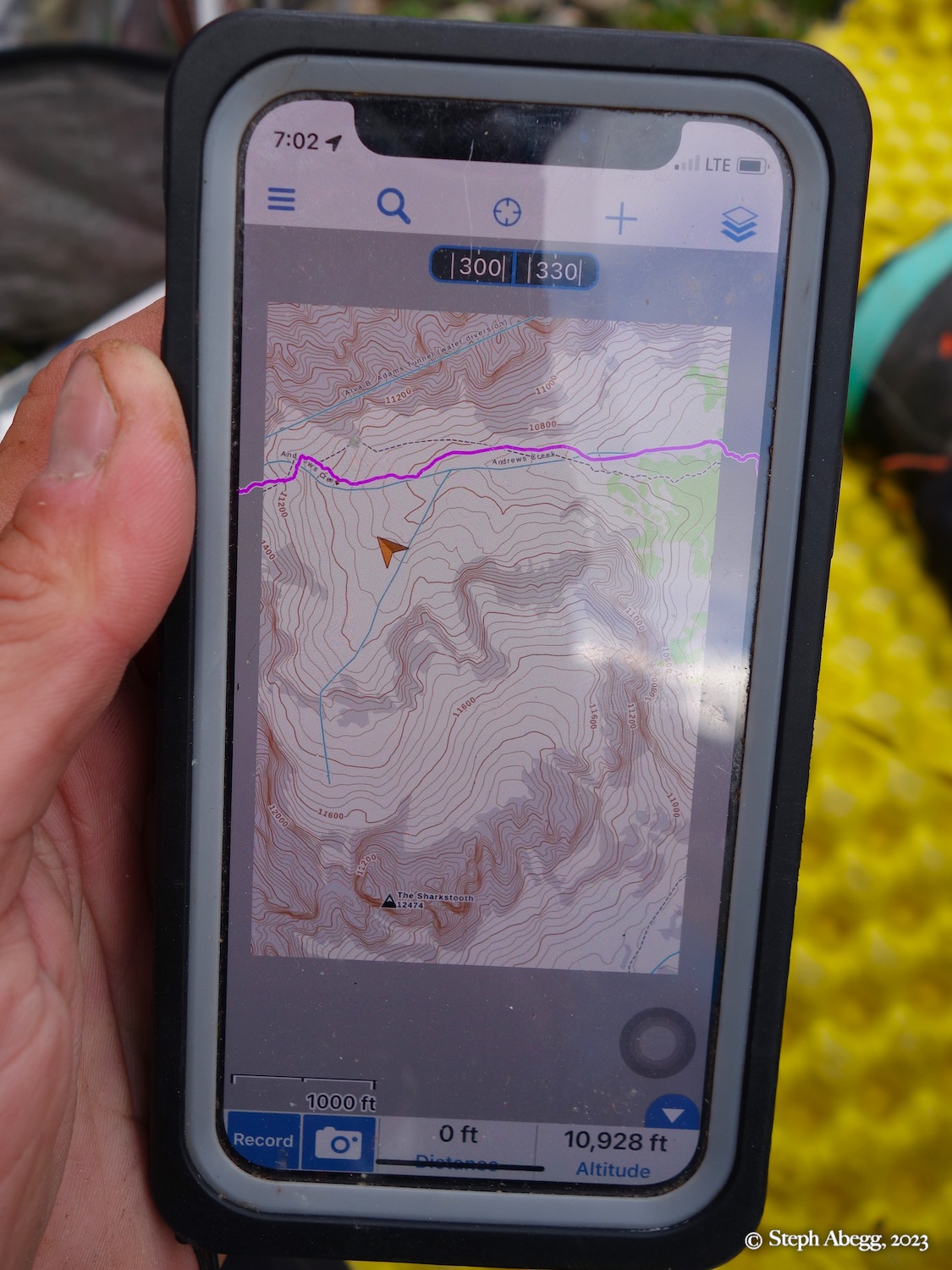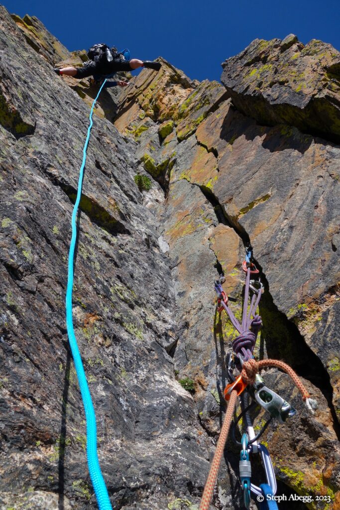 Approach from the Andrews Glacier Trail and The Gash. The Gash is a rugged valley of oversized talus on the "backside" of Cathedral Spires, about 0.7 miles up the Andrews Glacier Trail. The Gash provides access to the East Col, The Sharkstooth, West Col, and Northeast Spur of Taylor Peak. It also provides a safe (but long) return fromt he summits of The Foil, The Saber, and The Petit Grepon. A low cliff hand blocks access to the upper valley. Climb a narrow snow gully trough the middle of the cliff, or scramble up a series of big steps to the left. The valley splits above the cliff. The left branch heads to The Saber, the East Col, and the East Face of the Sharsktooth. The right branch leads to the West Col, West Fin of The Sharkstooth, and the Northeast Spur of Taylor Peak.