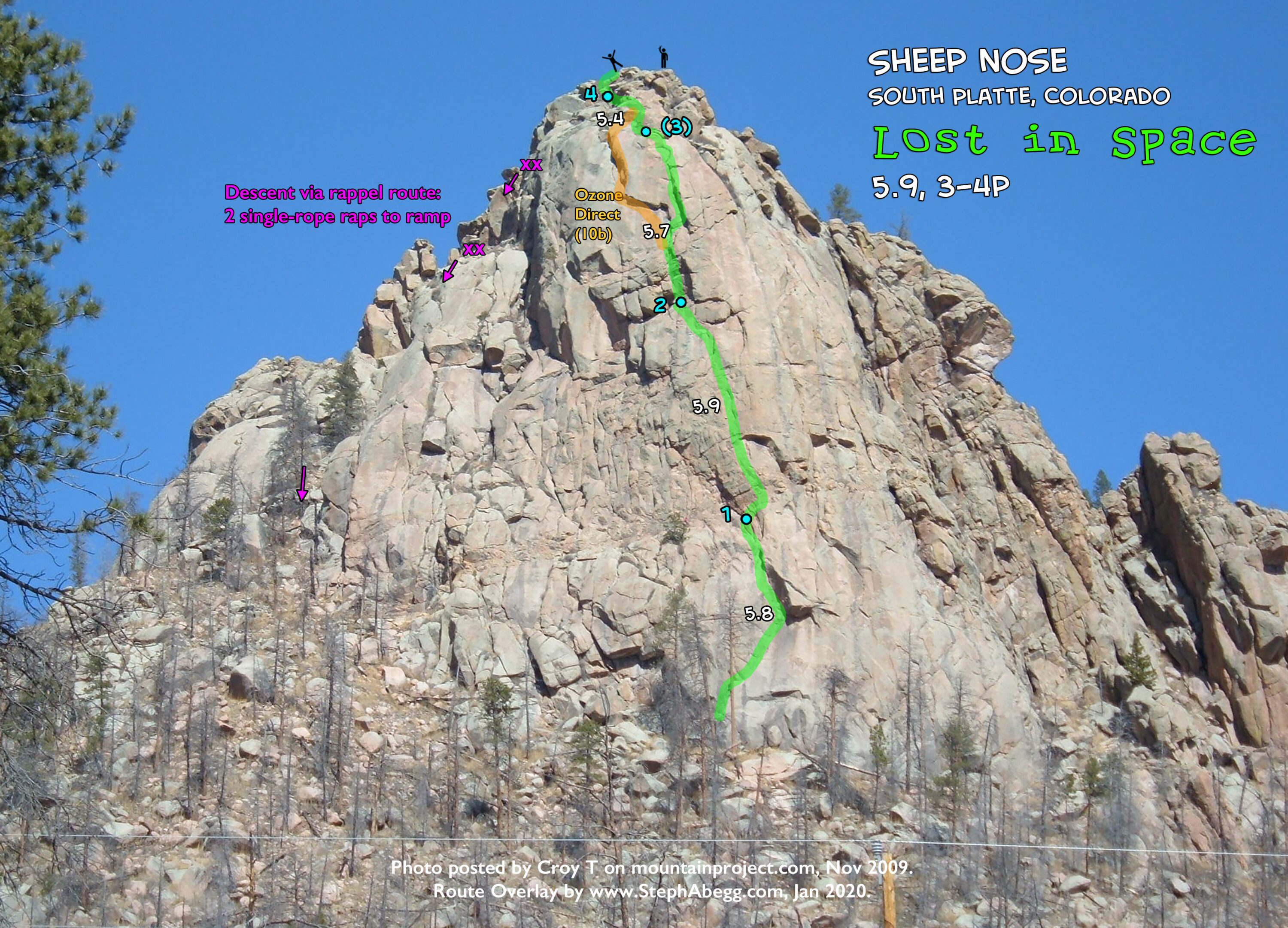 Park directly in front of Sheep Nose. Hike climbers' trail to base of southeast face. | |