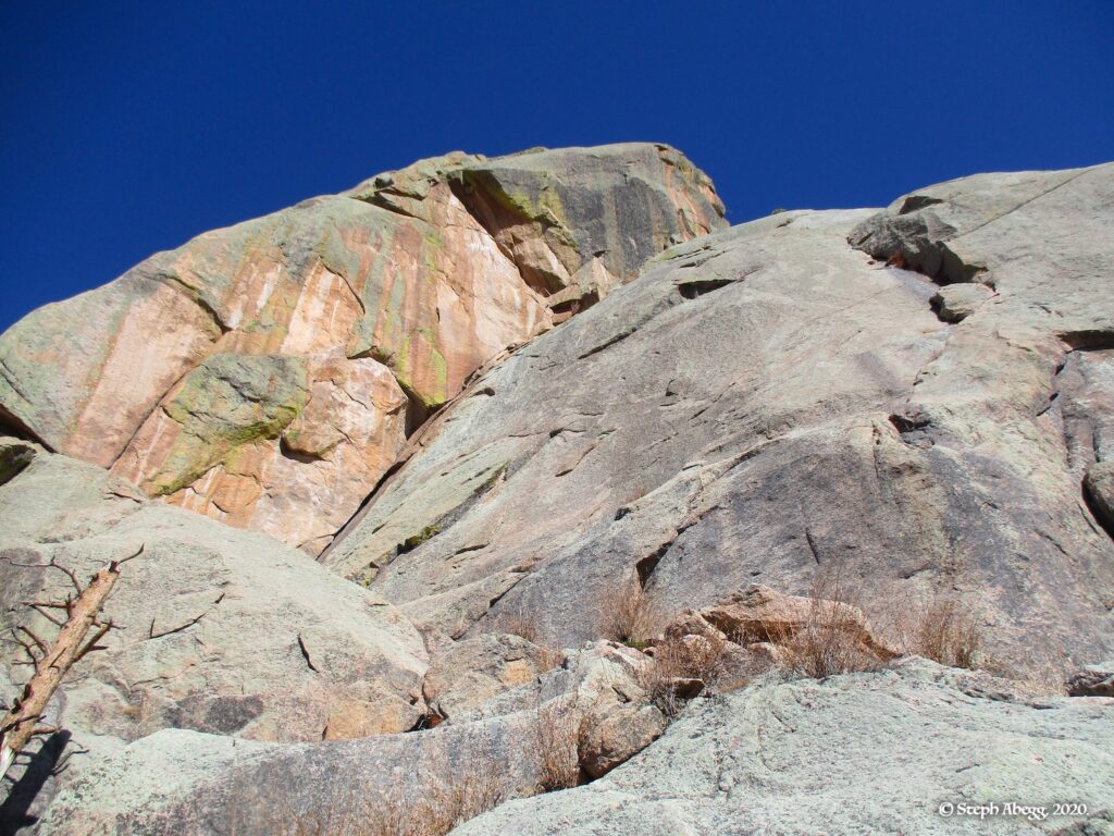 5.7. Head up the obvious chimney above the belay, make a few moves to the right, and follow the corner and crack system to another good belay ledge. Stop here or continue up Pitch 4 far enough to get past the 5th class. |