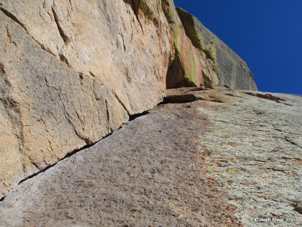 5.8. Climb the slabby, right-angling open book crack to the obvious left-facing dihedral, and climb up that to its end and a decent gear belay. | |