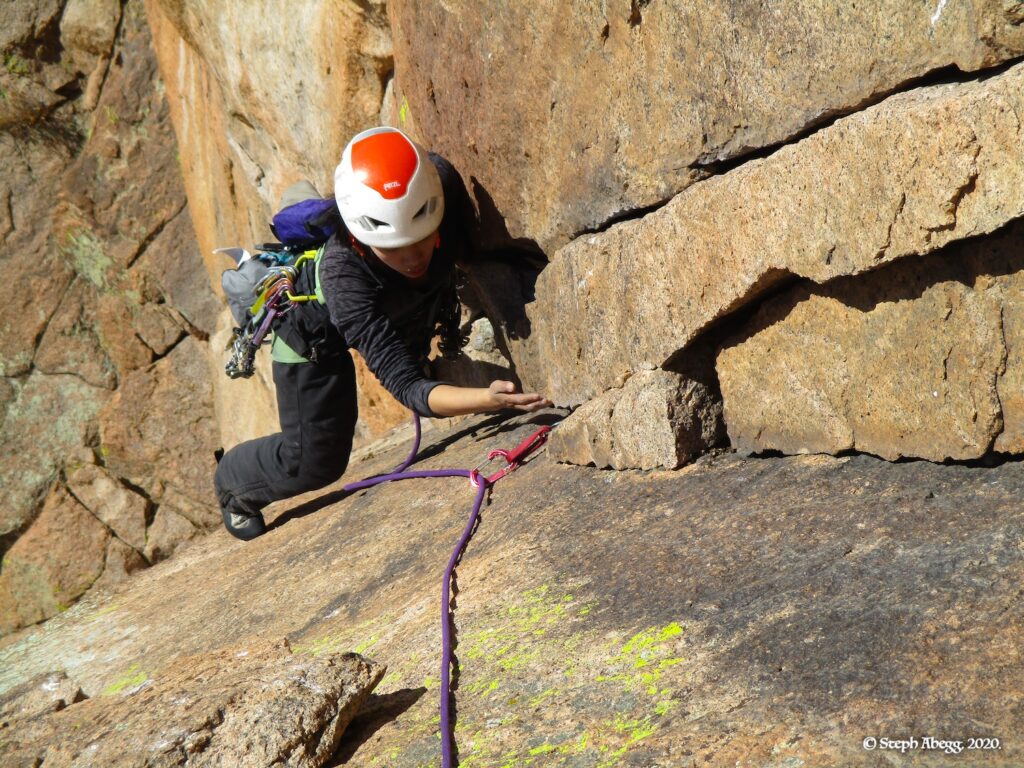 | 10. Natalie at the belay at the top of Pitch 2. The start of Pitch 3 is above her. 11. Start of Pitch 3. 12. Pitch 3 climbs the corner on the right. |
