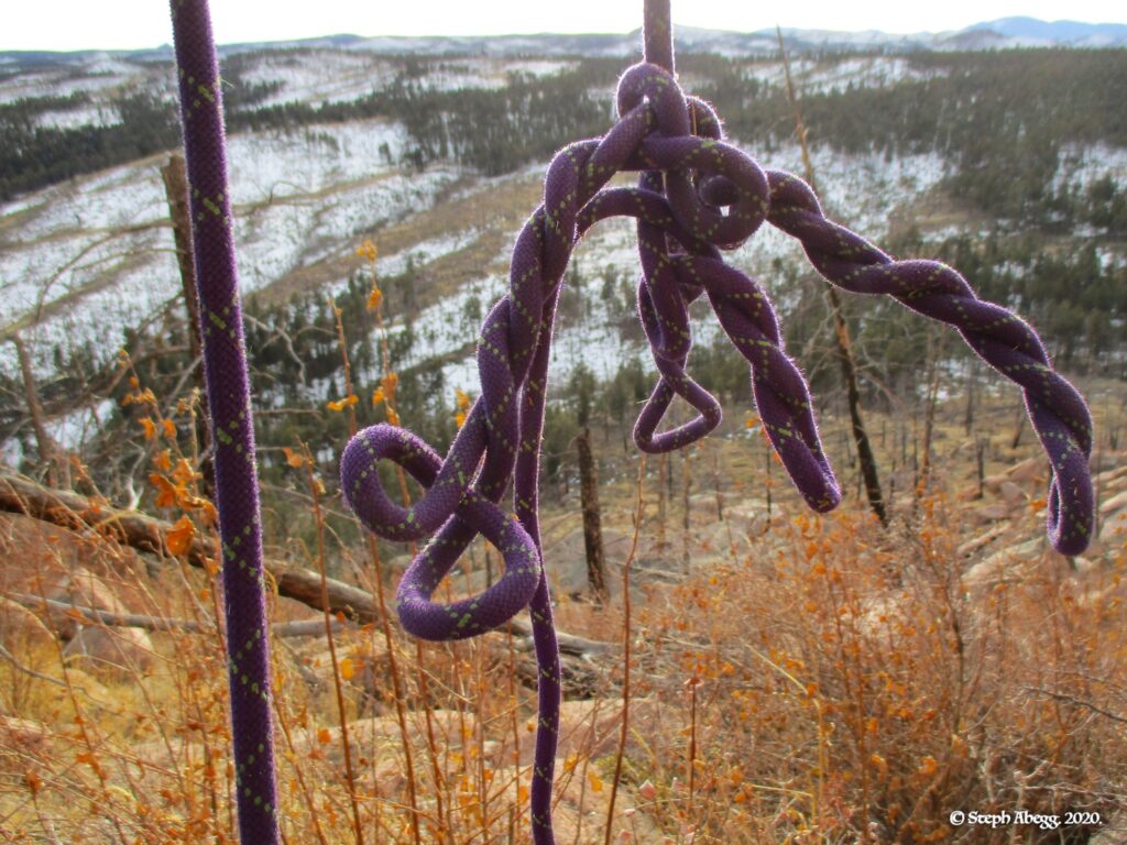 Two options: (1) Rappel. Walk a bit west and then SW and locate a pair of rap bolts.Two raps with a single rope lead you to a ramp. Hike down the ramp and curve around back to packs at base of route. (2) Walk off to the west. We did not go this way but it looked pretty mellow. A short rap might help negotiate a steep section near the base of the formation. |
