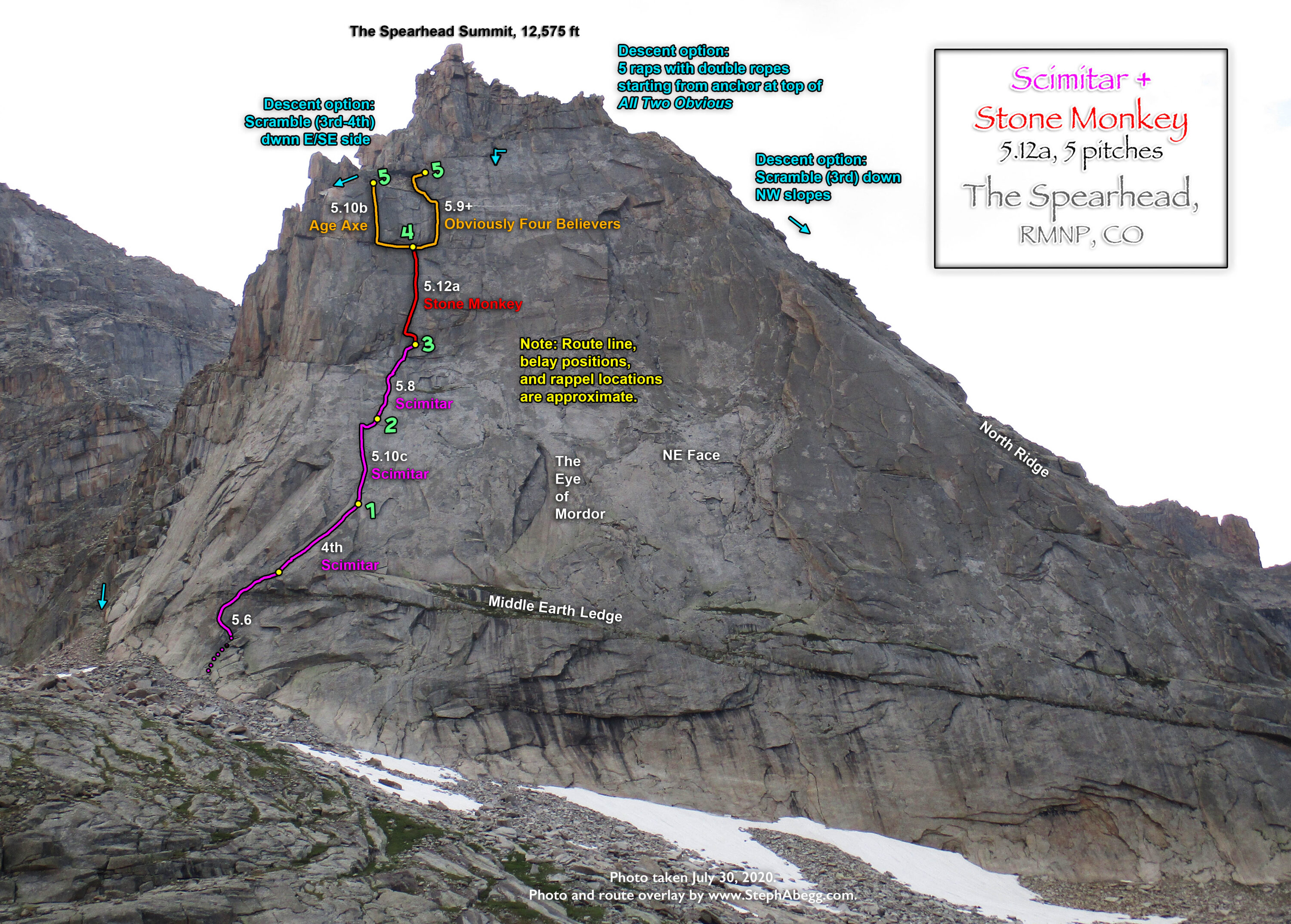 Stone Monkey refers to a single pitch high on the route. This pitch is one of the best single pitches on Spearhead. And also hard, at 12a. The route we took started with Scimitar (a 3-pitch route to the base of StoneMonkey), then climbed up the amazing one-pitch winder of Stone Monkey, and then finished with the last pitch of Obviously Four Believers. It is also possible to get to Stone Monkey via the first few pitches of Three Stoners and finish the climb via the last pitch of Age Axe.