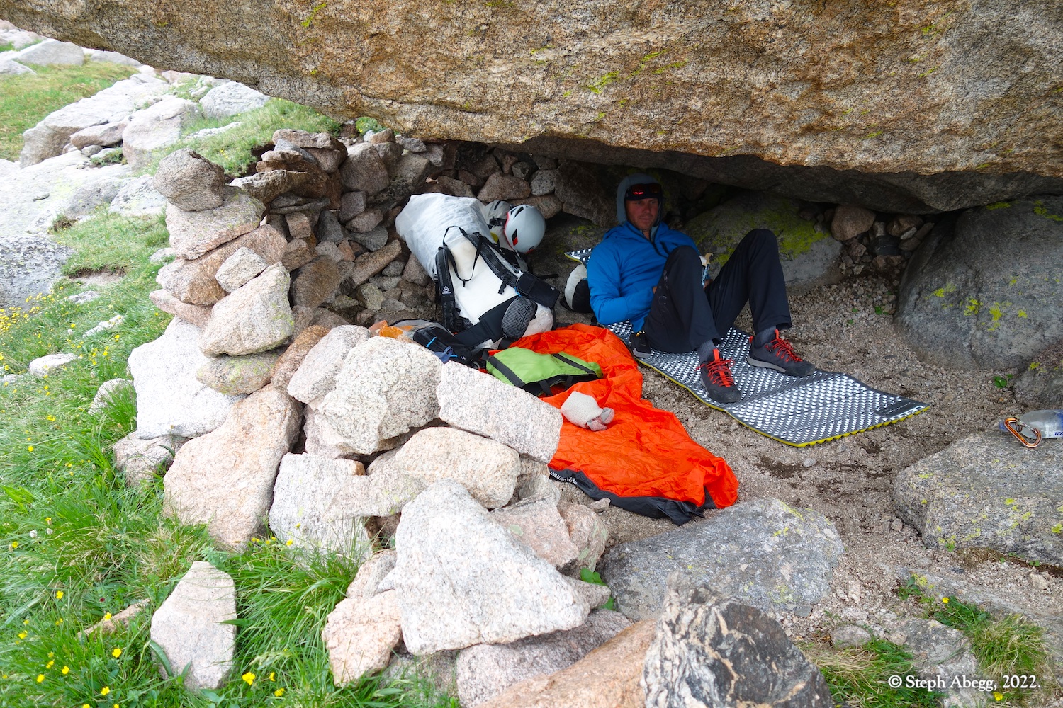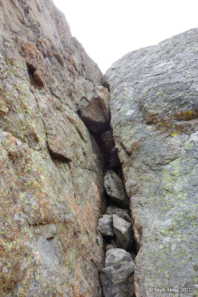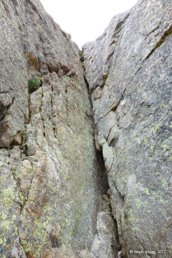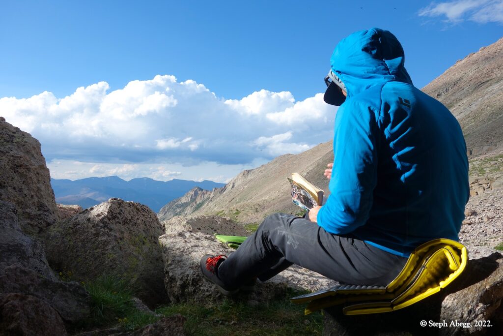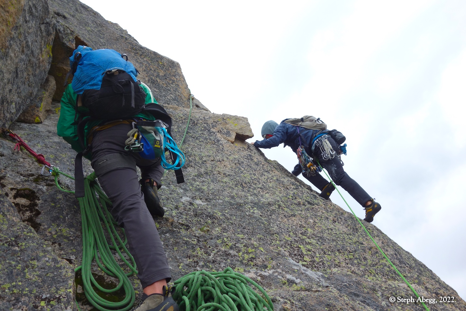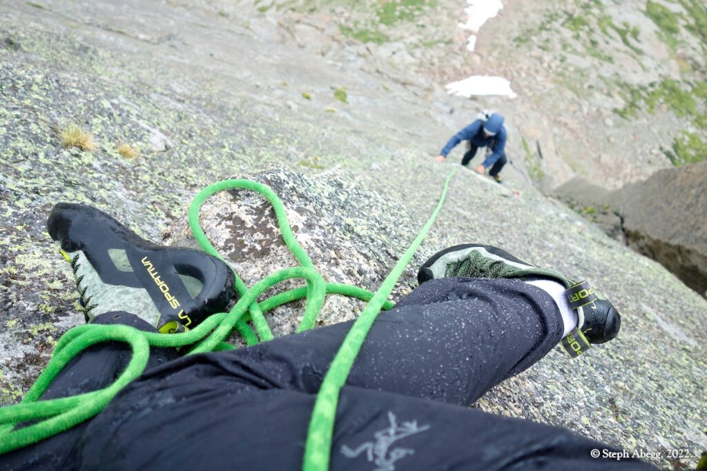 The forecast for Friday afternoon was for heavy rain. We felt we got lucky when we arrived at our bivy completely dry, the skies threatening rain but nothing materializing. But overnight the heavy rains arrived, and on Saturday morning the surrounding summits were shrouded in wet clouds. We opted for a lazy morning reading and drinking coffee. Mid-morning we seemed to be getting weather window, so we headed out to climb the