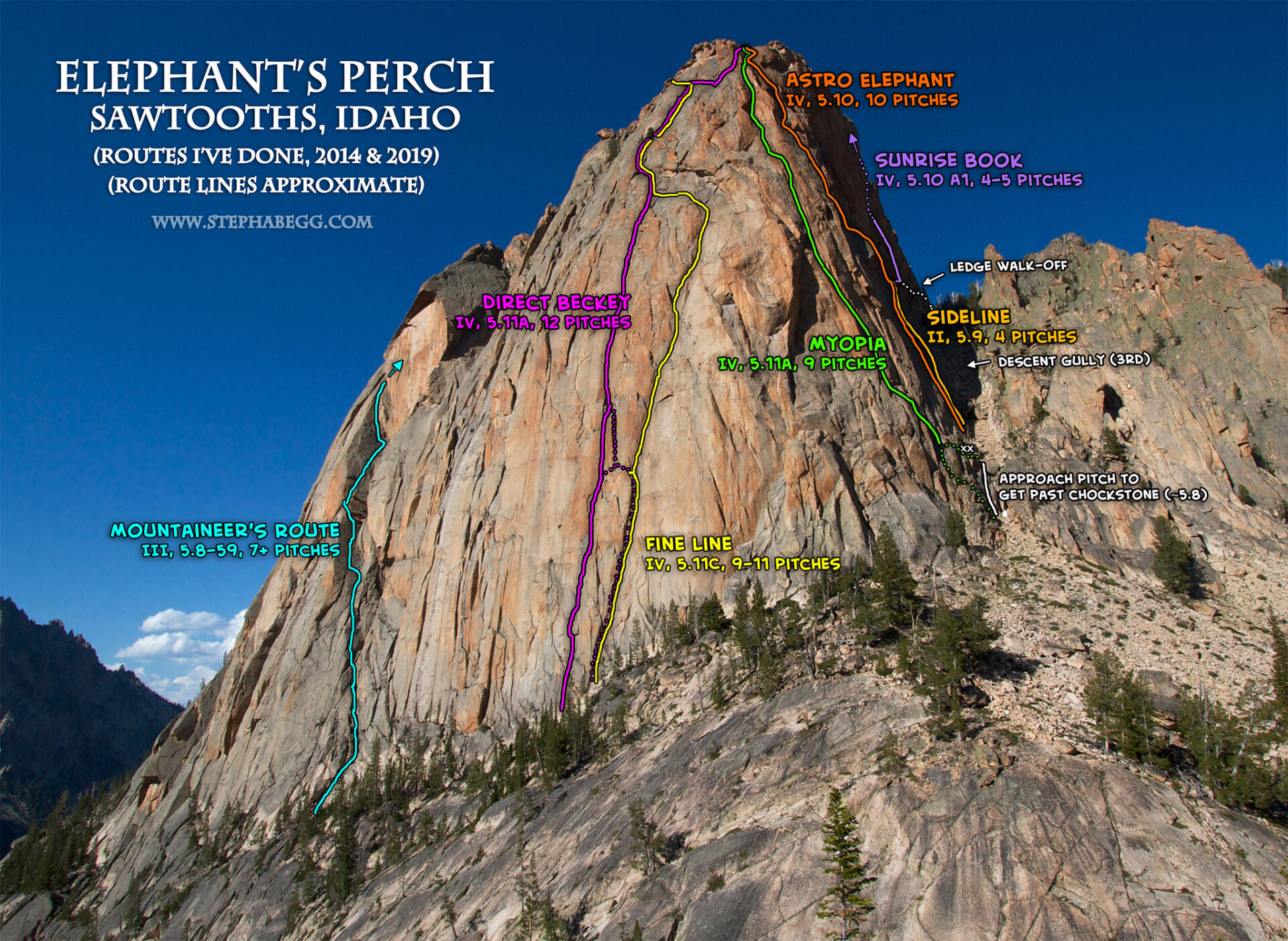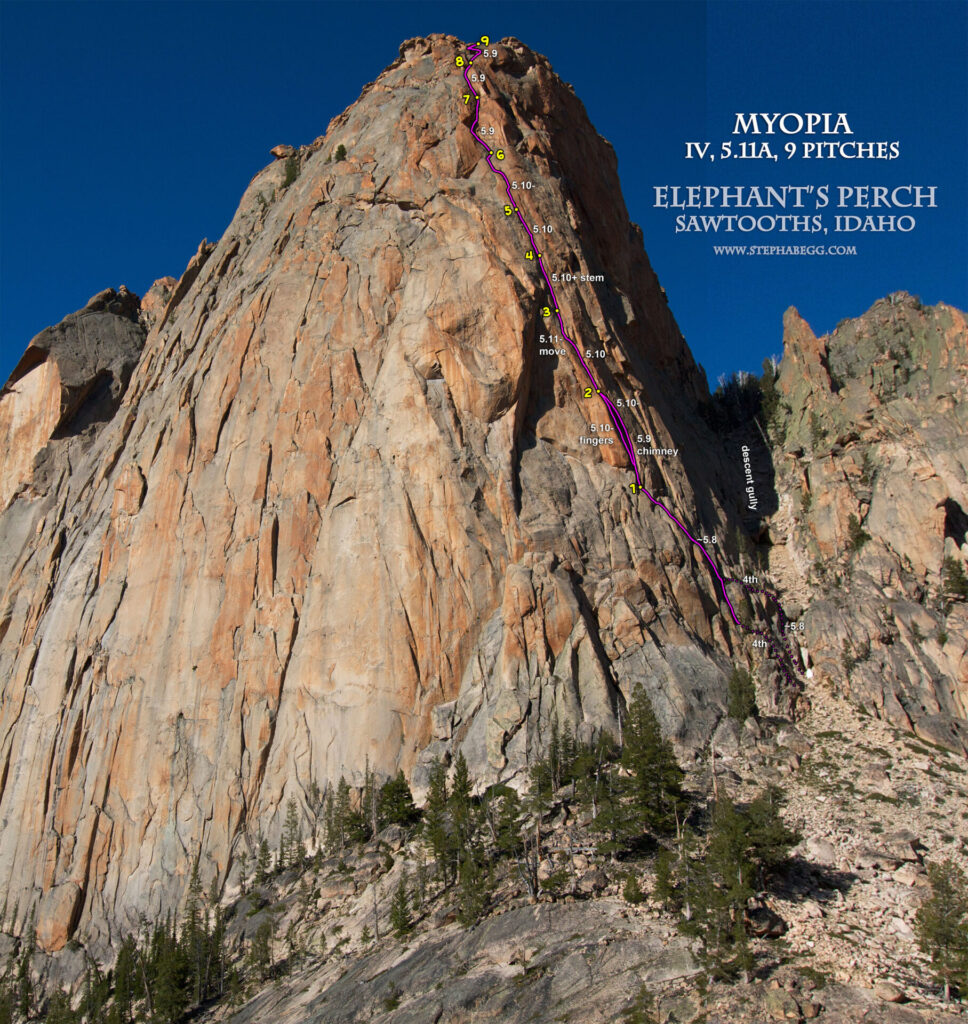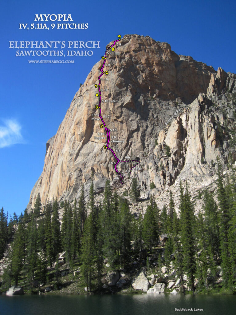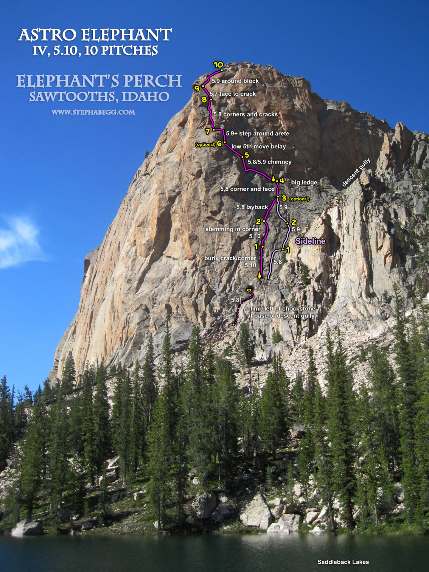 Scramble down the ridge to the northeast, and then down the loose 3rd class gully along the east (climbers' right) side of the Perch. Make a single rappel at the end of the gully to get past the chockstone. From there, only minutes back to camp. Make sure to jump in the lake to cap off the day. | |