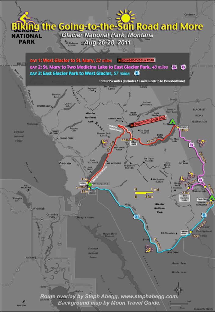 Long story short, next thing I knew my trusty red Subaru and I were headed to Montana, visions of biking Glacier National Park's famed "Going-to-the-Sun" Road dancing in my head. Bisecting the national park from west to east and crossing the Continental Divide, the 52 miles of the Going-to-the-Sun Road is one of the most scenic stretches of road in America. This road stands in the annals of lifetime routes for many bikers. A popular bike trip combines the Going-to-the-Sun Road into a three-day 142-mile loop tour of the park, including the Sun Road and Highways 89, 49, and 2 (see the map above for this loop).
