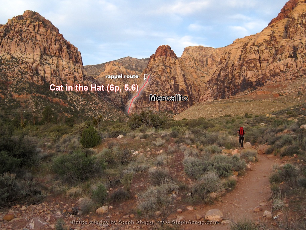 With two days of driving on either end, we had five days (Mon-Fri) to climb. The weather was hot and sunny on the first two days, but high winds and thundershowers caused us to bail off our climb on Wednesday. Good weather (albeit much cooler temperatures) returned for Thursday, but then rain settled back in on Friday. So even though the forecast wasn't perfect, we made good use of our three good days of weather, climbing three classic routes: Geronimo, Olive Oil, and Cat in the Hat. We also enjoyed an adventure to Las Vegas.