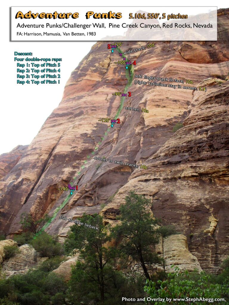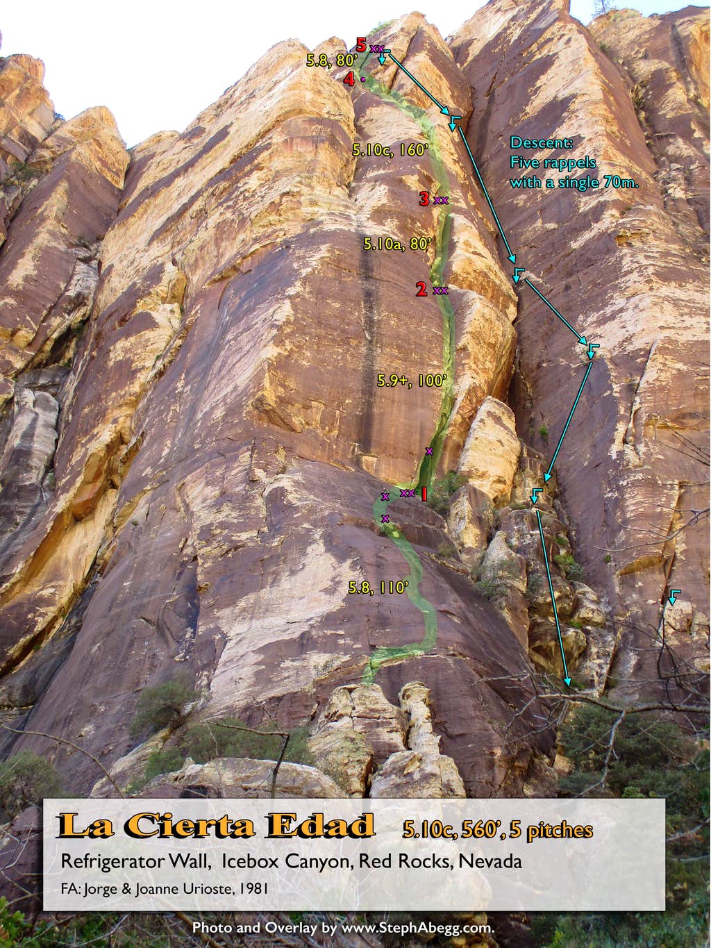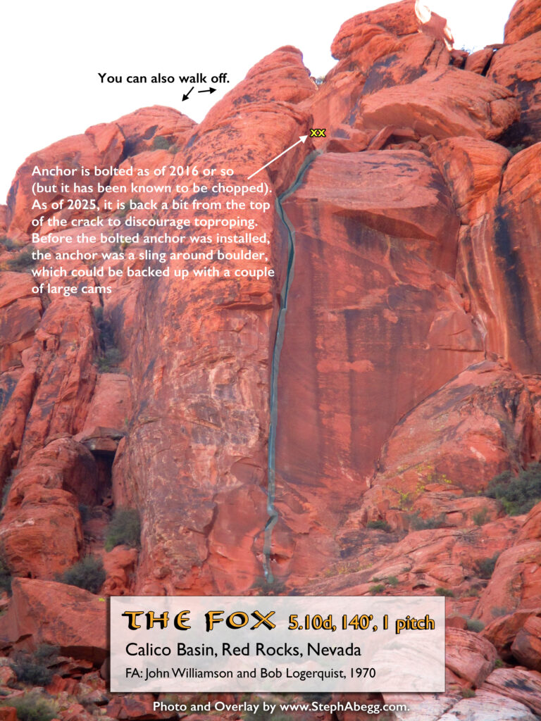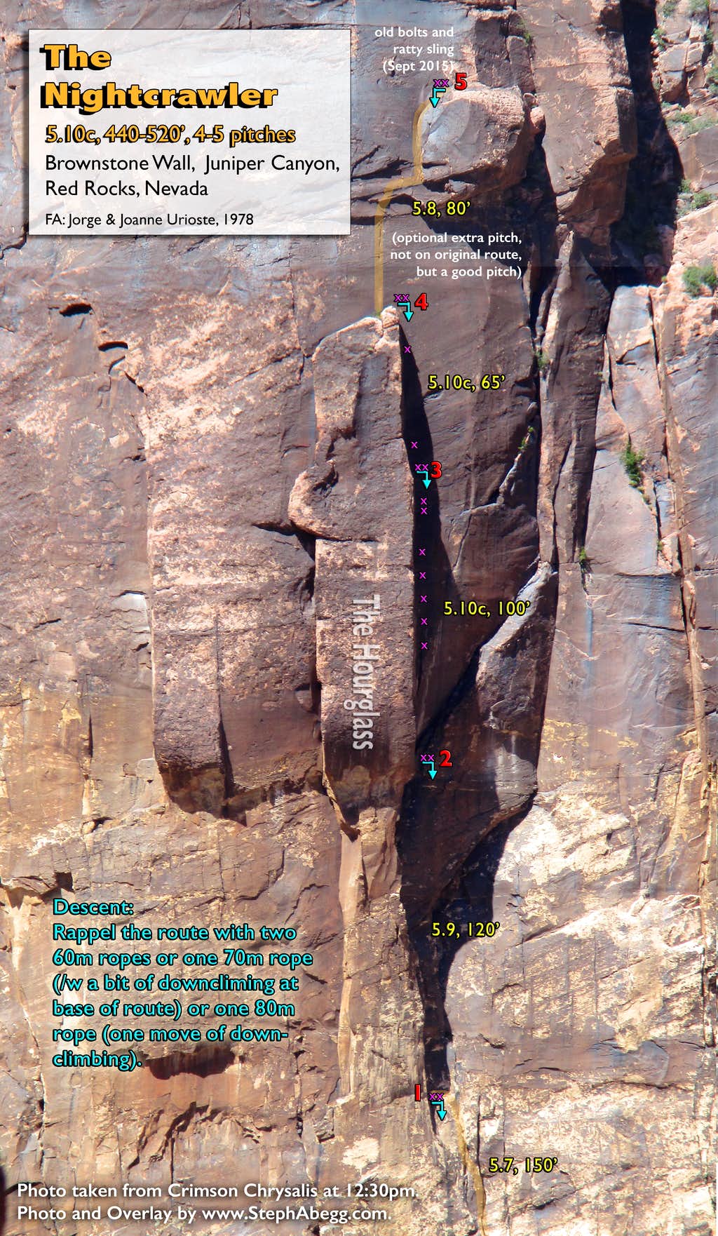 1. Brownstone Wall as seen on the approach. It took us 1h 15min from car to base of climb. Although it was just after 8am when we left the trailhead, it was already nearly 90° so it was a pretty hot approach. 2. Looking up at the route, which climbs the right side of the Hourglass formation. It was nice to see the corner already shaded by 9:30am. 3. Rico leading up Pitch 1 (5.7, 150'). This is a pretty easy pitch to the base of the corner system. But it was also a really warm pitch. 4. Rico doing a great job leading the chimney on Pitch 2 (5.9, 100'). He faced into the wall, but I faced out (toward Los Vegas). Take your pick. 5. The chimney on Pitch 2 can be protected surprisingly well with cams in the back of the flare. 6. "Face Los Vegas," was Jorge Urioste's advice to me as I left their place that morning (I had been staying with them for a few days). The chimney seemed pretty straightforward and I had lots of holds for my hands and feet, so it was great advice. 7. Looking up the second half of Pitch 2. This was really fun 5.9 climbing. 8. Looking up at Pitch 3 (5.10c, 100'). I found this pitch to be quite sustained at the grade. It definitely helps to have good stemming technique. 9. Looking down while leading Pitch 3. 10. Rico climbing up Pitch 3. What a pitch! 11. Rico on the final move of Pitch 3. 12. Looking up Pitch 4 (5.10c, 65'). This pitch is quite short but challenging. There is one section where the feet get a bit slippery and you have to commit to a layback on a couple of bomber finger locks for a few moves before getting in a piece of gear. Although this pitch was challenging, I found it a much easier lead than Pitch 3. 13. Rico starting off Pitch 5 (5.8, 80'). 14. Rico higher on Pitch 5, transitioning from the roof to the flaring groove. 15. Looking down from midway up Pitch 5 at the top of the Hourglass below. 16. The second half of Pitch 5, with Rico at the belay. 17. Rainbow Wall as seen from high on The Nightcrawler. This wall has several of Red Rocks longest aid routes. 18. Crimson Chrysalis / Cloud Tower as seen from high on The Nightcrawler. 19. Bolted anchor at the top of Pitch 1 (Sept 2015). 20. Bolted anchor at the top of Pitch 2 (Sept 2015). 21. Bolted anchor at the top of Pitch 3 (Sept 2015). 22. Bolted anchor at the top of Pitch 4 (Sept 2015). 23. Bolted anchor at the top of Pitch 5 (Sept 2015). This one needs a backup. 24. Original Urioste ("JU") bolt near the top of Pitch 3. A newer bolt has been installed just above it. 25. Rico nearing the end of the rope on the last rappel. We had an 80m rope, so only had to downclimb one move. A 70m rope would leave you downclimbing more low 5th terrain. 26. Pretty rock. Red Rocks is full of 'em. |